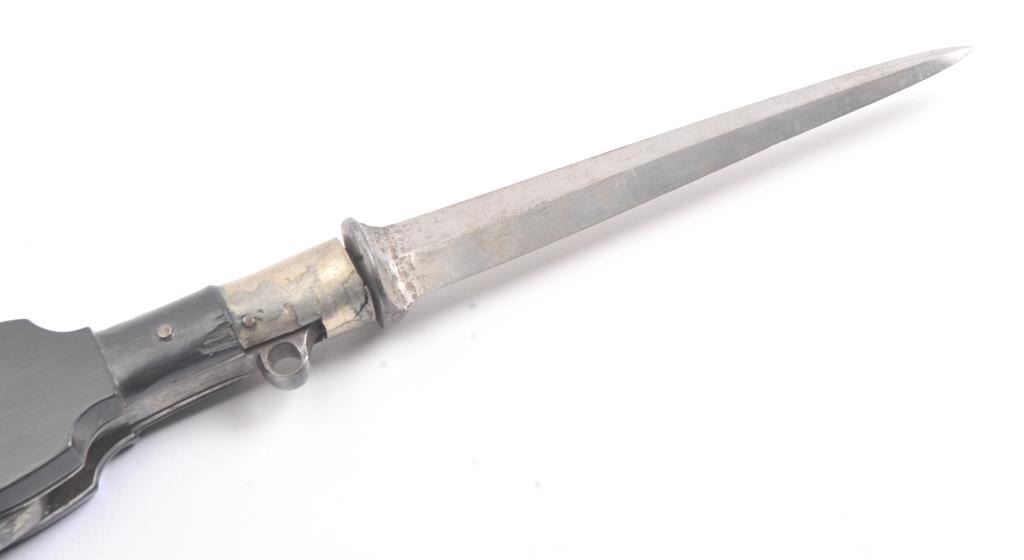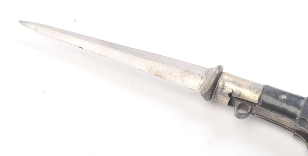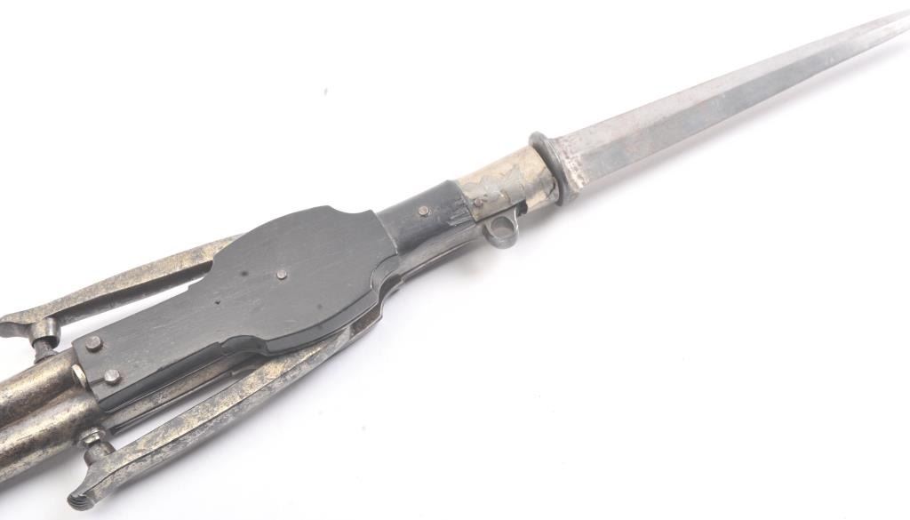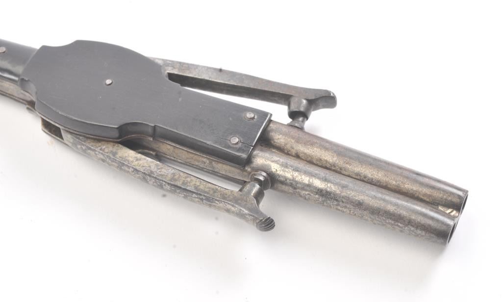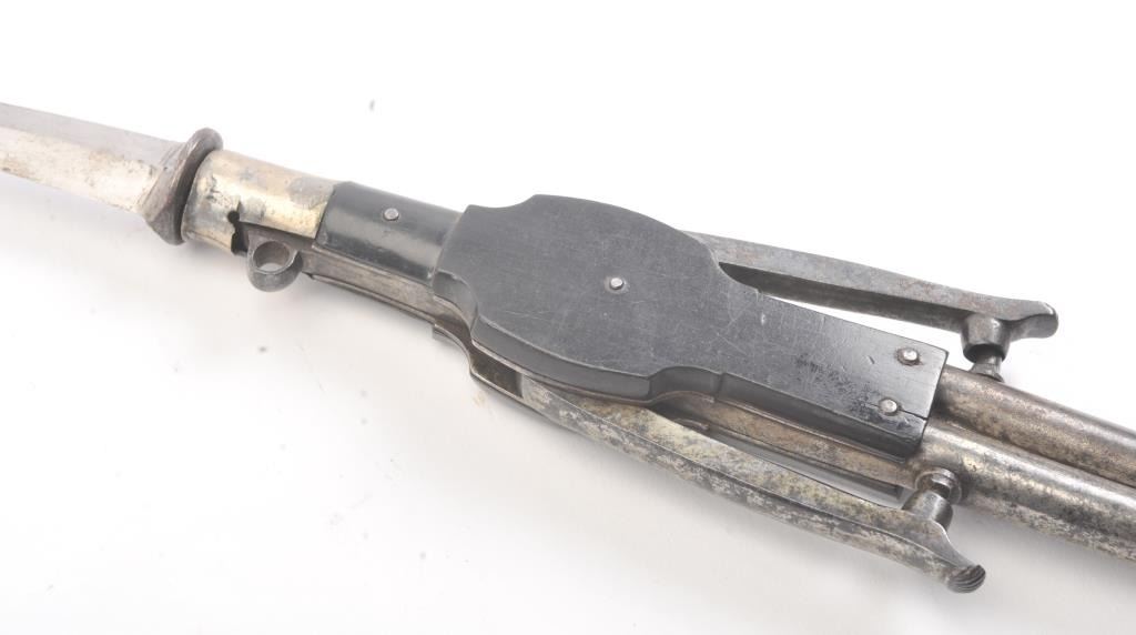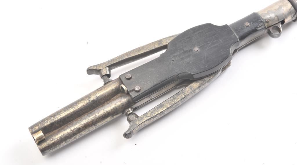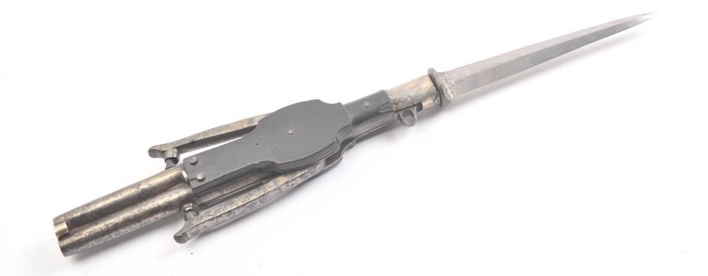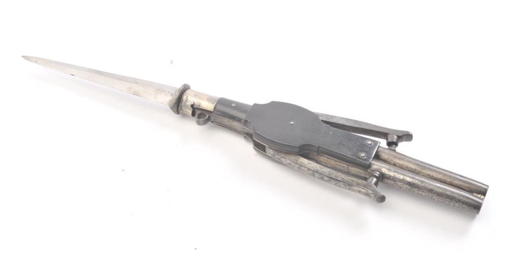 Percussion over and under double barreled knife pistol. 14 1/2" overall, 3" barrels of .40 caliber smooth bore. ramrod is missing. Black horn scales. Repair to the ferrel that holds the knife. A rare and possiblyunique "Chuck" Grimes collection of oddity arms. (Antique) Est. $1,000-2,000