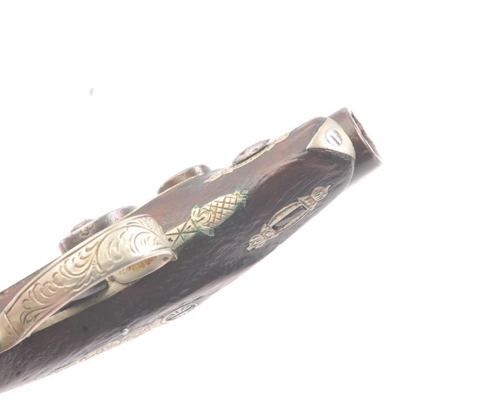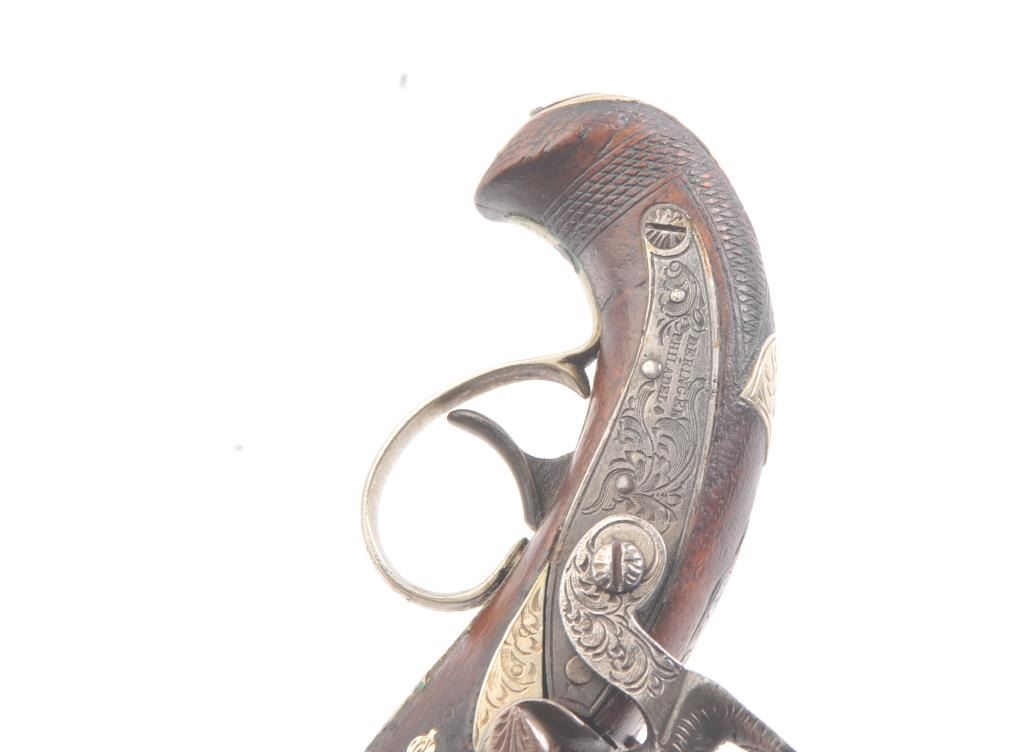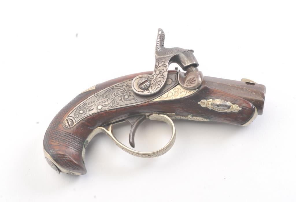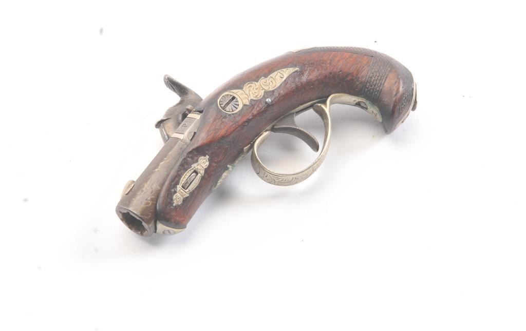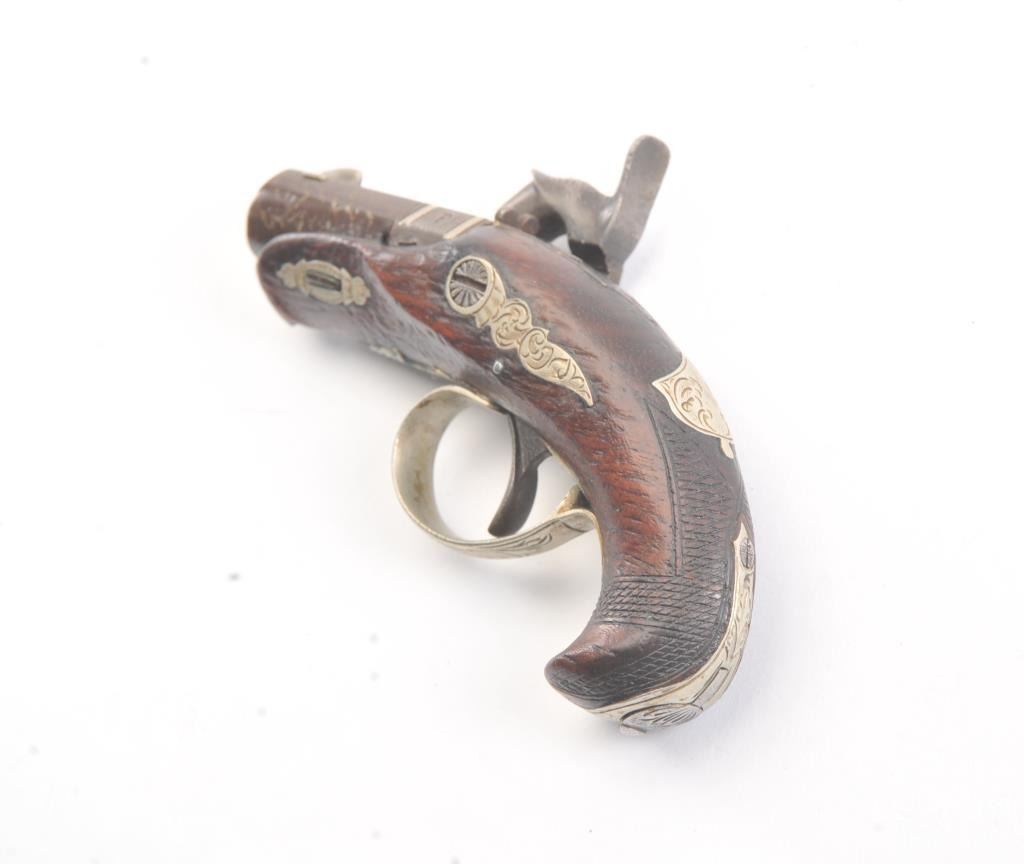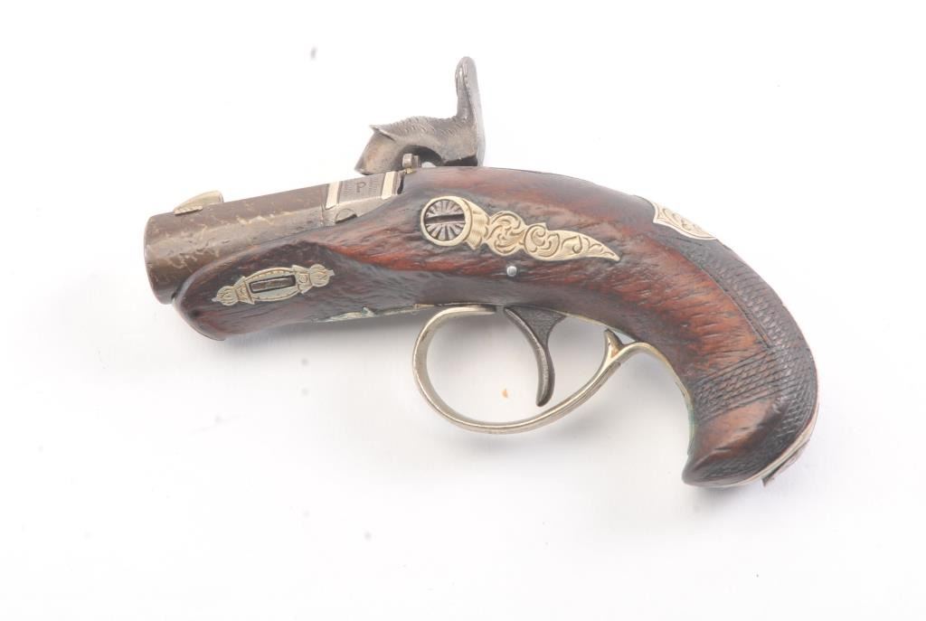 Deringer percussion pistol with "N. Curry & Bros San Francisco" agents marking. Measures 4 1/4" overall with a 1 1/2" barrel of approximately .40 caliber 7 groove rifled. Engraved German silver mounts with cap box in butt. 50%-70% brown and striping on the barrel. The wood shows opening and minor wear from carry but good overall. Well-marked and by Henry Deringer himself. (Antique) Est.: $1250-$2500