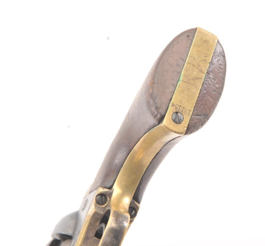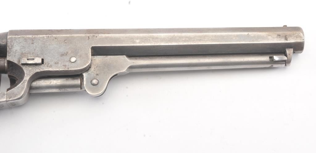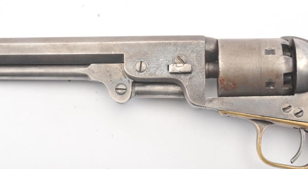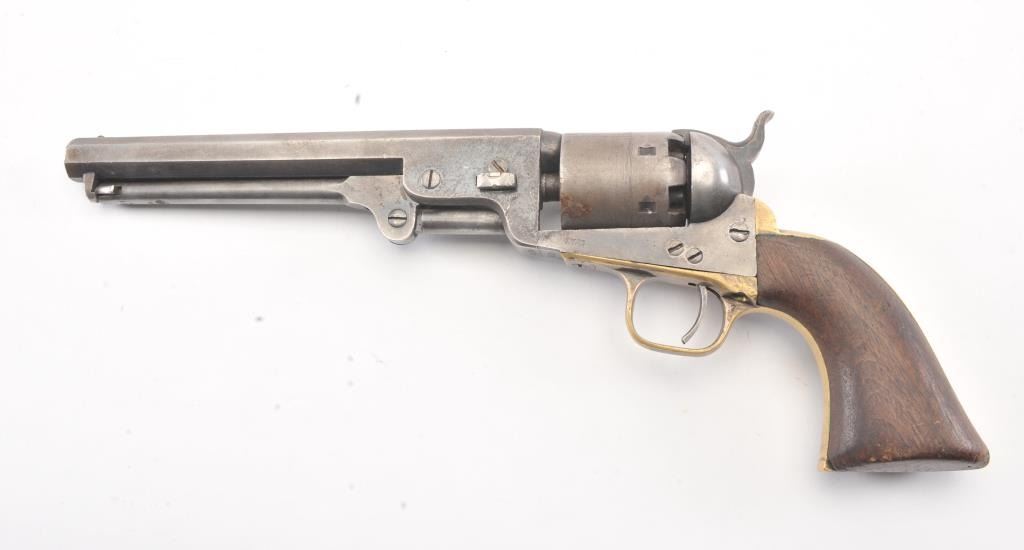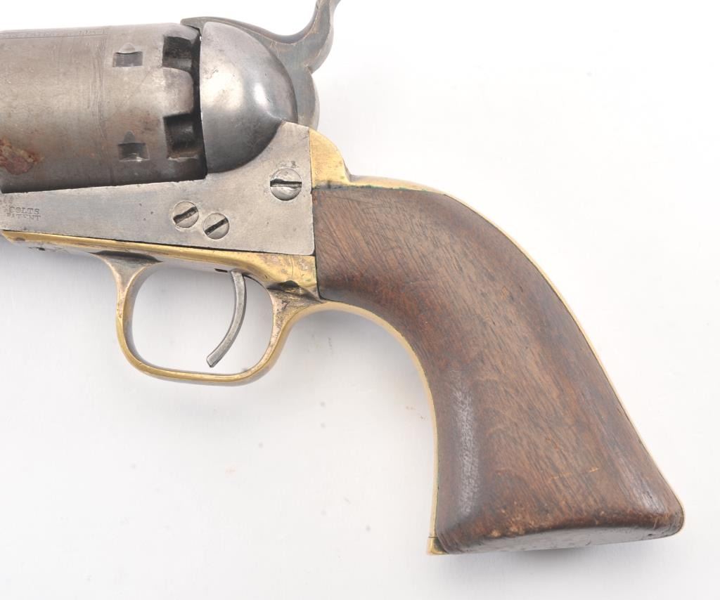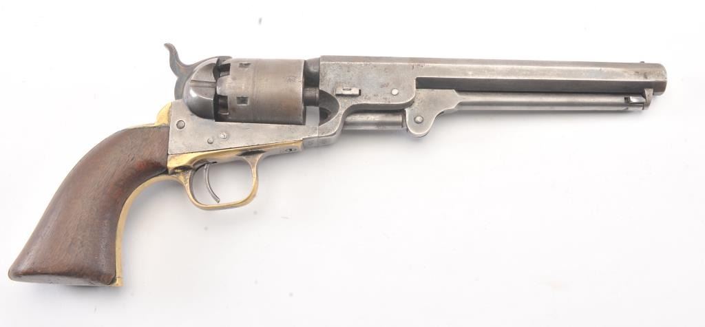 Colt 1851 Navy Revolver 4th Model with capping groove, S/N 131154. Good to very good condition with 30%-50% original blue and strong traces of case colors. 15%-30% scene remaining but light. All matching visibleserial numbers. The grips are good with small losses and normal wear. The hammer is an excellent (Weiss) old replacement. "K.K." scratched in butt during period of use. Good action. A 7 on a 1-10 scale. (Antique) Est.:$1000-$2000