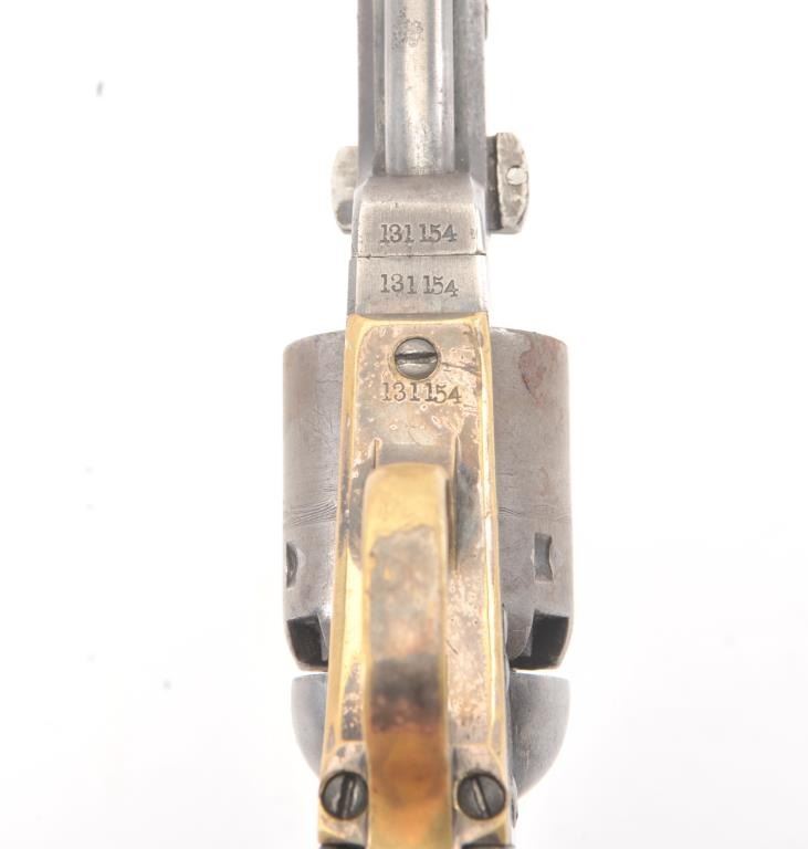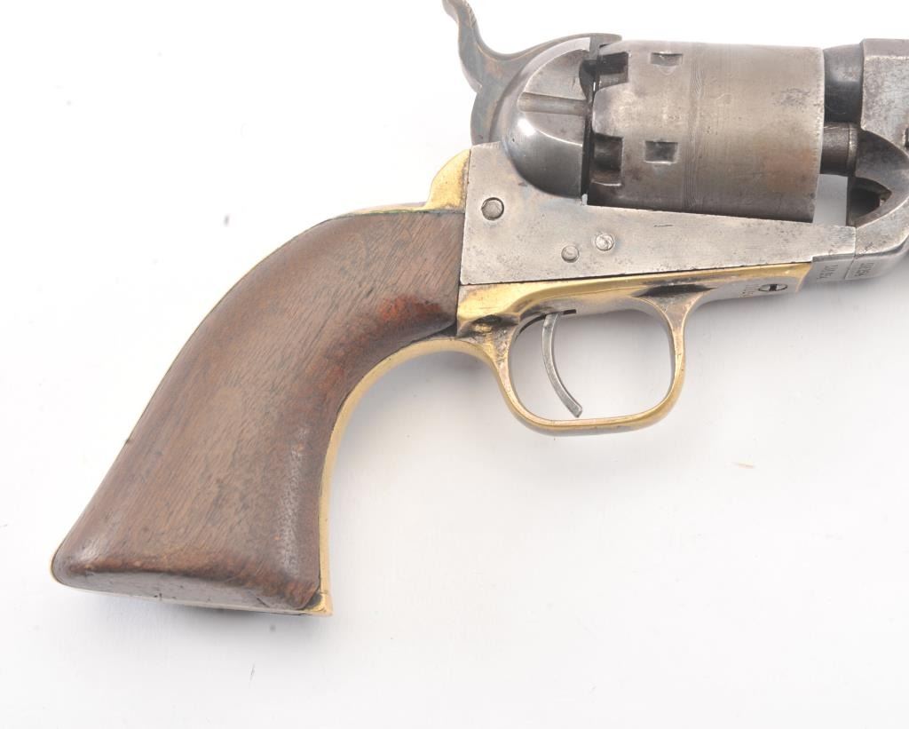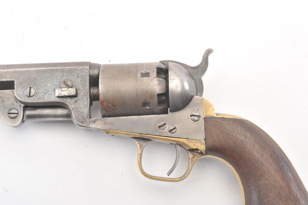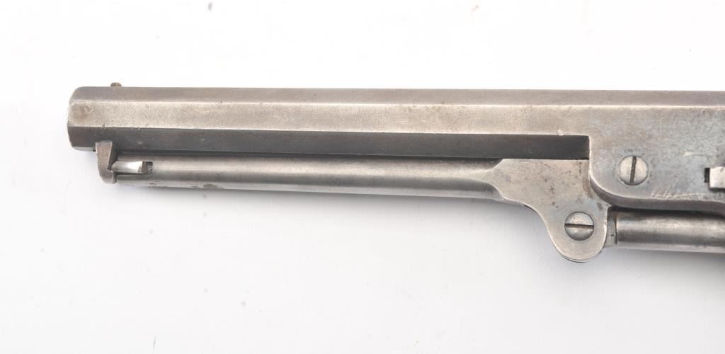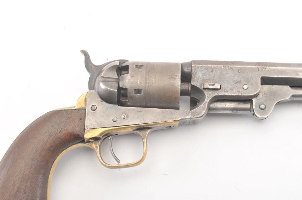 Colt 1851 Navy Revolver 4th Model with capping groove, S/N 131154. Good to very good condition with 30%-50% original blue and strong traces of case colors. 15%-30% scene remaining but light. All matching visibleserial numbers. The grips are good with small losses and normal wear. The hammer is an excellent (Weiss) old replacement. "K.K." scratched in butt during period of use. Good action. A 7 on a 1-10 scale. (Antique) Est.:$1000-$2000