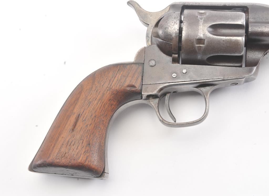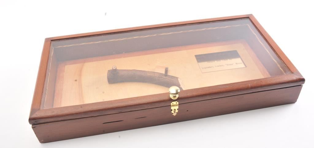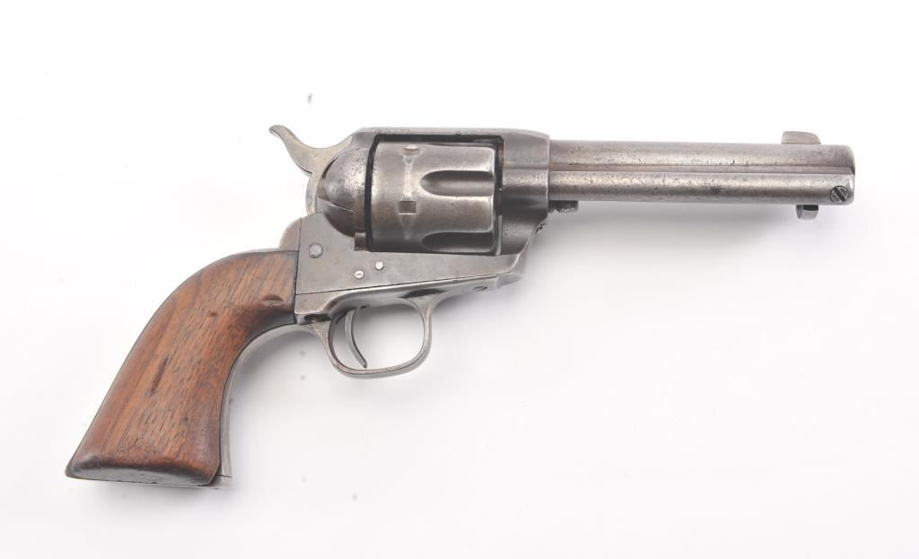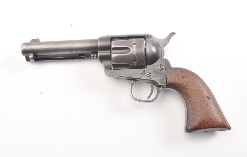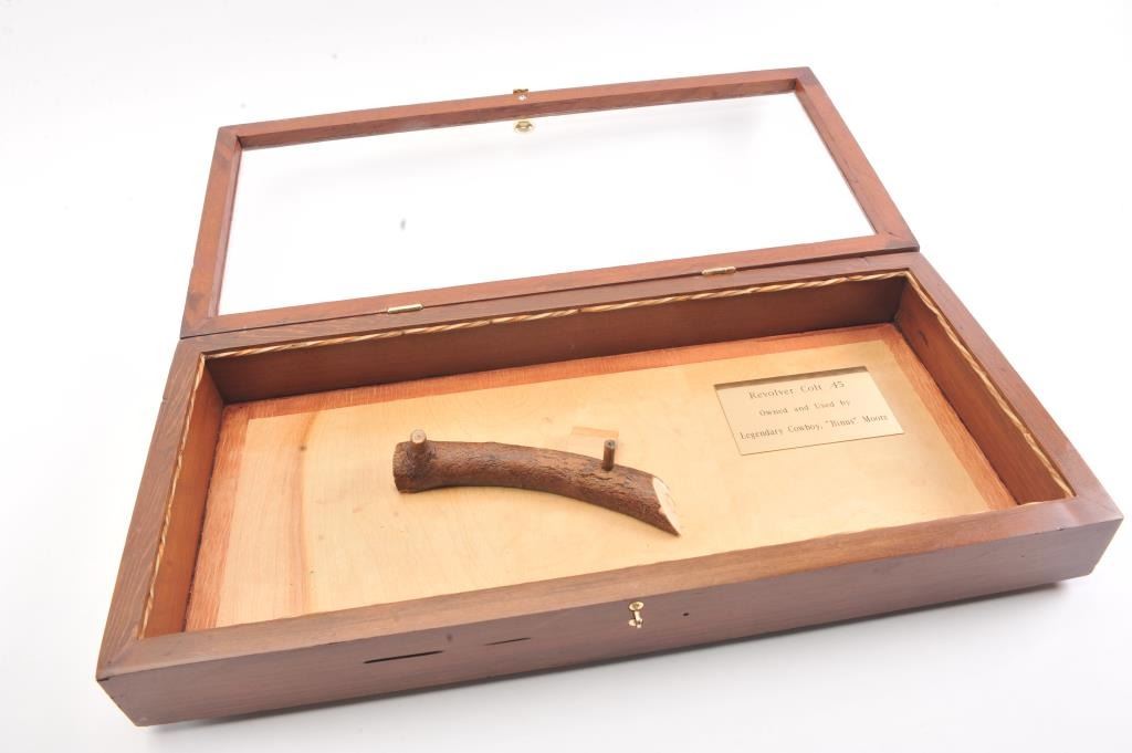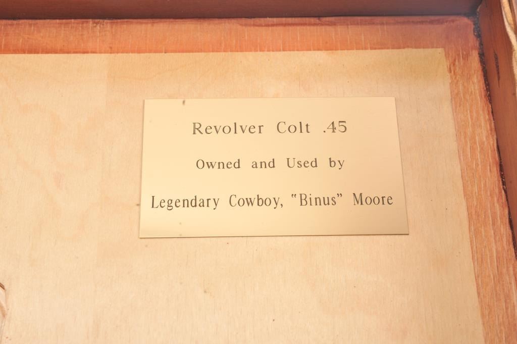 Colt SA Army revolver, .44-40 caliber, Serial #76091. The black powder frame pistol is in very good overall condition 4 ¾” barrel with a trimmed front sight. The pistol has gone to an overall grey/brown patina with mars,surface erosion, holster wear at the right side of the muzzle and an index line on the cylinder. The pistol is marked .44 CAL on the trigger guard with crisp patent dates and all matching visible serial numbers. Thesmooth wood grips are in good condition showing moderate to heavy use with the metal slightly proud at the butt. Additionally, the lot includes a custom glass front wood display case measuring 24” x 11 ½” made bythe grandson of Binus Moore of Oklahoma, prior owner of the pistol. The box has an inscribed plate marked, “Owned and Used by Legendary Cowboy “Binus” Moore”. The pistol was purchased by the consignor from thegrandson in the early 2000’s at which time the grandson was in his eighties. A statement of facts will be provided the purchaser. The bore is fair and the action functions well with all four clicks. Est.: