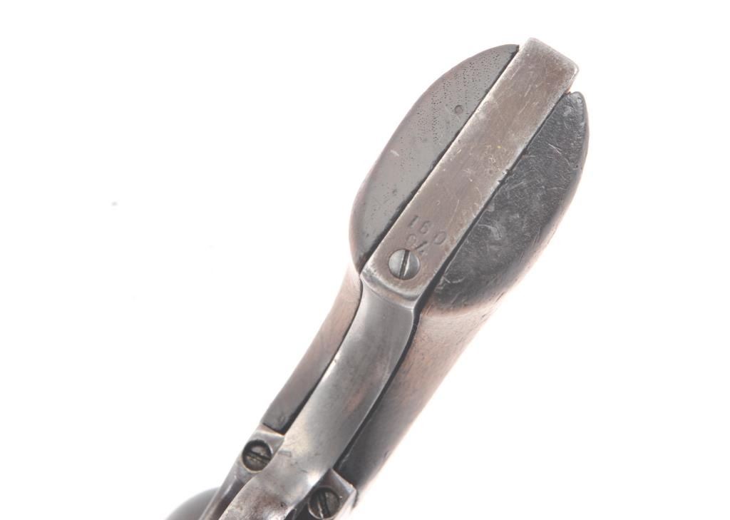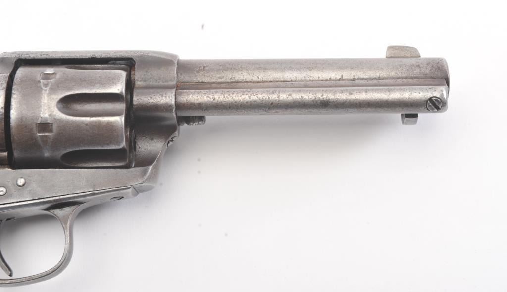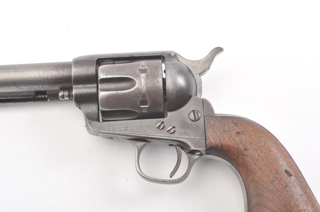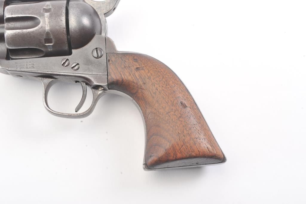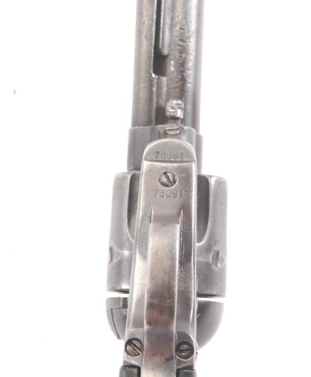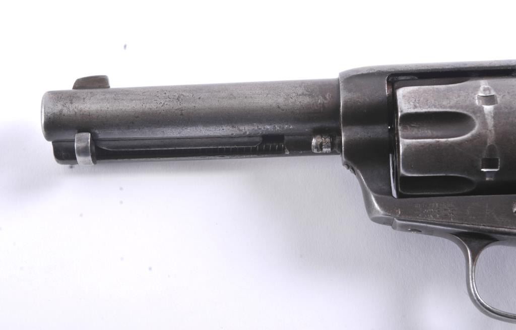 Colt SA Army revolver, .44-40 caliber, Serial #76091. The black powder frame pistol is in very good overall condition 4 ¾” barrel with a trimmed front sight. The pistol has gone to an overall grey/brown patina with mars,surface erosion, holster wear at the right side of the muzzle and an index line on the cylinder. The pistol is marked .44 CAL on the trigger guard with crisp patent dates and all matching visible serial numbers. Thesmooth wood grips are in good condition showing moderate to heavy use with the metal slightly proud at the butt. Additionally, the lot includes a custom glass front wood display case measuring 24” x 11 ½” made bythe grandson of Binus Moore of Oklahoma, prior owner of the pistol. The box has an inscribed plate marked, “Owned and Used by Legendary Cowboy “Binus” Moore”. The pistol was purchased by the consignor from thegrandson in the early 2000’s at which time the grandson was in his eighties. A statement of facts will be provided the purchaser. The bore is fair and the action functions well with all four clicks. Est.: