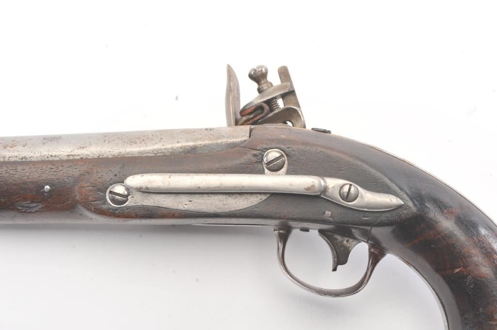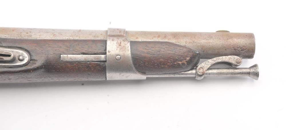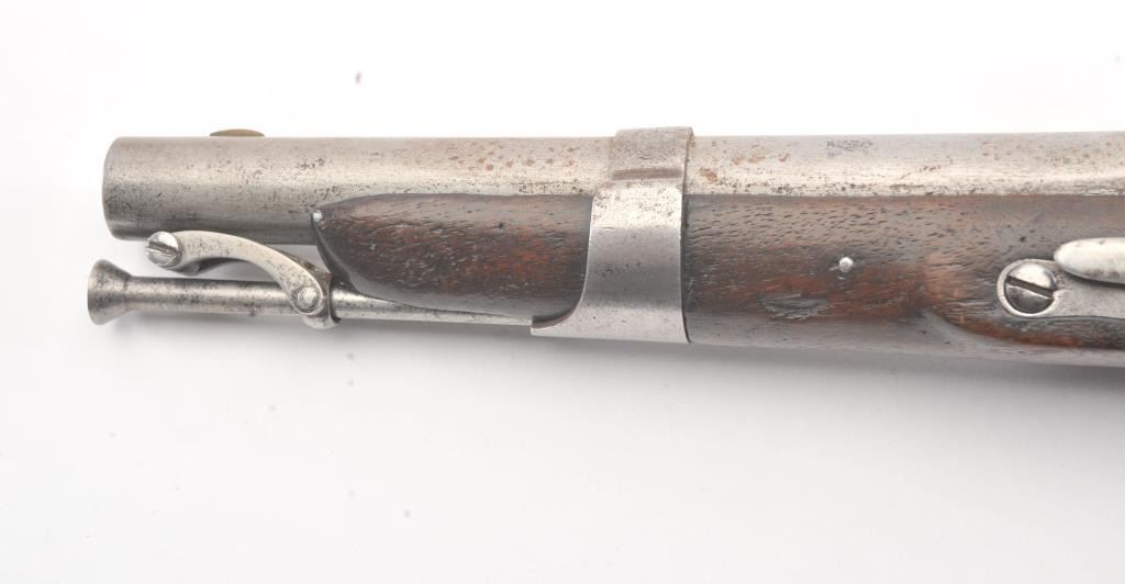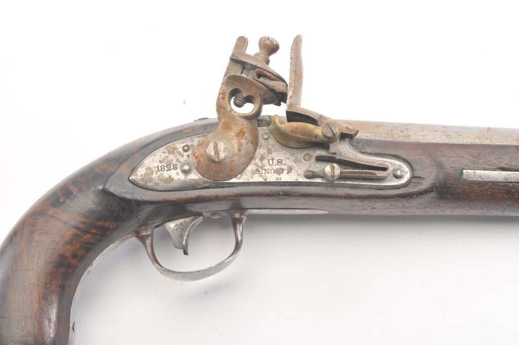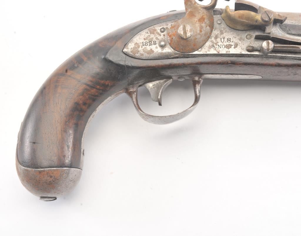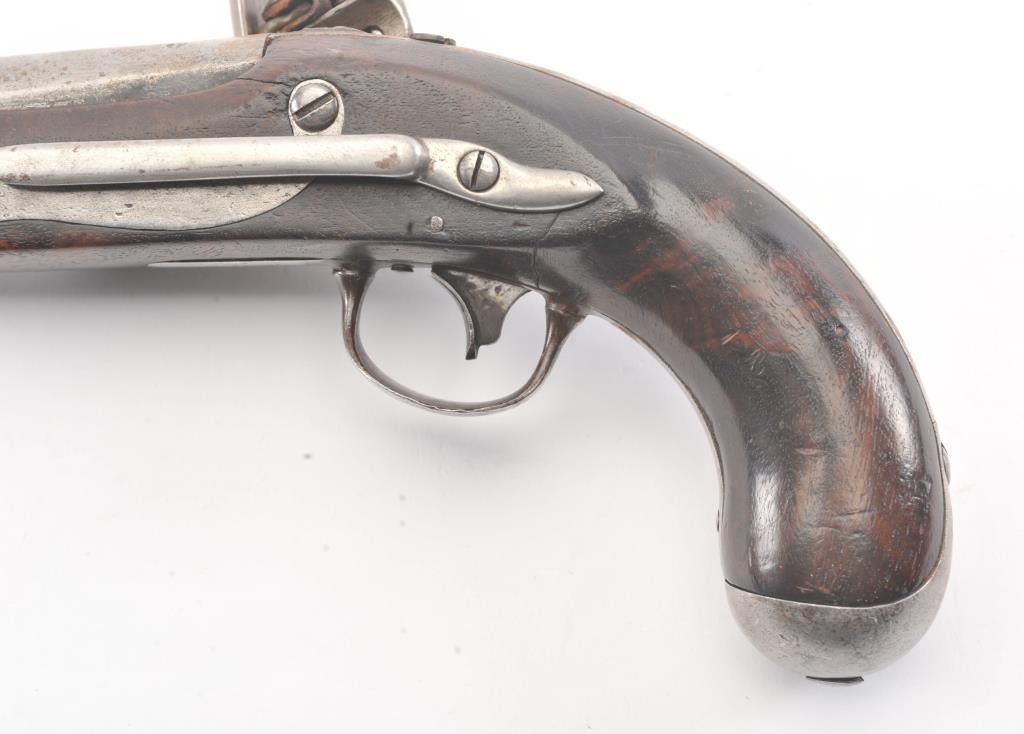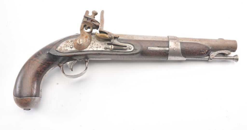 U.S. Model 1826 Martial issue flintlock navy by S. North dated 1828 on the lock. All features as standard on this issue showing reconversion to the flintlock and restorations. The reconversion is very goodand the belt hook is also restored. Some fresh rust and erosion that would clean from poor storage. The stock is good with light cleaning and refreshing. Good lock markings but not distinguishable barrel marks orproofs. Several experts have argued this is an original flintlock but we believe it’s a top reconversion by a master gunsmith. (Antique) Est.: $1500-$3000