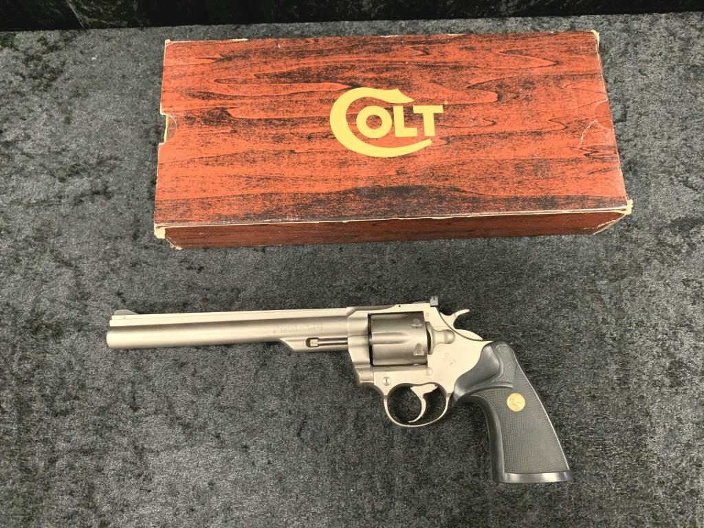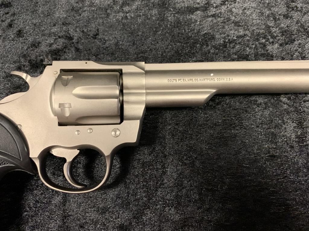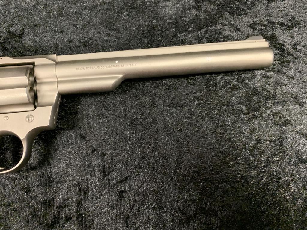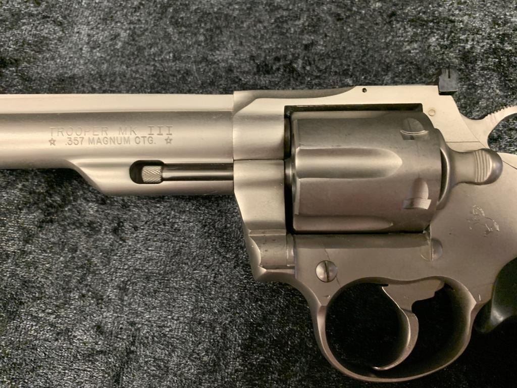 Colt Trooper MKIII Double Action Revolver in .357 with a 8" barrel, electrical nickel finish, and medallion Pachmayr type neoprene grip, S/N 70197L. Matching end label with features and finish noted. Excellent to mintin box. 99% to new. Est.: $700-$1400