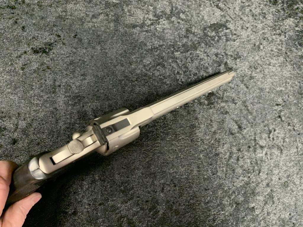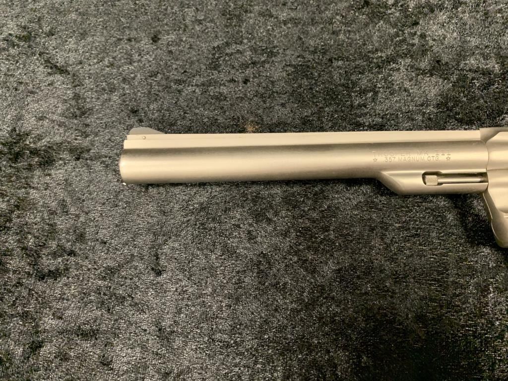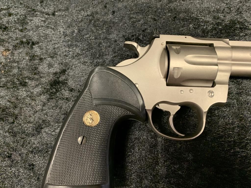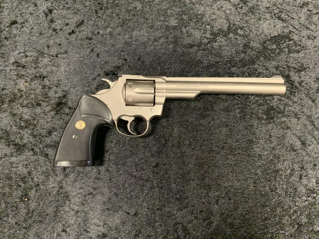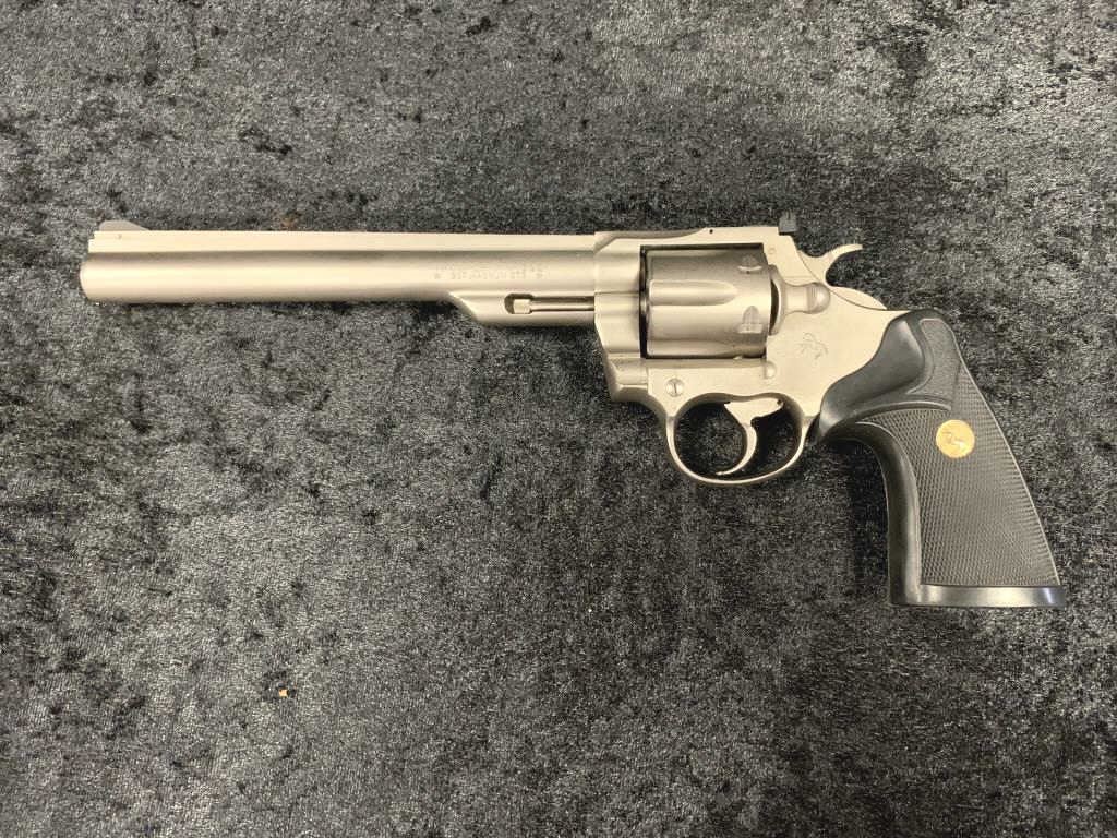 Colt Trooper MKIII Double Action Revolver in .357 with a 8" barrel, electrical nickel finish, and medallion Pachmayr type neoprene grip, S/N 70197L. Matching end label with features and finish noted. Excellent to mintin box. 99% to new. Est.: $700-$1400