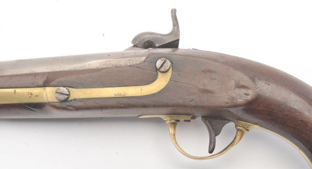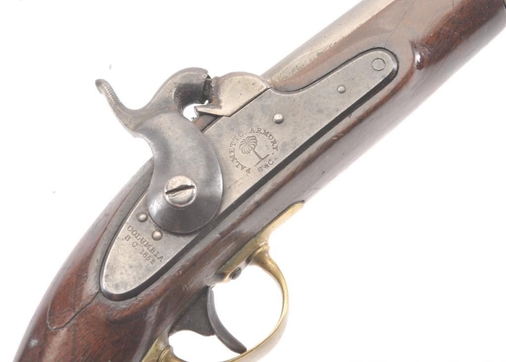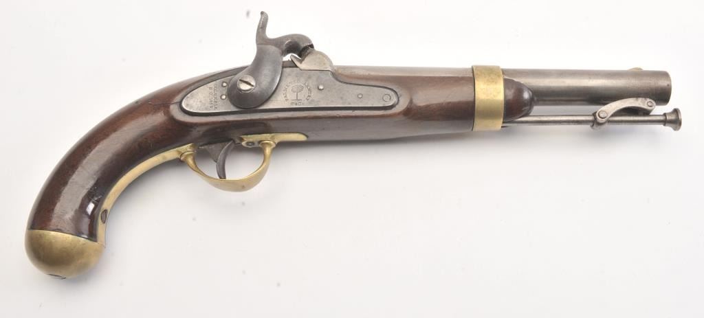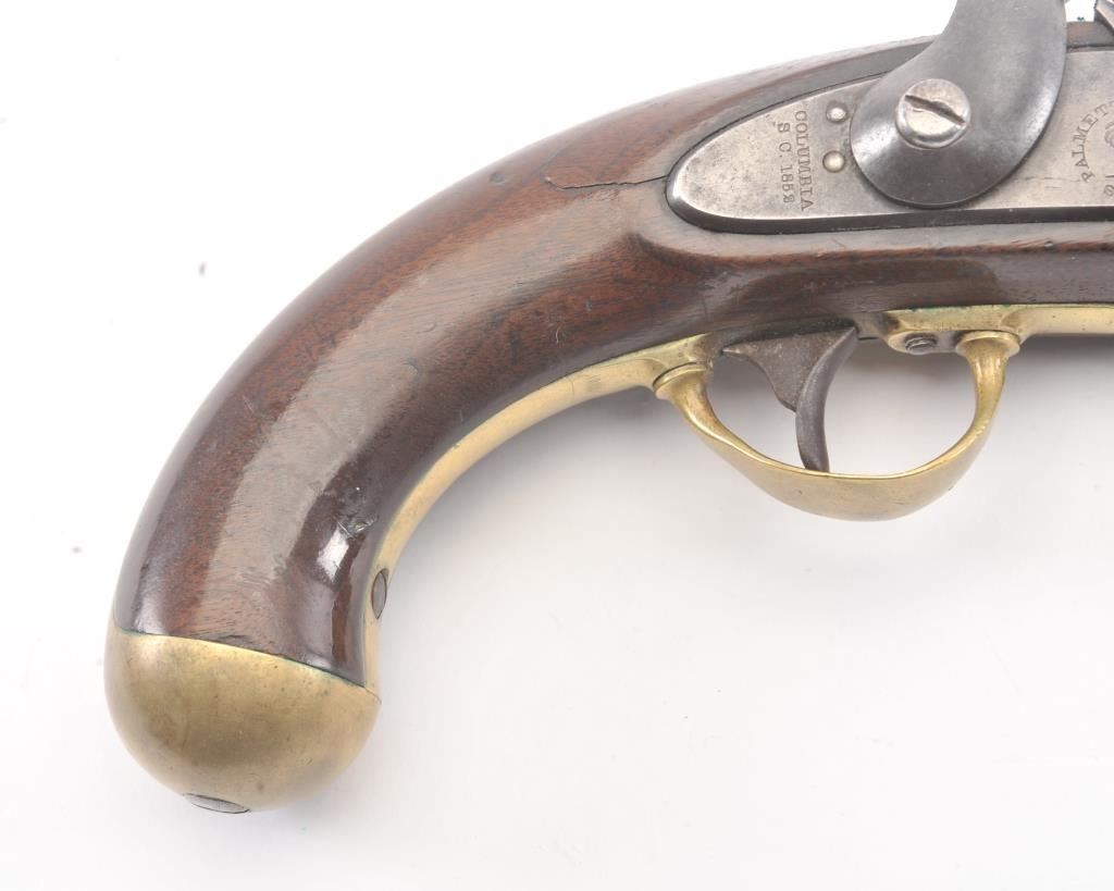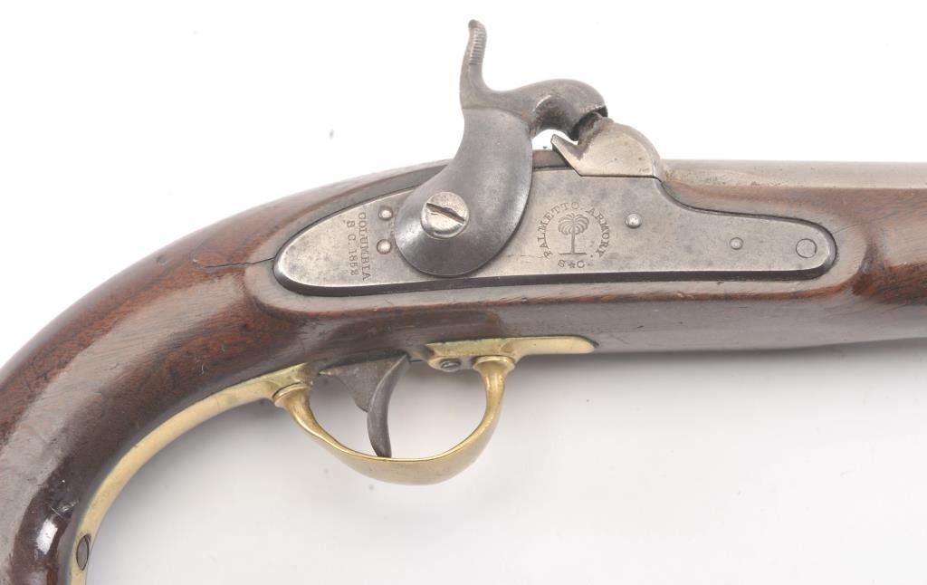 Palmetto Armory Columbia S.C. 1852 dated percussion model 1842 military pistol showing "Wm. Glaze" with Palmetto tree proof and "V.P." on the barrel. All features as standard except markings on Model 1842.(Refer Flayderman 6A-043). 1 of approximately 1000 produced Pre-Civil War and considered secondary Confederate pistols. The pistol remains in very good condition with some minor pitting and erosion. Good markings.Minor compression and cracks in the stock but generally very good overall. A strong 7 1/2-8 on a 1-10 scale. (Antique) Est.: $2000-$4000