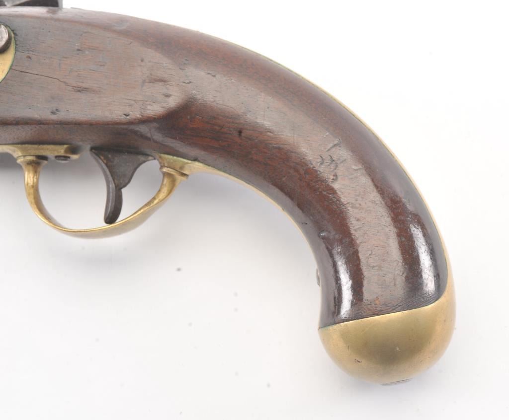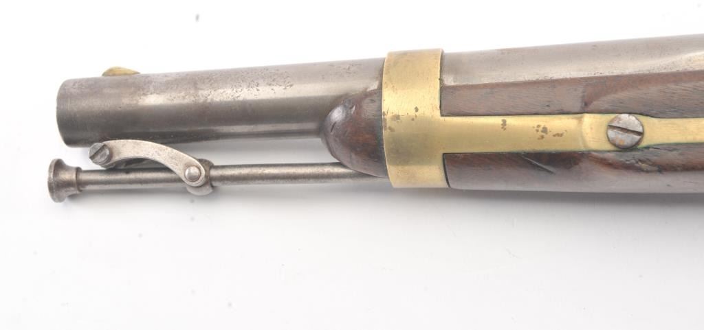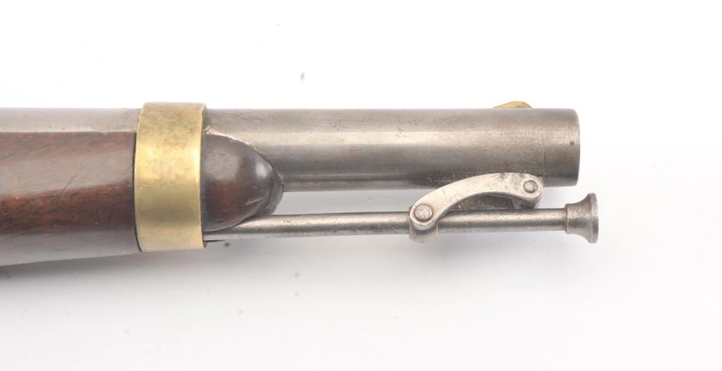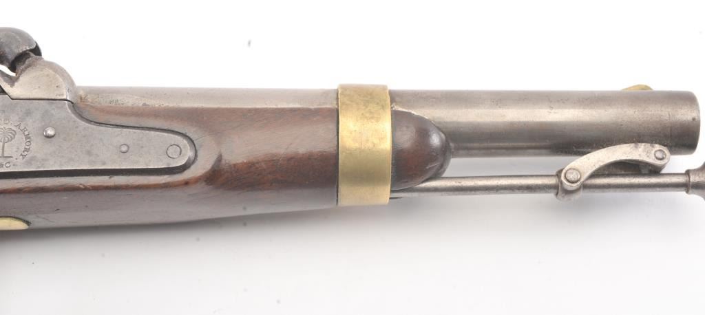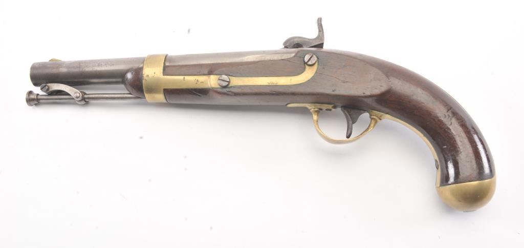 Palmetto Armory Columbia S.C. 1852 dated percussion model 1842 military pistol showing "Wm. Glaze" with Palmetto tree proof and "V.P." on the barrel. All features as standard except markings on Model 1842.(Refer Flayderman 6A-043). 1 of approximately 1000 produced Pre-Civil War and considered secondary Confederate pistols. The pistol remains in very good condition with some minor pitting and erosion. Good markings.Minor compression and cracks in the stock but generally very good overall. A strong 7 1/2-8 on a 1-10 scale. (Antique) Est.: $2000-$4000