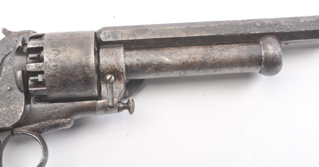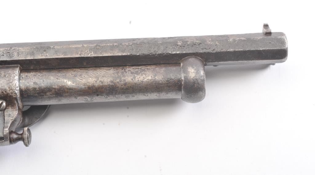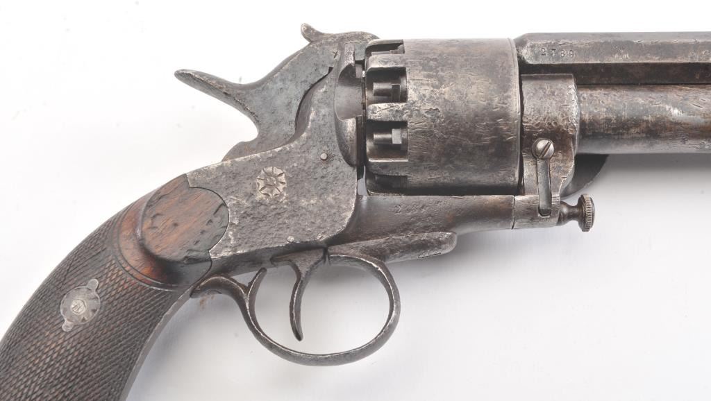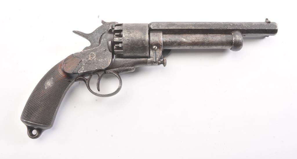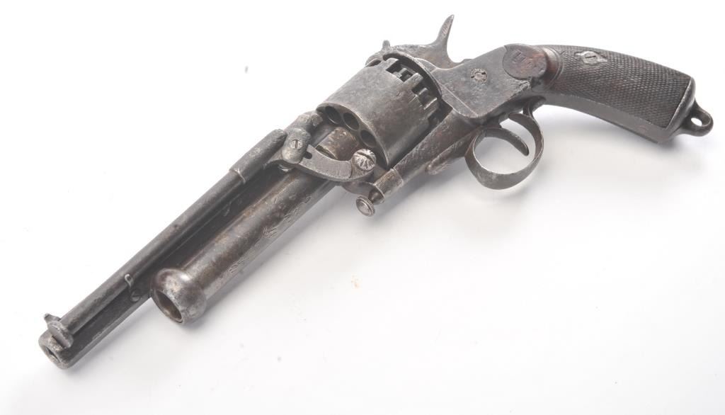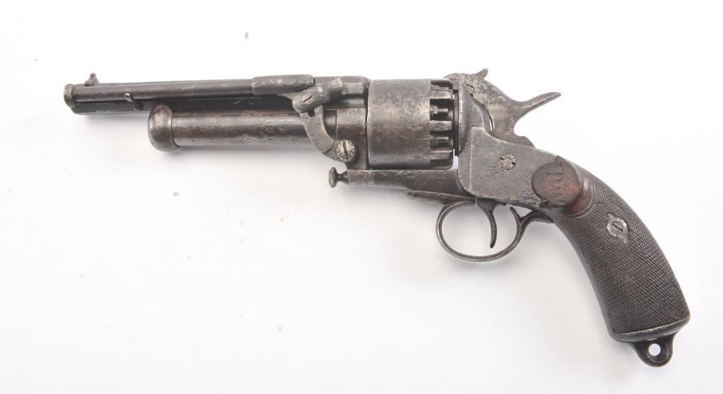 2nd Model LeMat Revolver in .41 caliber (approximately 9 shot with 16GA under the barrel, S/N 2369 with L.M. and star marking (Possible confederate use). Fair condition with scattered light to fairly heavy pittingand erosion. Correct selective hammer, rammer and small parts. The grips show good checkering with minor imperfections. Tight and works well. "This one didn't sit on the porch and sip sarsaparilla it saw war!"(Antique) Est.: $2500-$5000+++