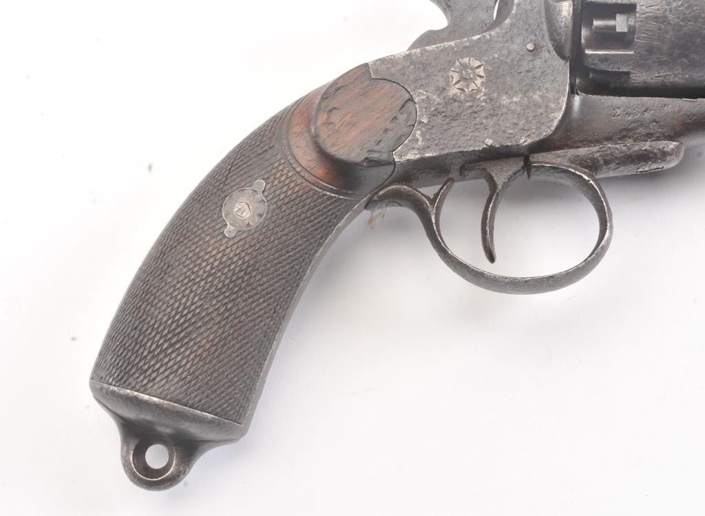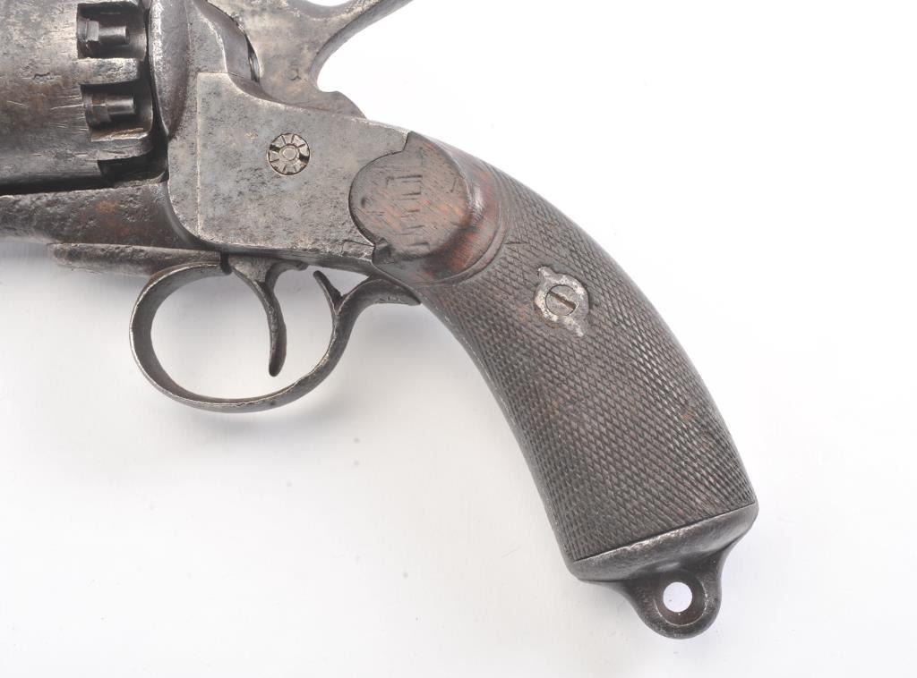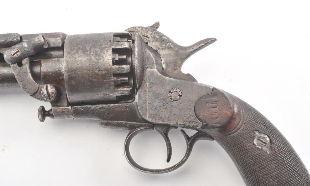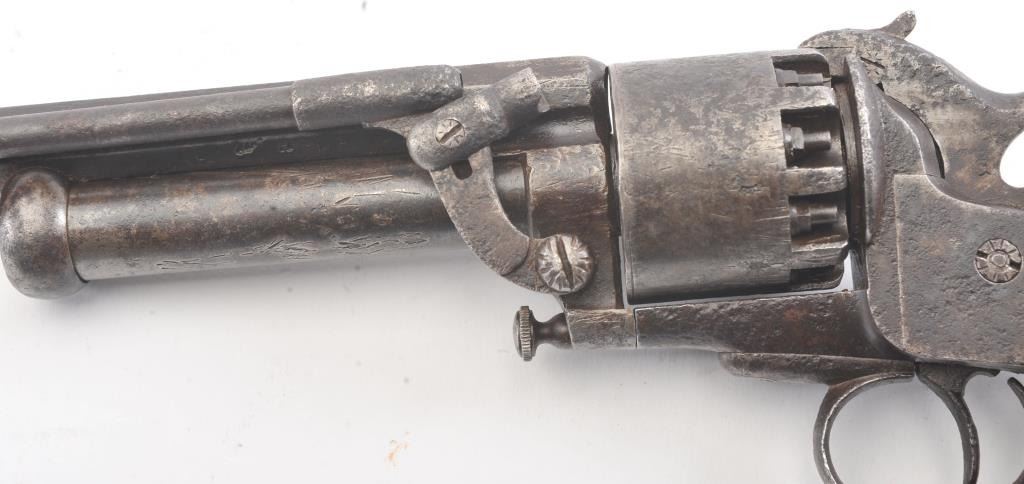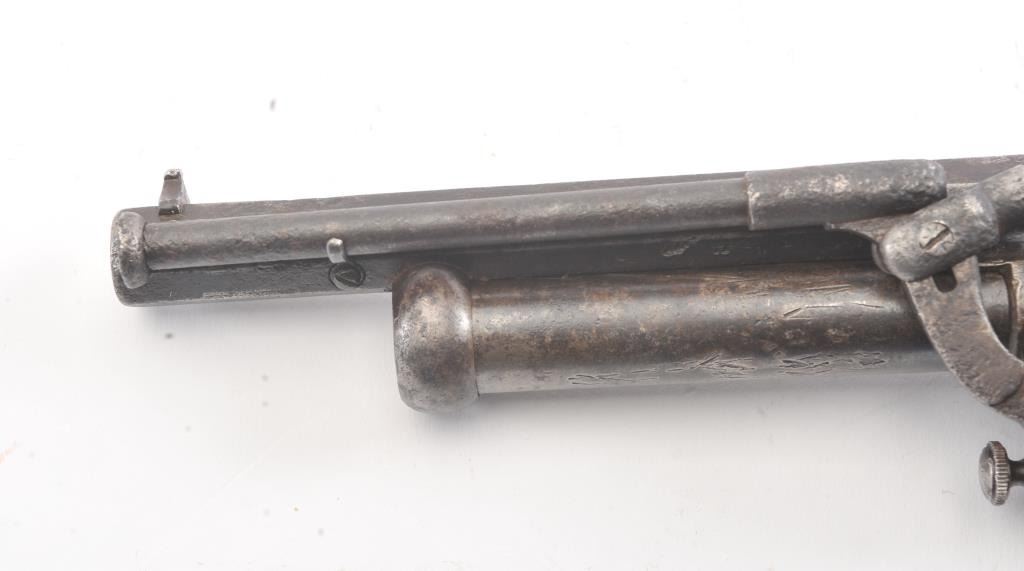 2nd Model LeMat Revolver in .41 caliber (approximately 9 shot with 16GA under the barrel, S/N 2369 with L.M. and star marking (Possible confederate use). Fair condition with scattered light to fairly heavy pittingand erosion. Correct selective hammer, rammer and small parts. The grips show good checkering with minor imperfections. Tight and works well. "This one didn't sit on the porch and sip sarsaparilla it saw war!"(Antique) Est.: $2500-$5000+++