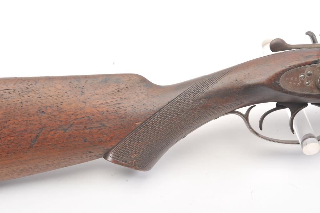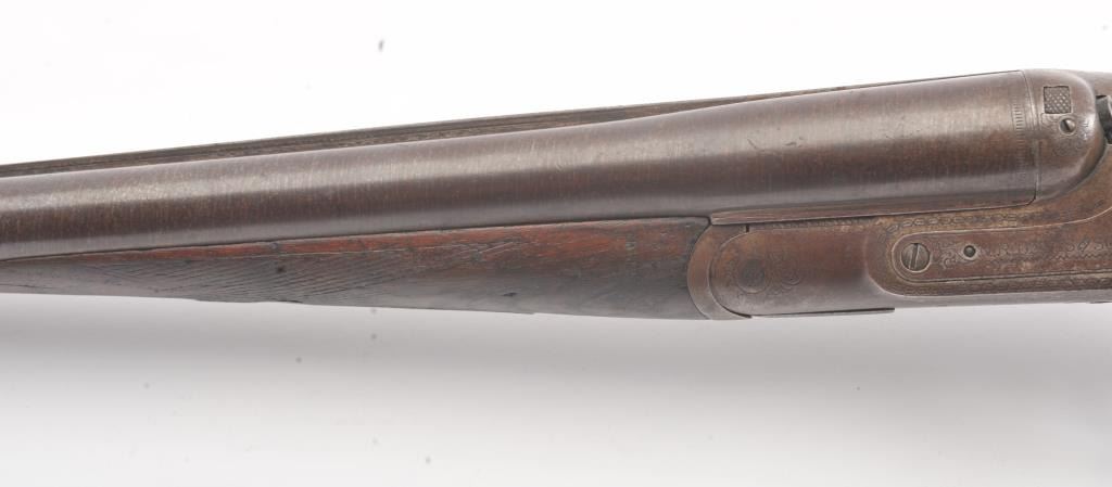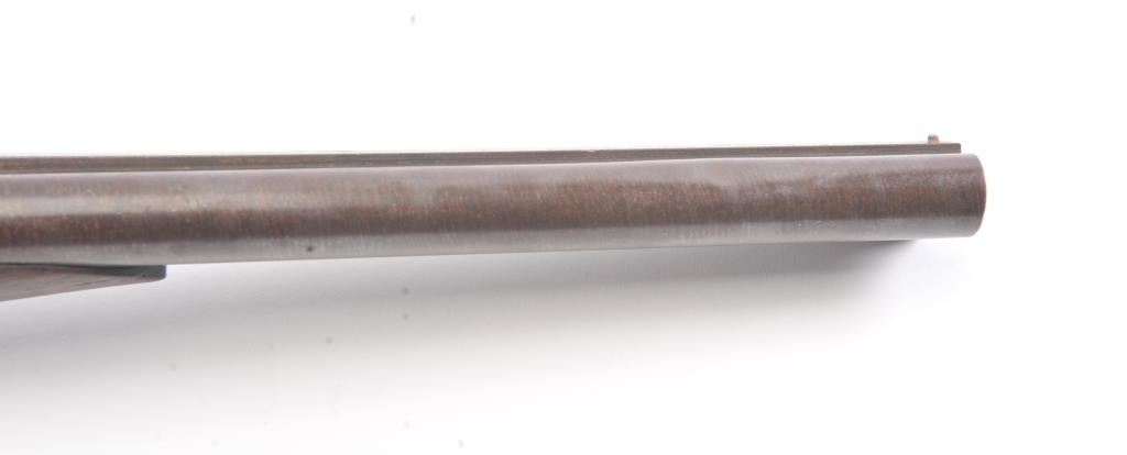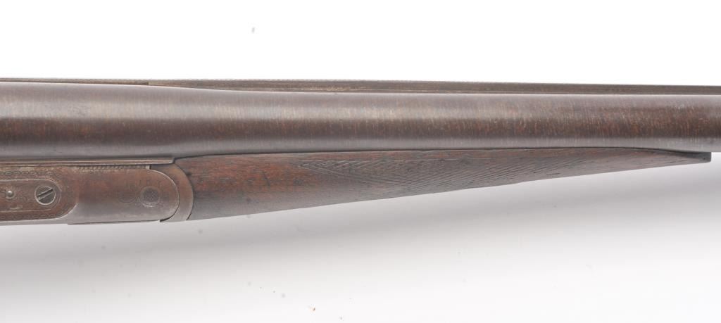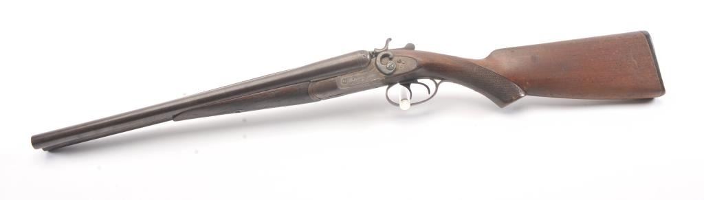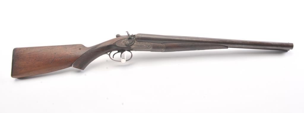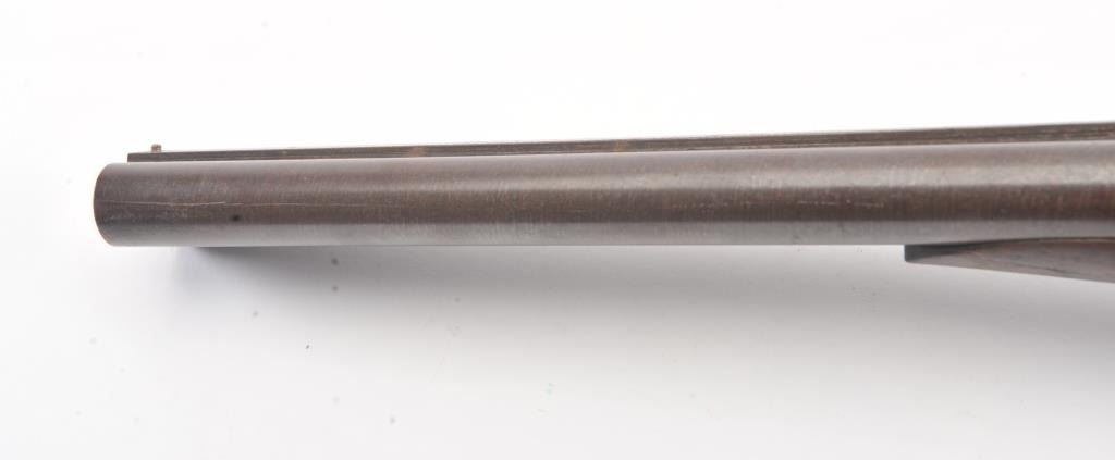 N.R. Davis SxS damascus barrel hammer shotgun with barrels reduced to 18 ¼” and marked “W.F. & Co.” in 3 places. Although out of an old collection and not modern stamped we cannot authenticate these markings and thislot sold “without warranty to the originality or age of stampings”. As Is. Good overall condition with normal aging. (Antique) Est.: $500-$1000