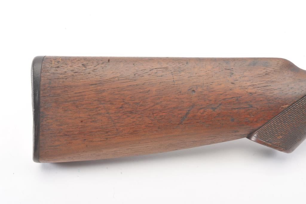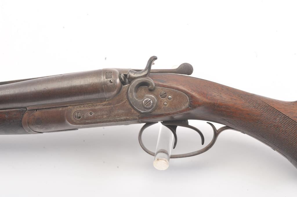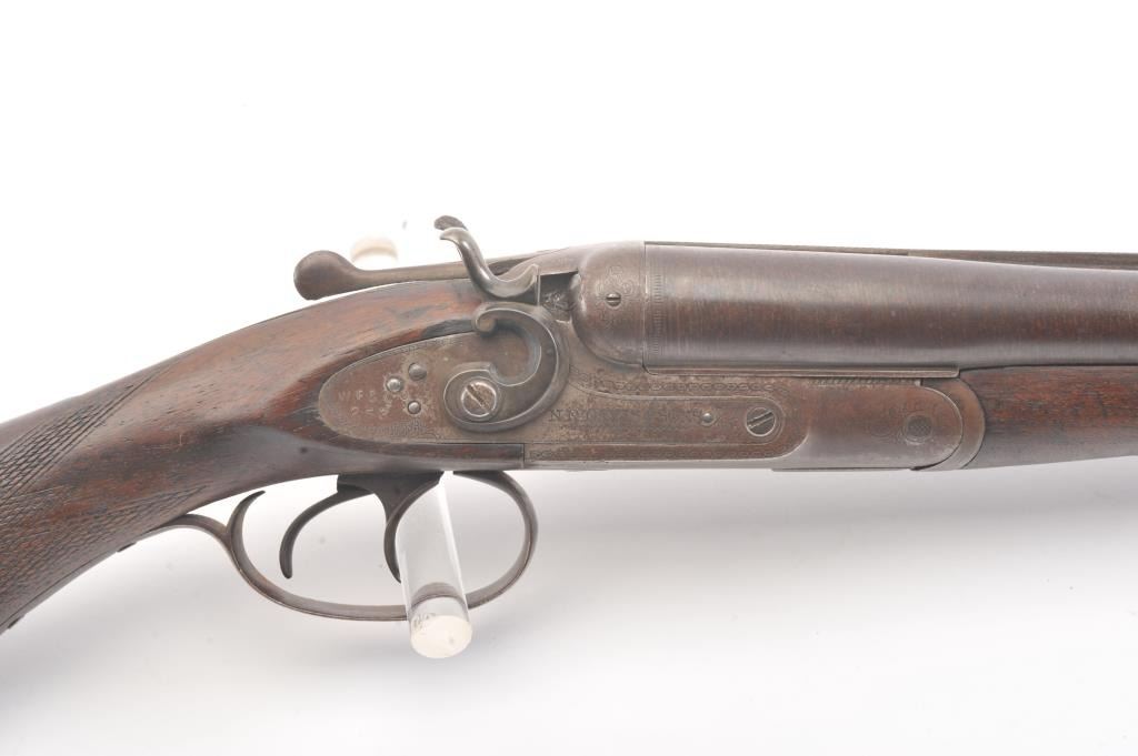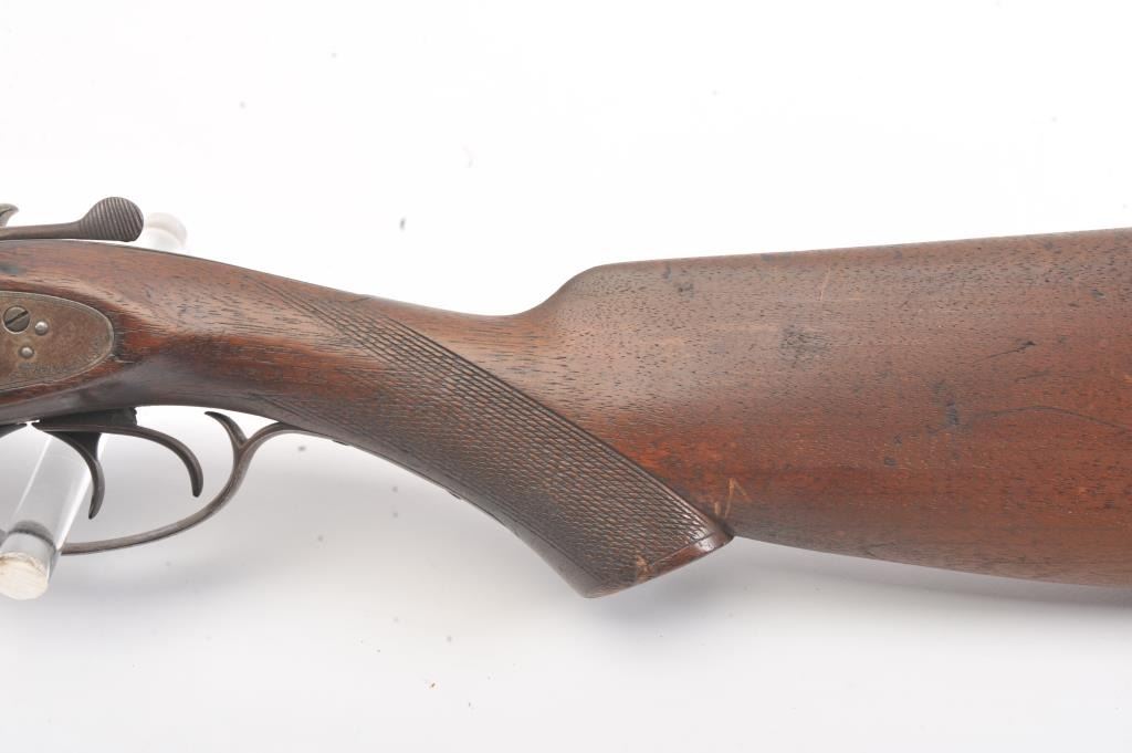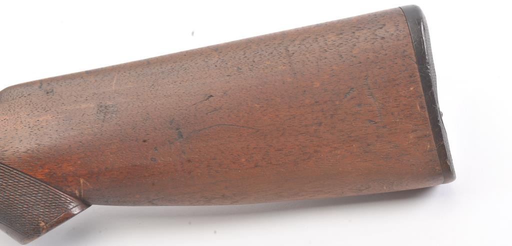 N.R. Davis SxS damascus barrel hammer shotgun with barrels reduced to 18 ¼” and marked “W.F. & Co.” in 3 places. Although out of an old collection and not modern stamped we cannot authenticate these markings and thislot sold “without warranty to the originality or age of stampings”. As Is. Good overall condition with normal aging. (Antique) Est.: $500-$1000