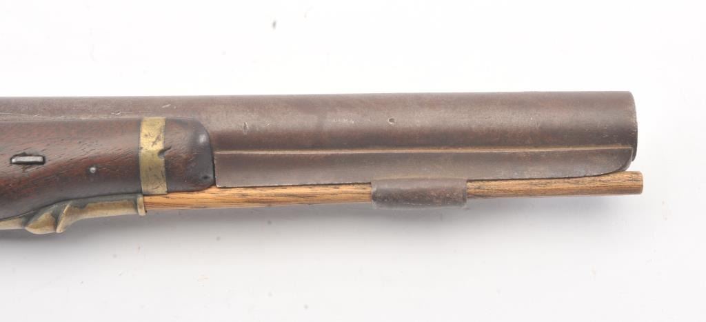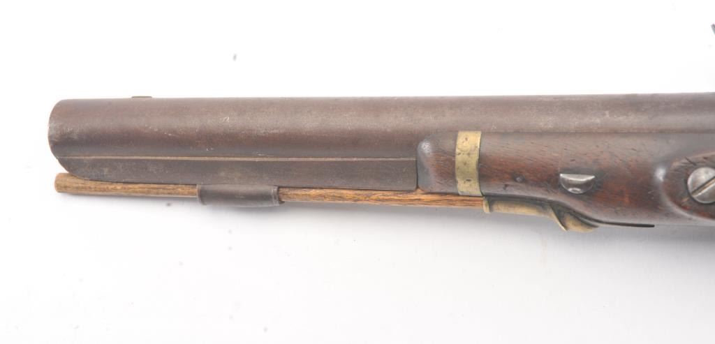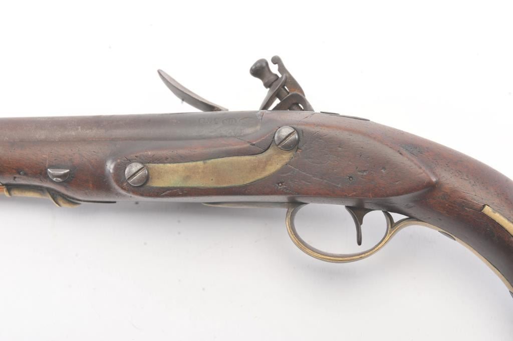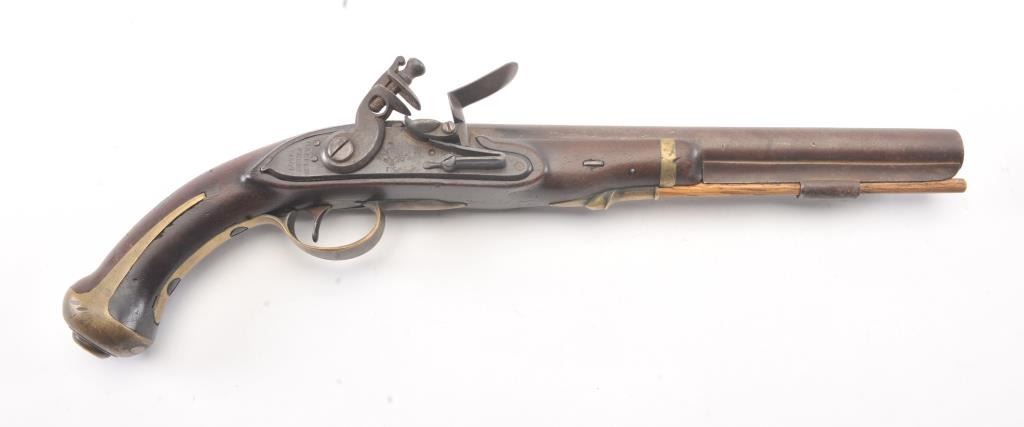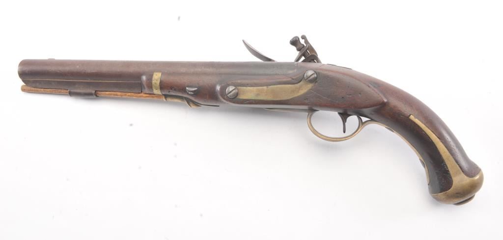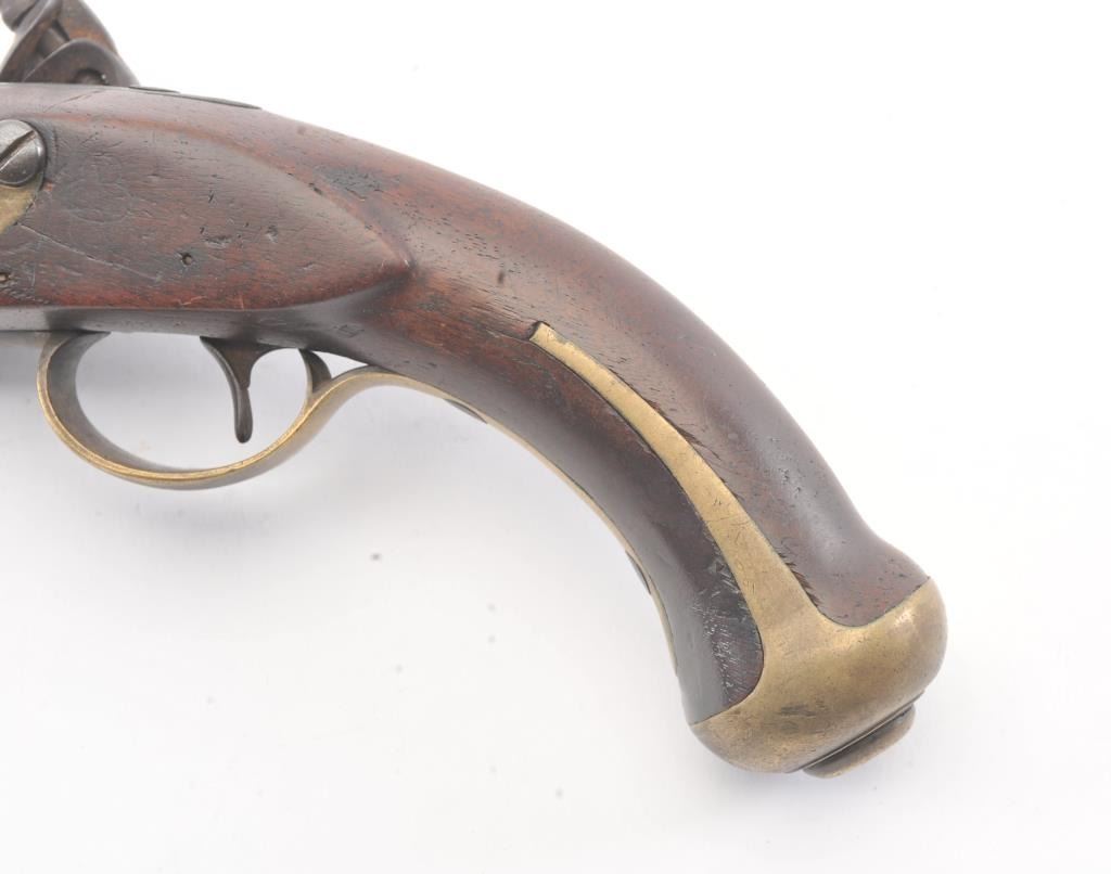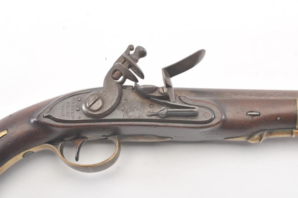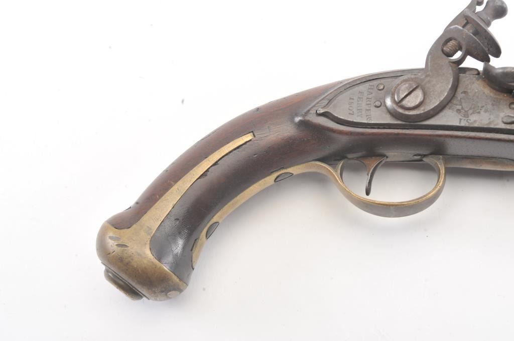 U.S. Model 1805 Harpers Ferry flintlock martial pistol dated 1807 and S/N 360. The best reconversion imaginable using what appears to be an original hammer. Good markings and barrel proofs. The stocks aregood to very good with outline of cartouche. Hickory ramrod a replacement. A very attractive model 1805 with a 2000+ reconversion by a master gunsmith. Provenance Walter O' Conner (1989-91). (Antique) Est.:$3000-$6000