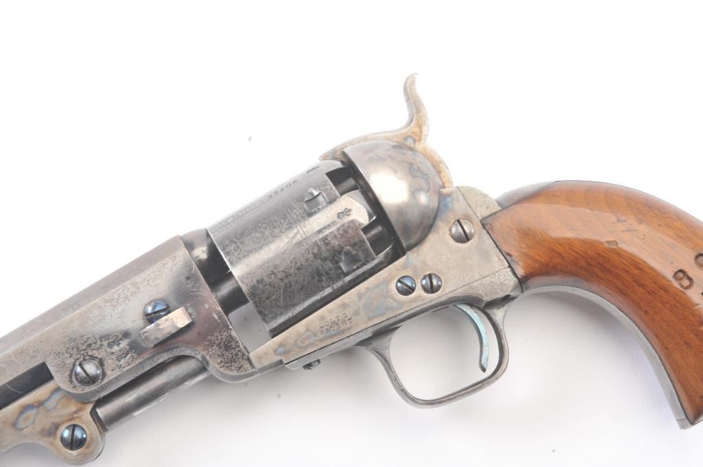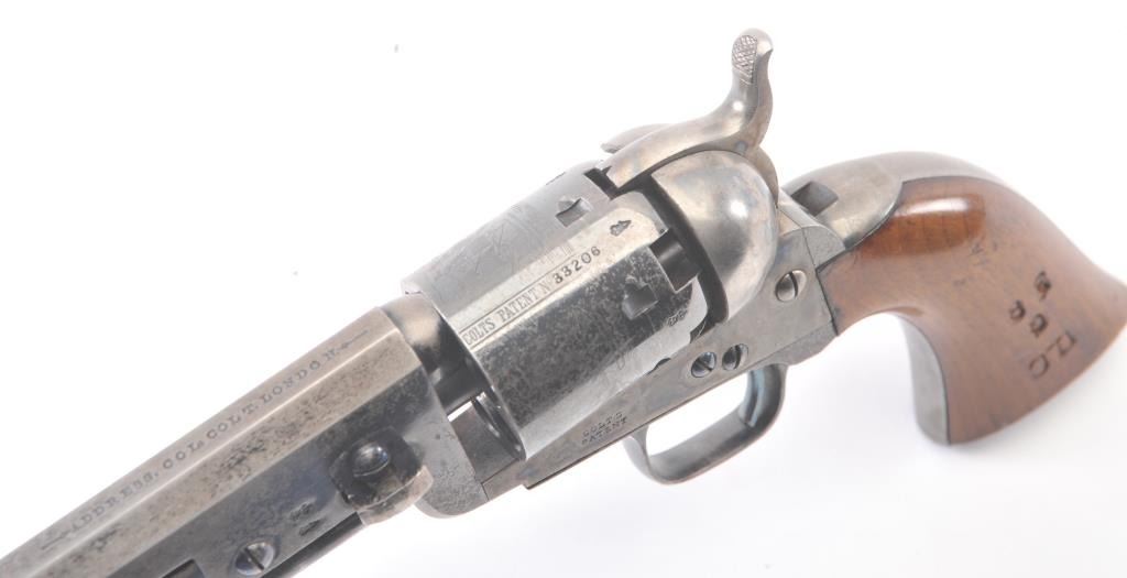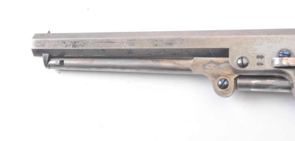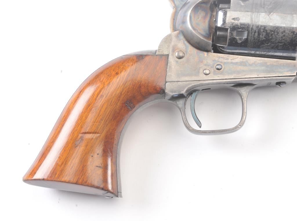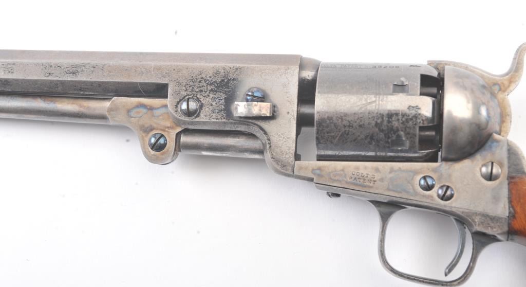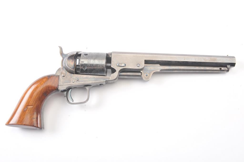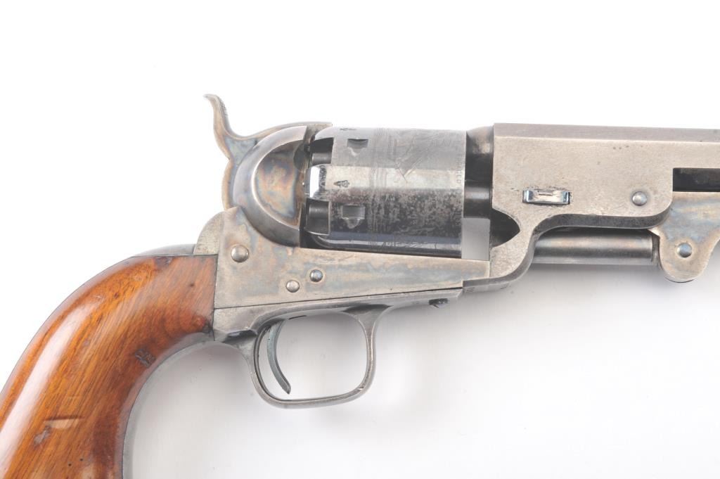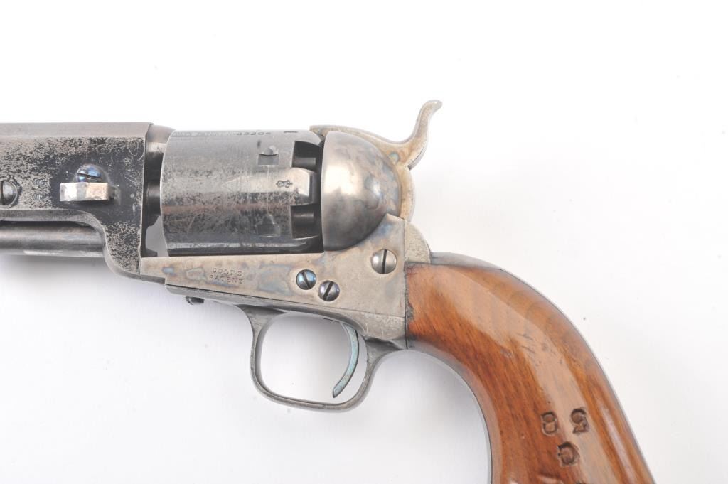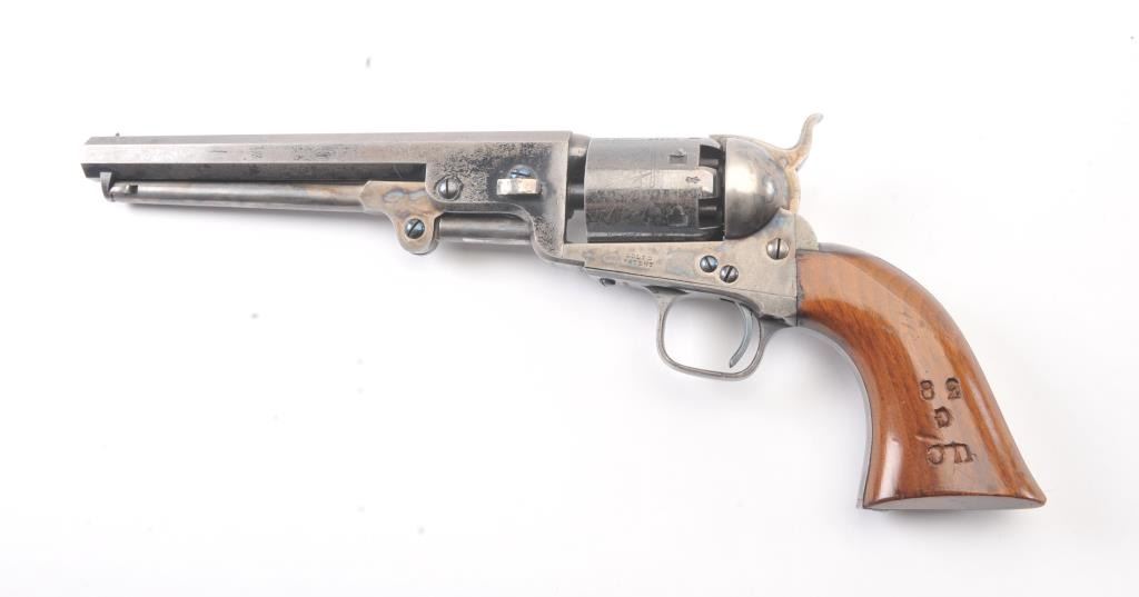 Very scarce “Upper Canada” variation of Colt 1851 Navy revolver, S/N 33206 in very good plus to almost fine original condition. All matching serial numbers which is seldom found on this Canadian military issue revolver and left grip is stamped “U. C. /G/ 38” with British proofs. The metal surfaces are very sharp and crisp showing drifting of finish with appreciable wear or use. 20%-40% original bright blue remains on the barrel,75%-85% original blue on the cylinder, 60%-80% case hardening with good rainbow hues, and 20%+ blue on the guard. The grips are almost fine with a couple of minor dings and mars. Only 800 total Canadian militaryrevolvers were made and the majority that exist are not matching or in this high of condition. The Gary Wiemann Navy collection. (Antique) Est.: $6,000-$12,000