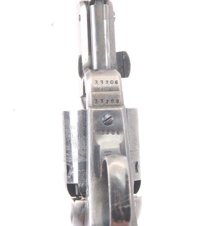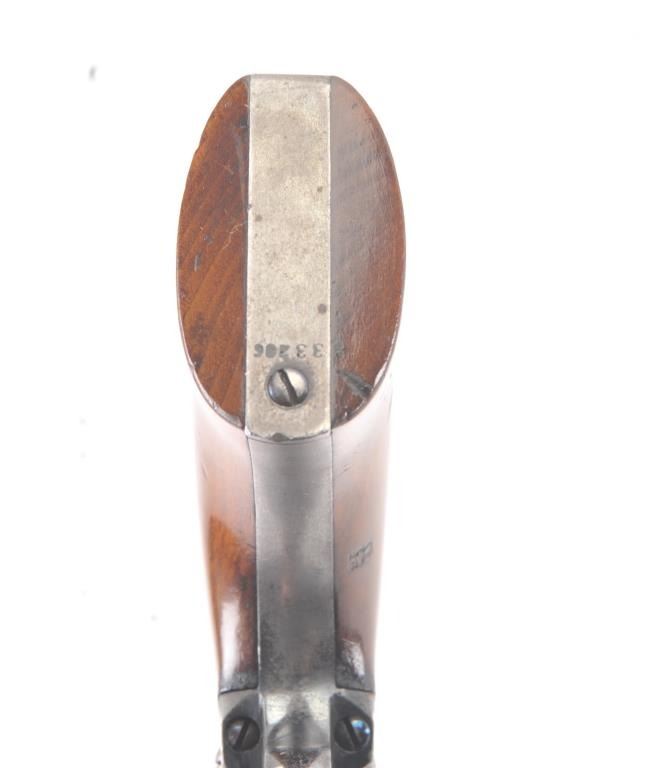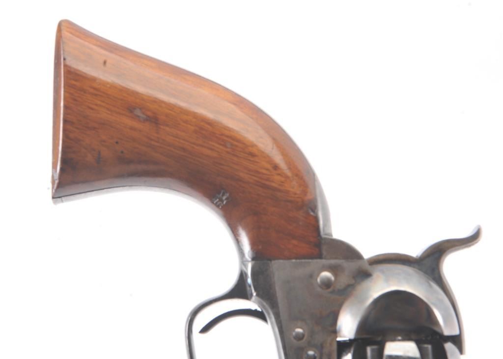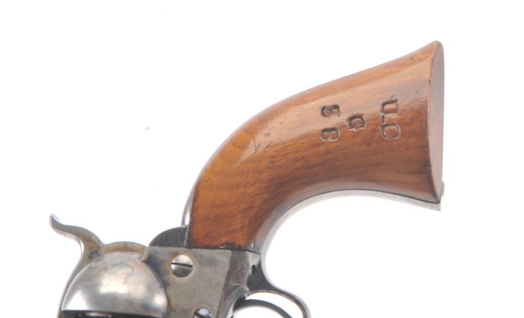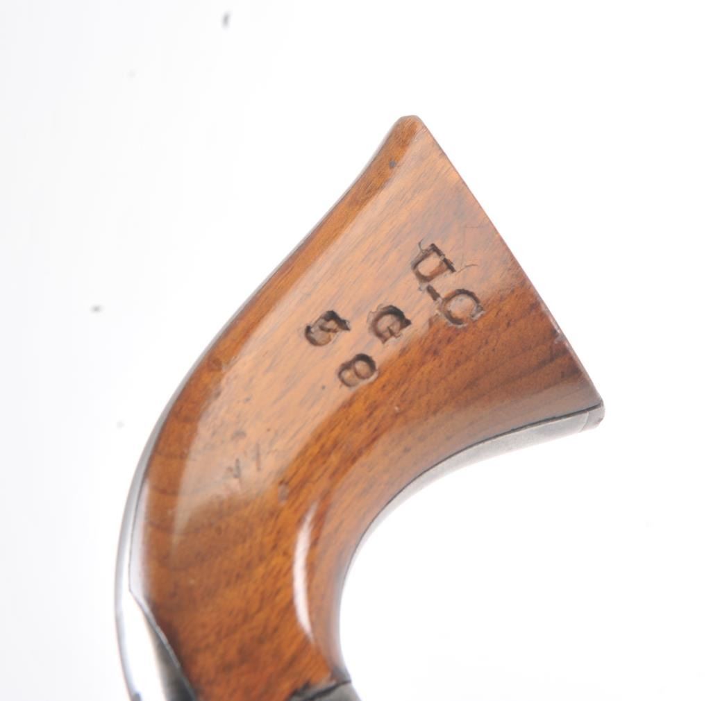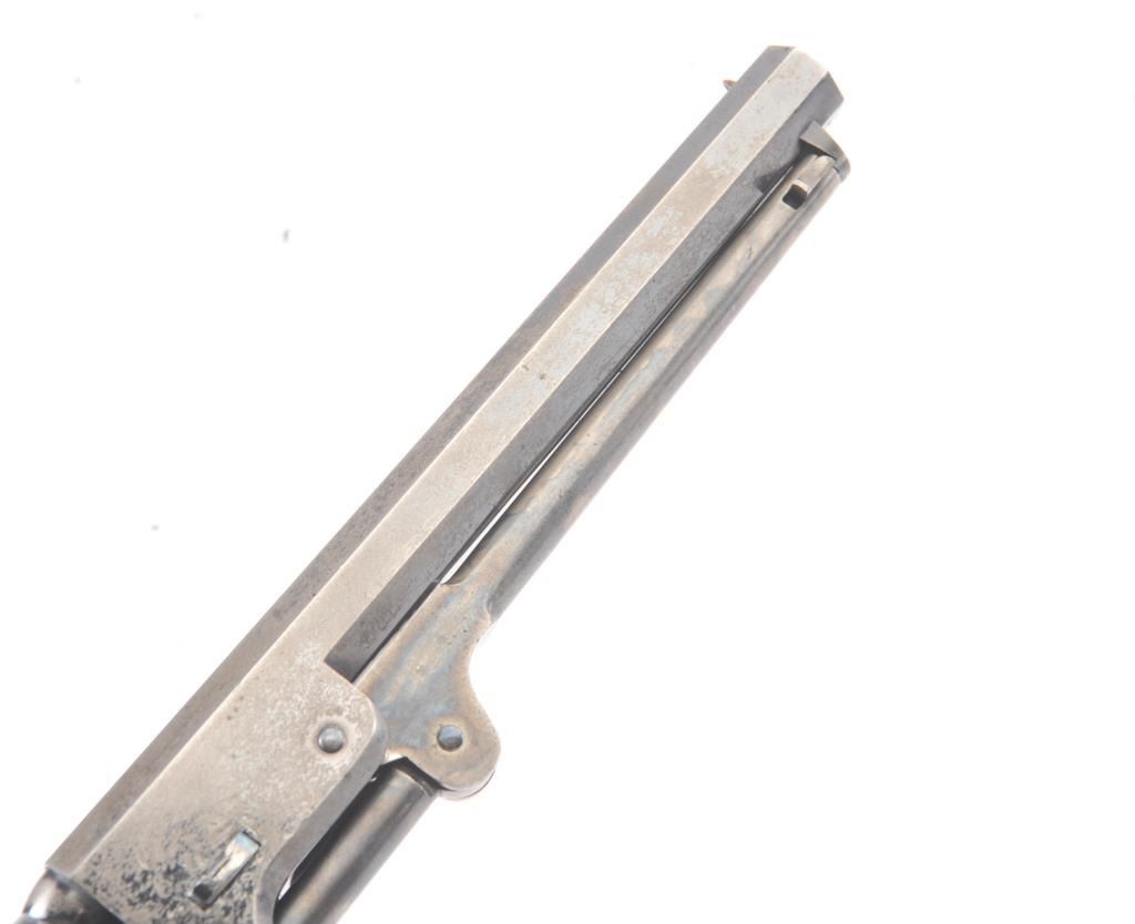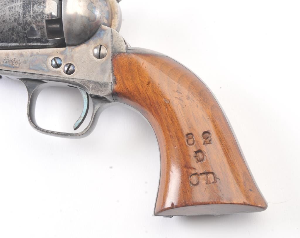 Very scarce “Upper Canada” variation of Colt 1851 Navy revolver, S/N 33206 in very good plus to almost fine original condition. All matching serial numbers which is seldom found on this Canadian military issue revolver and left grip is stamped “U. C. /G/ 38” with British proofs. The metal surfaces are very sharp and crisp showing drifting of finish with appreciable wear or use. 20%-40% original bright blue remains on the barrel,75%-85% original blue on the cylinder, 60%-80% case hardening with good rainbow hues, and 20%+ blue on the guard. The grips are almost fine with a couple of minor dings and mars. Only 800 total Canadian militaryrevolvers were made and the majority that exist are not matching or in this high of condition. The Gary Wiemann Navy collection. (Antique) Est.: $6,000-$12,000