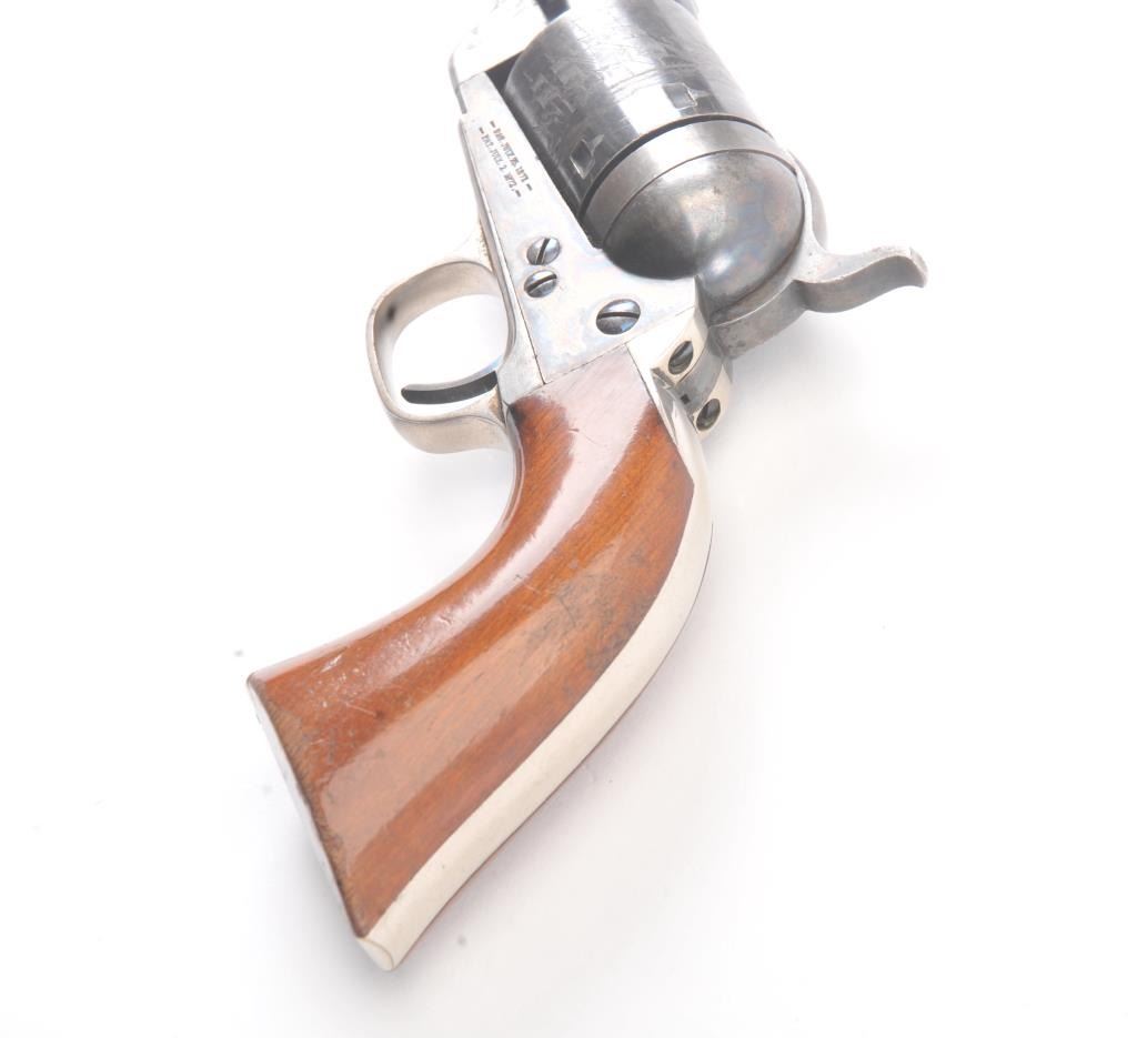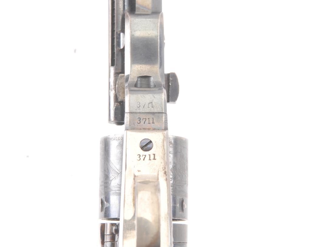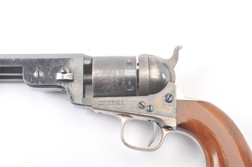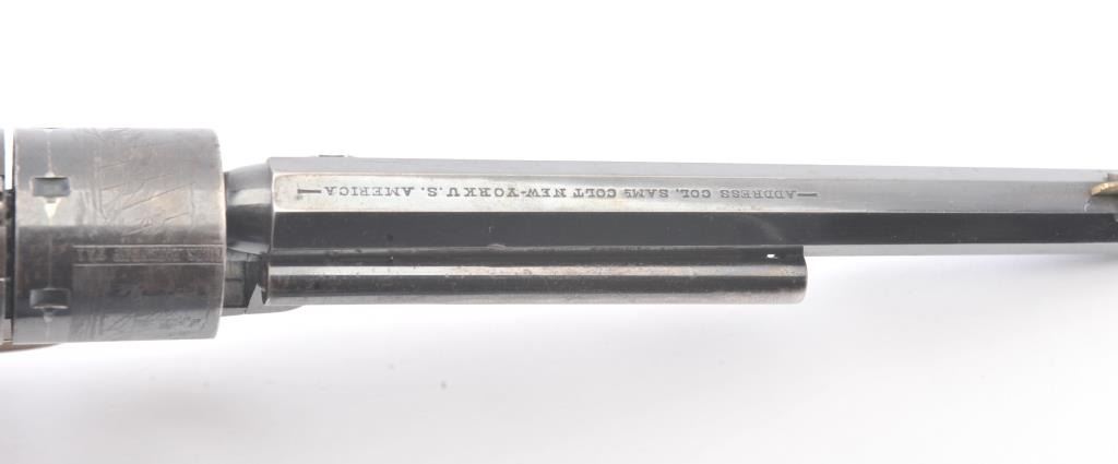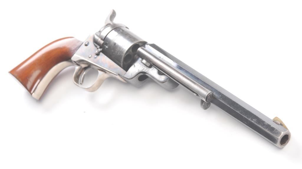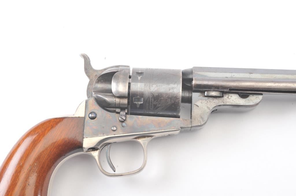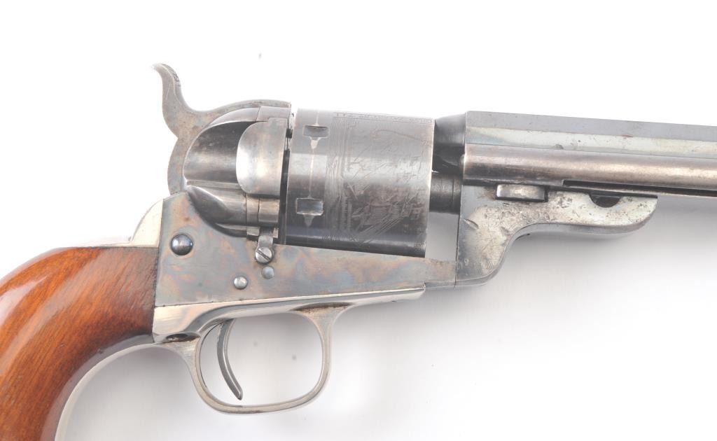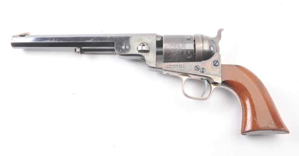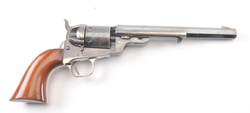 Exceptional Colt 1851 Navy revolver factory 1871-72 conversion to .38 center fire, S/N 3711 and made in own serial number range using percussion parts and adding ejector rod and loading gate with outside spring secured by screw (See Jordan’s book Page 147 Fig. 13-7 reference). This fine navy shows a period large blade sight with neat base professionally made and inletted at the muzzle. The revolver shows 75%-85% bright original blue and case colors. Sharp markings and most of the original scene. Some scratching by lug beneath the wedge on the left side of the barrel and minor carry wear and use. All matching numbers. The grips are almost fine with 80%-90% original varnish and just minor wear at the bottom and edges. Crisp, tight and bright interior showing very little use. Sharp markings. Gary Wiemann collection. Note: This revolver was obtained by purchase from a great grandson of Brigham Young who resided in Laguna Beach along with a fancy Sharps pistol carbine approximately 20 years ago. The documentation with this pistol was not located in Mr. Wiemann’s estate but may be mentioned in the document that authenticated provenance on the ultra-fine Sharps which accompanied this pistol. Est.: $7,000-$14,000