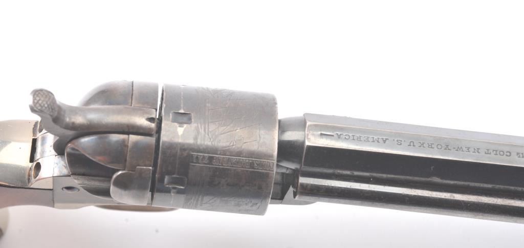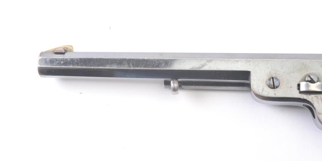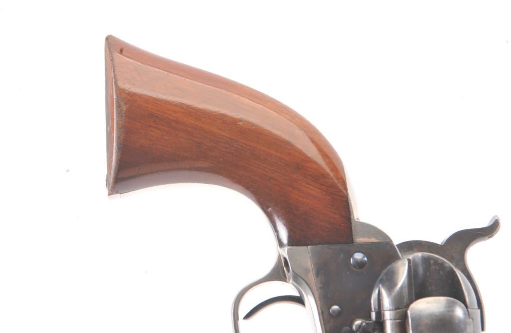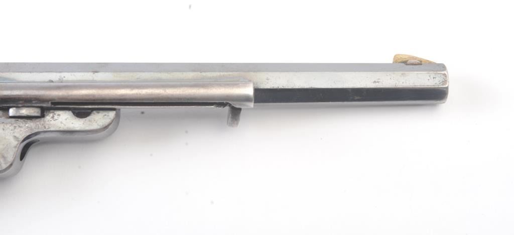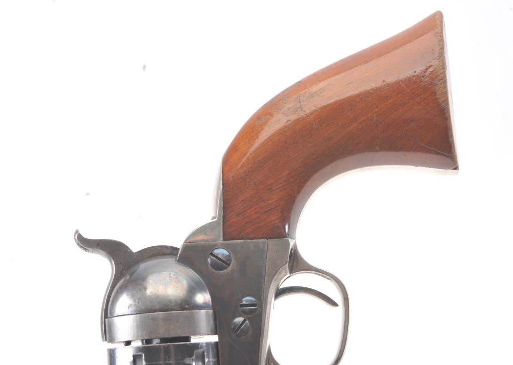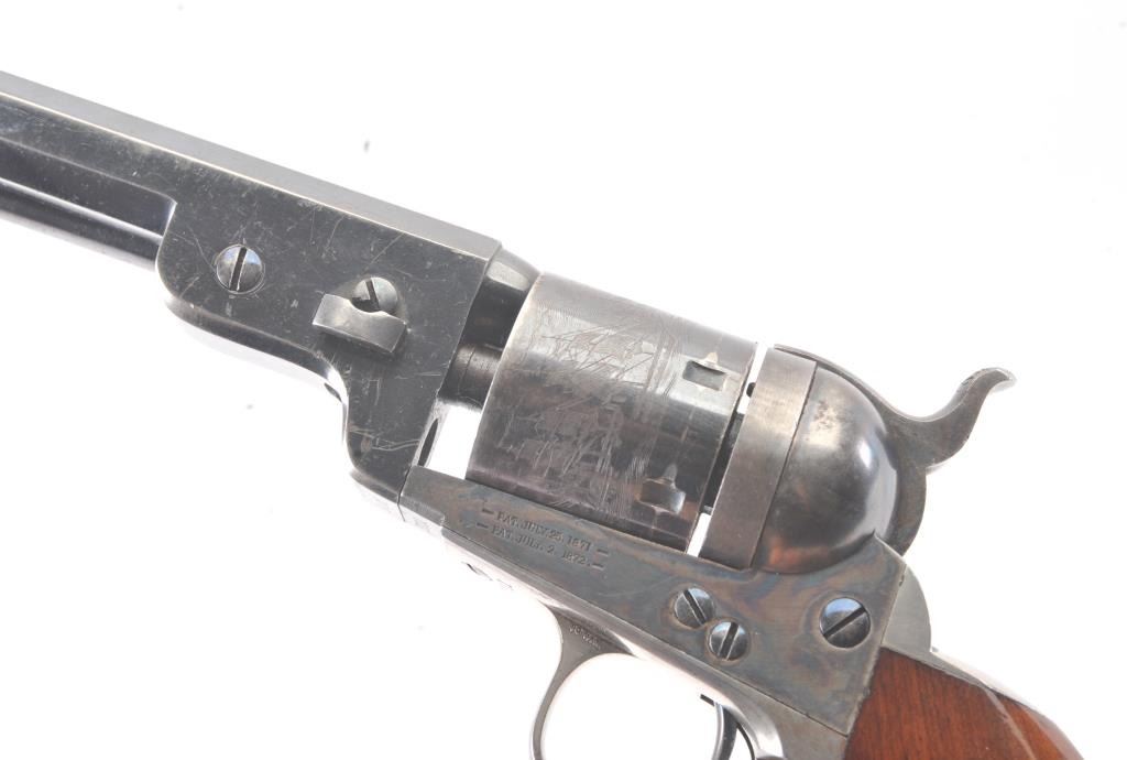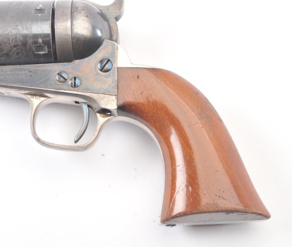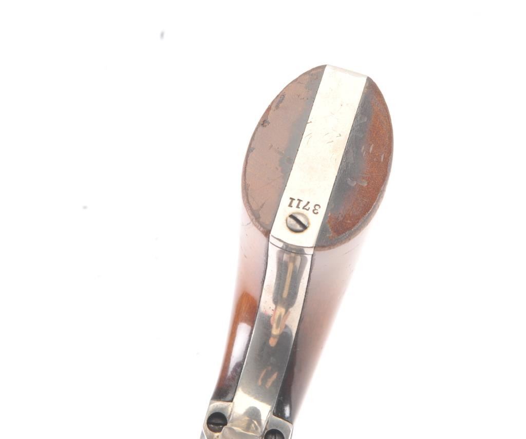 Exceptional Colt 1851 Navy revolver factory 1871-72 conversion to .38 center fire, S/N 3711 and made in own serial number range using percussion parts and adding ejector rod and loading gate with outside spring secured by screw (See Jordan’s book Page 147 Fig. 13-7 reference). This fine navy shows a period large blade sight with neat base professionally made and inletted at the muzzle. The revolver shows 75%-85% bright original blue and case colors. Sharp markings and most of the original scene. Some scratching by lug beneath the wedge on the left side of the barrel and minor carry wear and use. All matching numbers. The grips are almost fine with 80%-90% original varnish and just minor wear at the bottom and edges. Crisp, tight and bright interior showing very little use. Sharp markings. Gary Wiemann collection. Note: This revolver was obtained by purchase from a great grandson of Brigham Young who resided in Laguna Beach along with a fancy Sharps pistol carbine approximately 20 years ago. The documentation with this pistol was not located in Mr. Wiemann’s estate but may be mentioned in the document that authenticated provenance on the ultra-fine Sharps which accompanied this pistol. Est.: $7,000-$14,000
