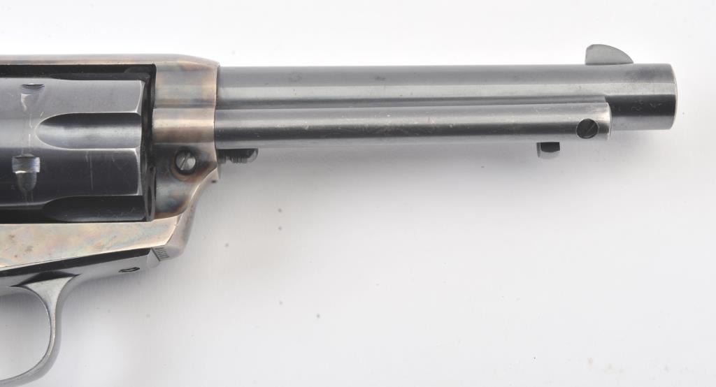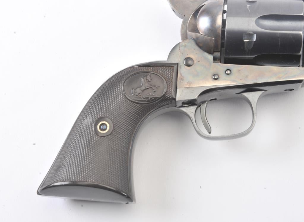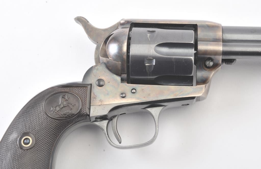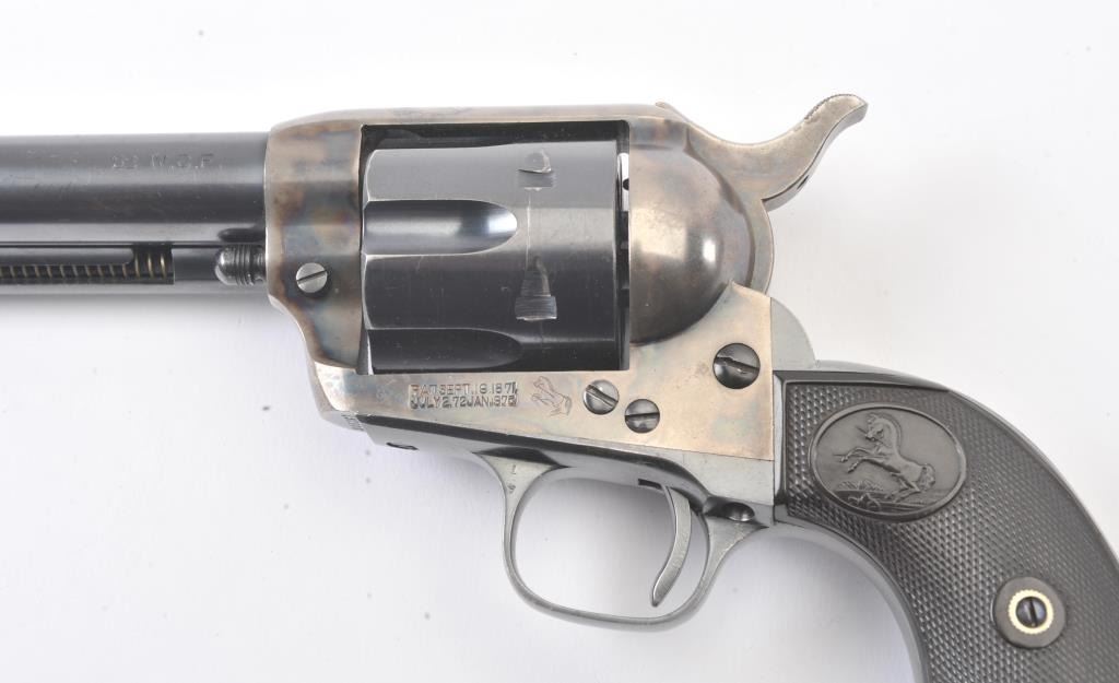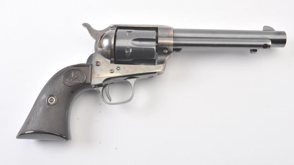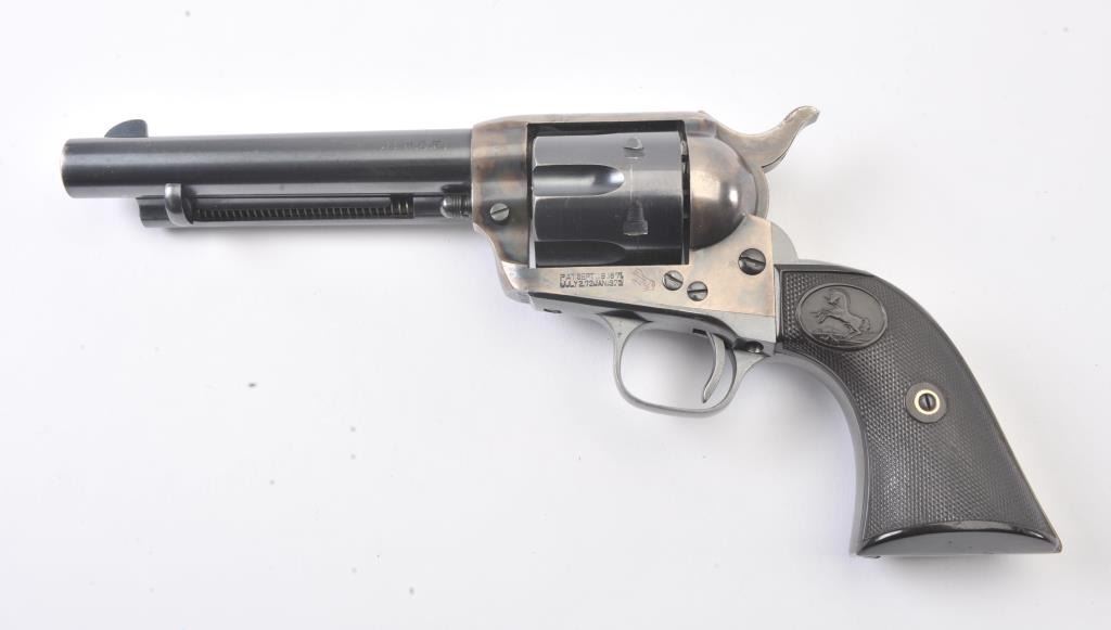 Colt SAA revolver, .32 W.C.F. caliber, 5.5” barrel, blued and case hardened finish, checkered black hard rubber grips, S/N 345367 (ca. 1923); overall fine to excellent condition displaying approximately 95-98%original blued finish and approximately 92-96% original case colors; fine bore, crisp action, sharp markings and fine grips. (C&R/NO PPT). Est.: $2,750-$5,500.