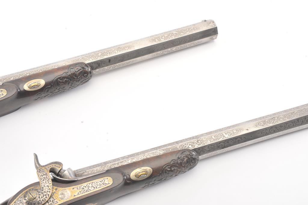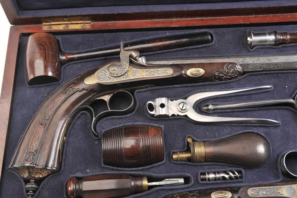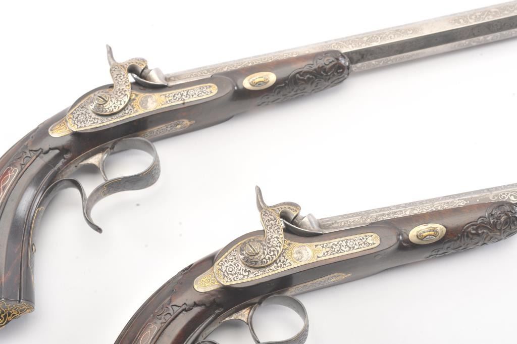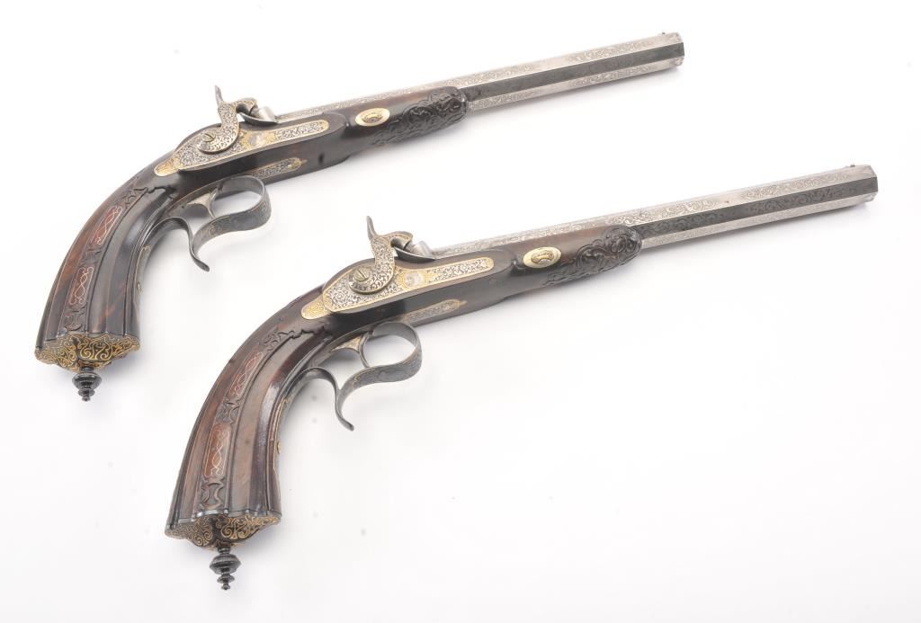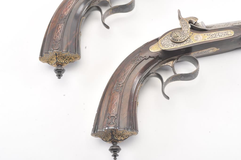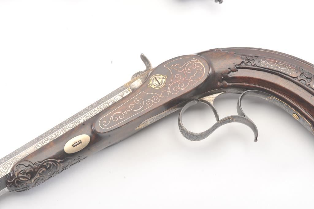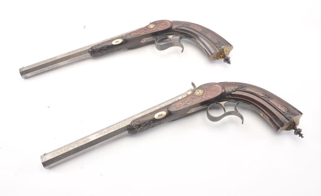 Pair of Exhibition Grade Dueling Target pistols showing gold and silver inlay with fancy etching and unusual combination of fine ornamentation. The pair are unsigned and undoubtedly made on order with hand engraved vignette of nobleman at the center of each lock. The locks are richly engraved with gold borders and accents. The barrels are gold inlaid Acier Fondu with extensive gold line and scroll bordering along with acid etching. The trigger guards show portrait etched at the center (Possibly Cardinal Richelieu). The guards are blued and gold inlaid. The stocks are ornately carved with silver wire. Measures 17” overall with 10 ¾” barrels of .50 caliber rifled. French style cased with all original accessories. French gray or satin finish in very good plus to near fine condition. Minor aging and minimal imperfections. Completely sharp and crisp metal. Velvet lined box almost excellent. The exterior of the case shows brass mounts and is a select mahogany or walnut with minor scratches and also very good to near fine. In over 50 year of selling and collecting this type cased set. I have never seen another set with this combination of fancy embellishments. The identity of the small portrait at the center of locks will be key to researching this outstanding set which is classic French in style. (Antique) Est.: $6,000-$12,000