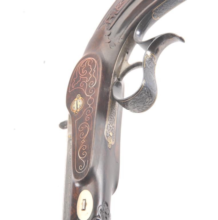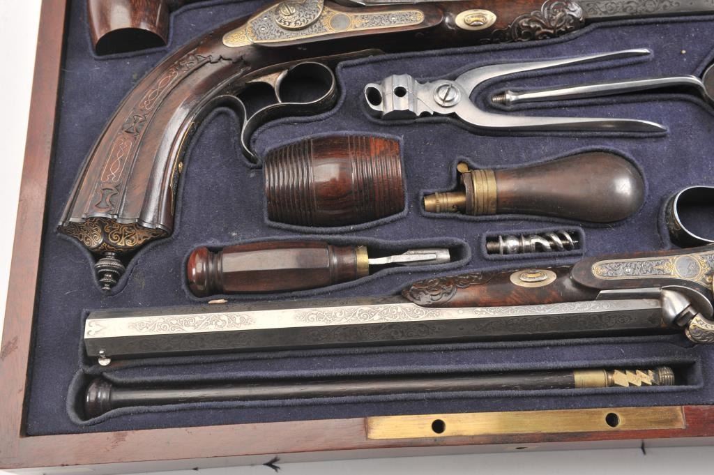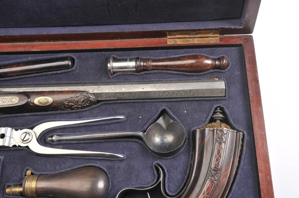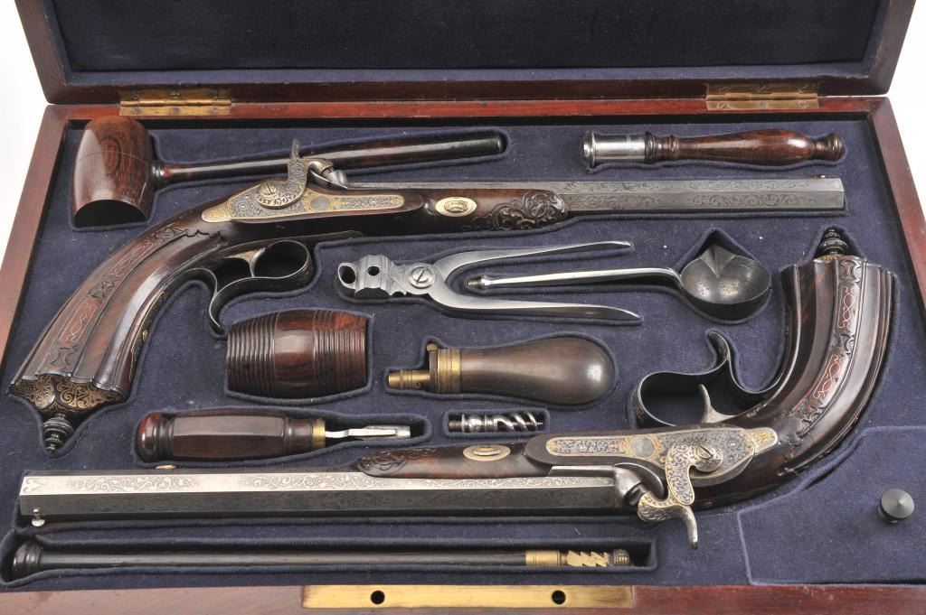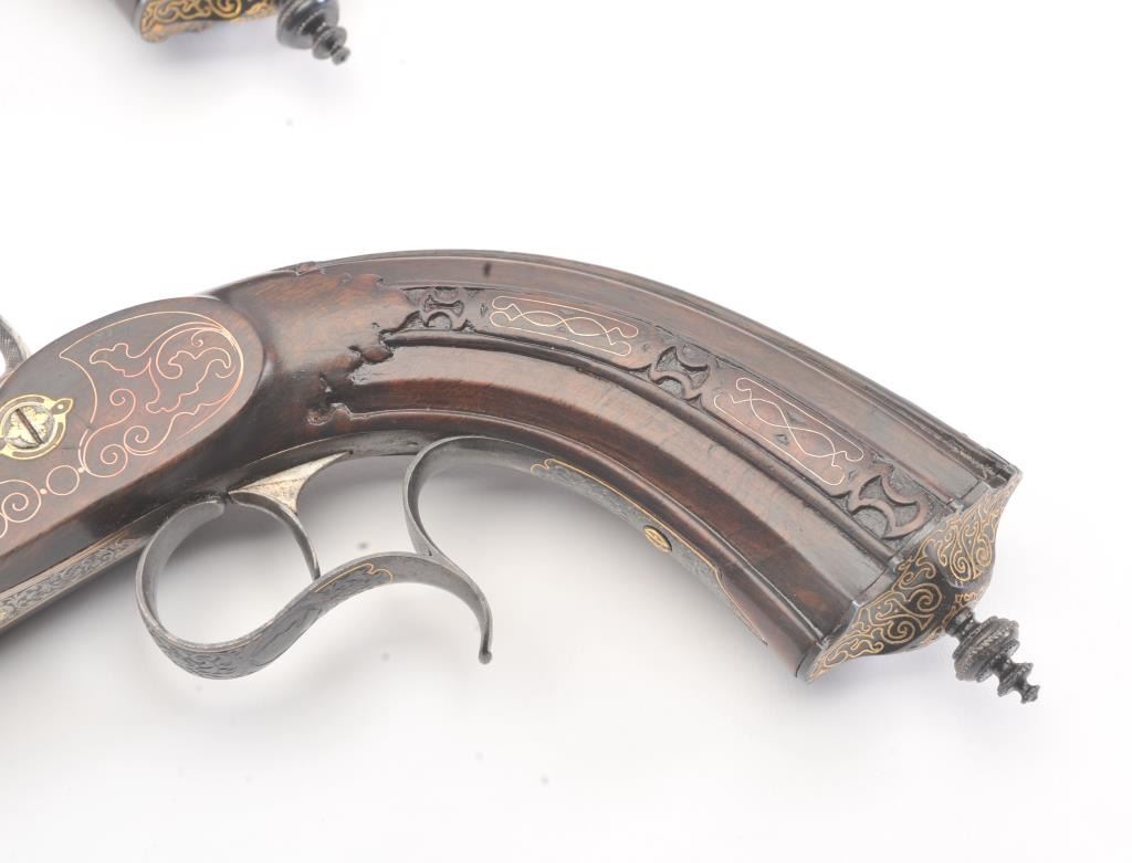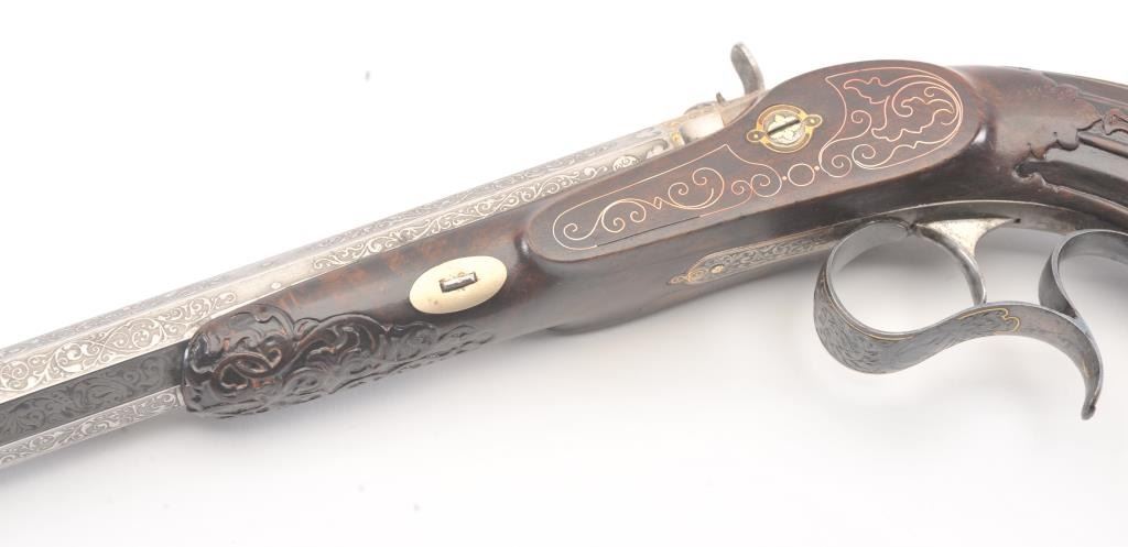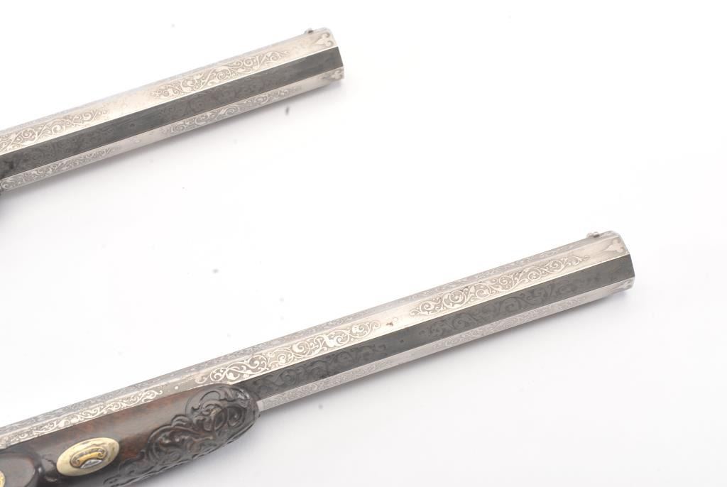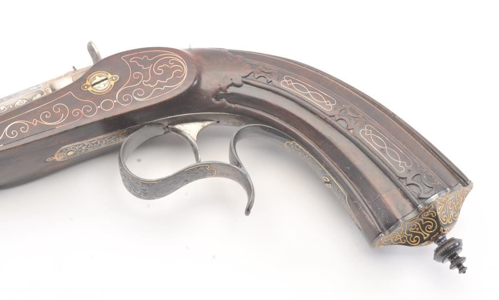 Pair of Exhibition Grade Dueling Target pistols showing gold and silver inlay with fancy etching and unusual combination of fine ornamentation. The pair are unsigned and undoubtedly made on order with hand engraved vignette of nobleman at the center of each lock. The locks are richly engraved with gold borders and accents. The barrels are gold inlaid Acier Fondu with extensive gold line and scroll bordering along with acid etching. The trigger guards show portrait etched at the center (Possibly Cardinal Richelieu). The guards are blued and gold inlaid. The stocks are ornately carved with silver wire. Measures 17” overall with 10 ¾” barrels of .50 caliber rifled. French style cased with all original accessories. French gray or satin finish in very good plus to near fine condition. Minor aging and minimal imperfections. Completely sharp and crisp metal. Velvet lined box almost excellent. The exterior of the case shows brass mounts and is a select mahogany or walnut with minor scratches and also very good to near fine. In over 50 year of selling and collecting this type cased set. I have never seen another set with this combination of fancy embellishments. The identity of the small portrait at the center of locks will be key to researching this outstanding set which is classic French in style. (Antique) Est.: $6,000-$12,000