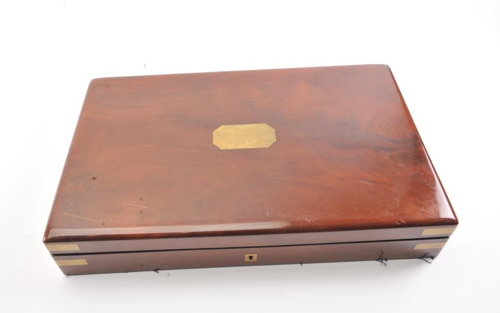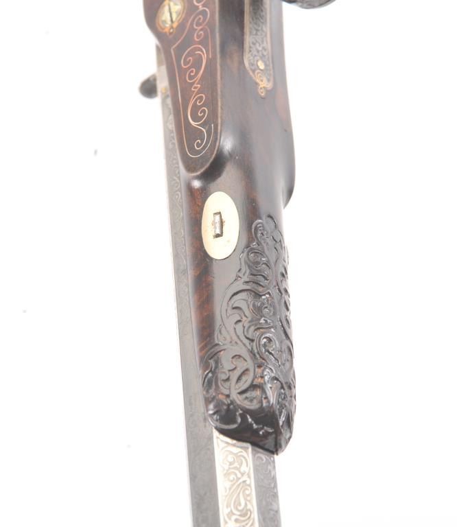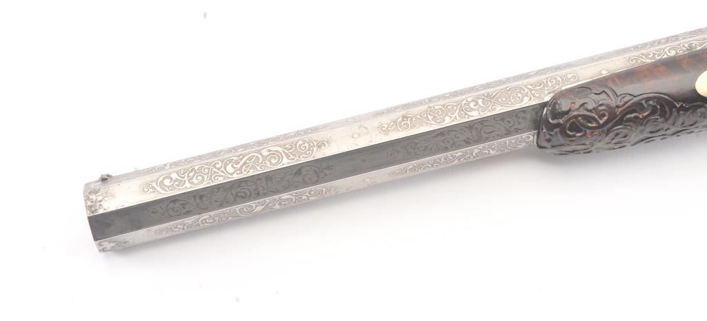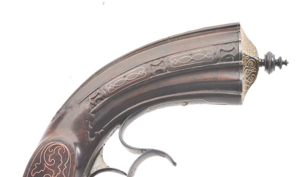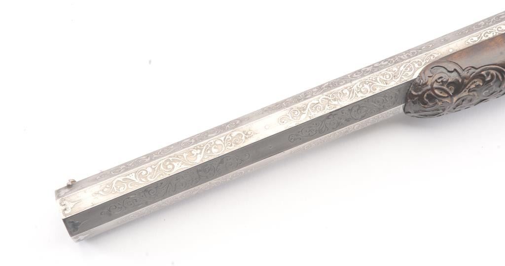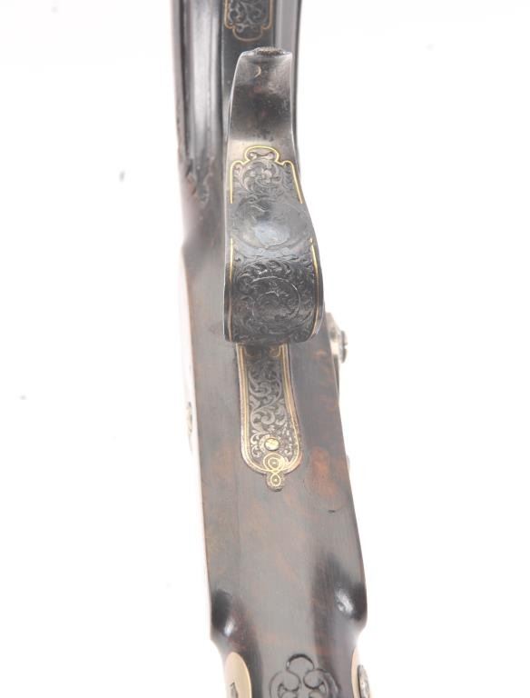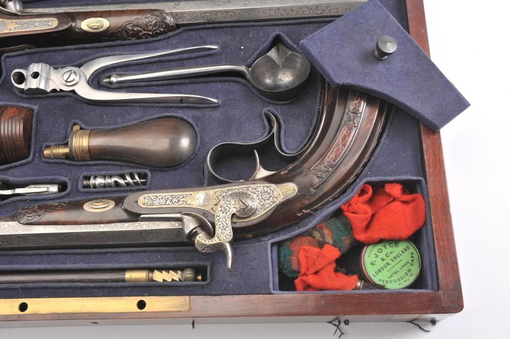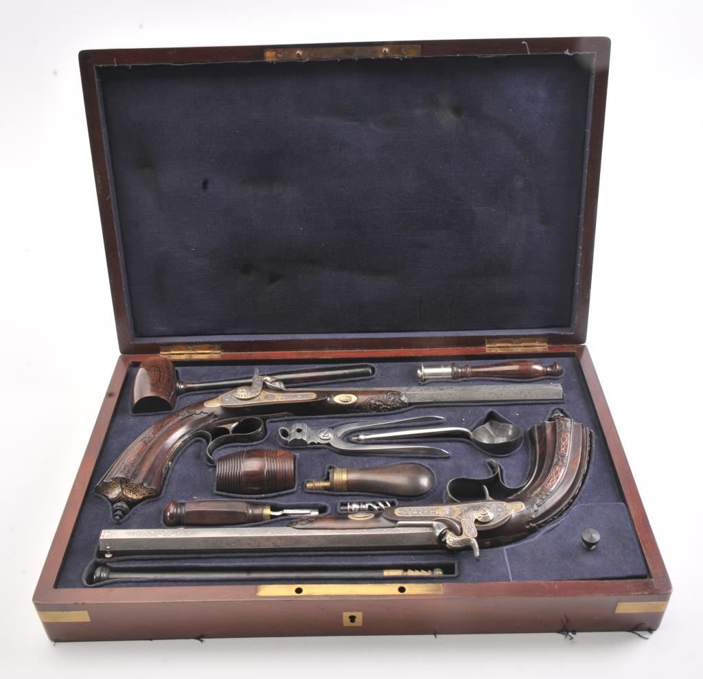 Pair of Exhibition Grade Dueling Target pistols showing gold and silver inlay with fancy etching and unusual combination of fine ornamentation. The pair are unsigned and undoubtedly made on order with hand engraved vignette of nobleman at the center of each lock. The locks are richly engraved with gold borders and accents. The barrels are gold inlaid Acier Fondu with extensive gold line and scroll bordering along with acid etching. The trigger guards show portrait etched at the center (Possibly Cardinal Richelieu). The guards are blued and gold inlaid. The stocks are ornately carved with silver wire. Measures 17” overall with 10 ¾” barrels of .50 caliber rifled. French style cased with all original accessories. French gray or satin finish in very good plus to near fine condition. Minor aging and minimal imperfections. Completely sharp and crisp metal. Velvet lined box almost excellent. The exterior of the case shows brass mounts and is a select mahogany or walnut with minor scratches and also very good to near fine. In over 50 year of selling and collecting this type cased set. I have never seen another set with this combination of fancy embellishments. The identity of the small portrait at the center of locks will be key to researching this outstanding set which is classic French in style. (Antique) Est.: $6,000-$12,000