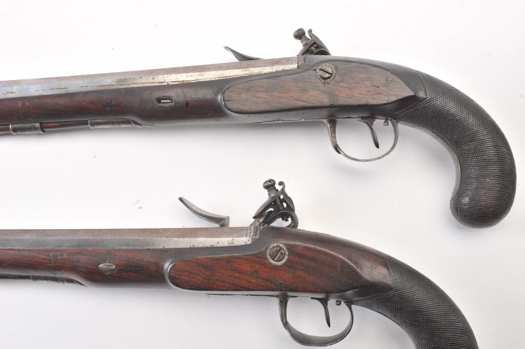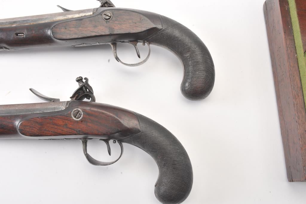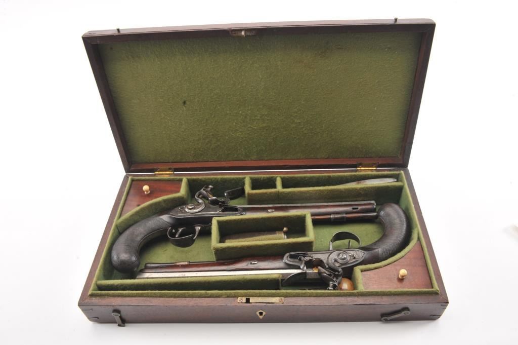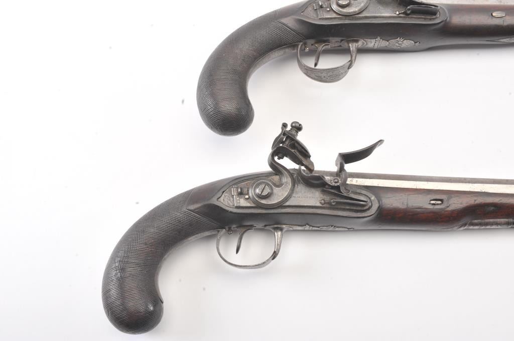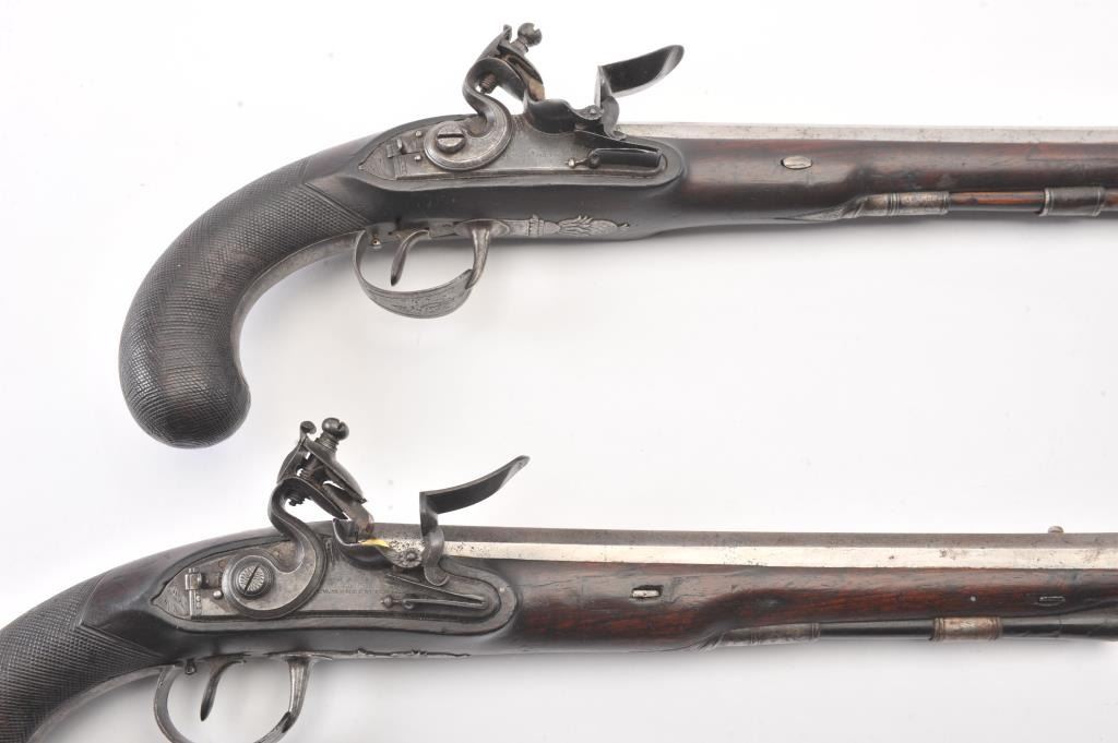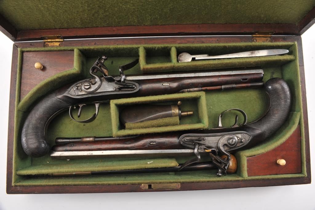 Pair of flintlock dueling pistols by H.W. Mortimer London circa 1790 to early 1800s cased with accessories. Measures 15” overall with a 9 7/8” octagon barrel of .60 caliber smoothbore with full stocks and checkeredgrip. Original flintlock with correct parts. Gold touch holes. Good overall condition with natural patina and hints of case colors in brown on the locks. The trigger guard engraving is fairly sharp but no finishremains. The grip and stocks are good to very good with a little wear to the checkering. Original rods and set triggers. The case is a very old re-line done in Britain probably later in 19th century and very good plus with minor discoloration. The exterior of oak case is good with normal cracks and scratches with carry ring and proper hardware. A nice original set by a premier maker. (Antique) Est.: $6,000-$12,000