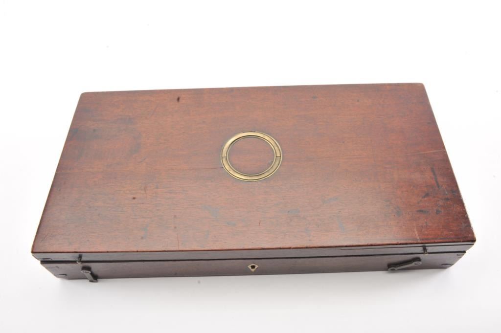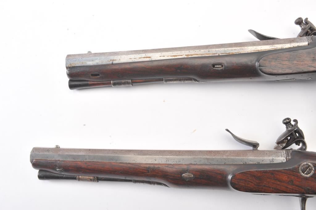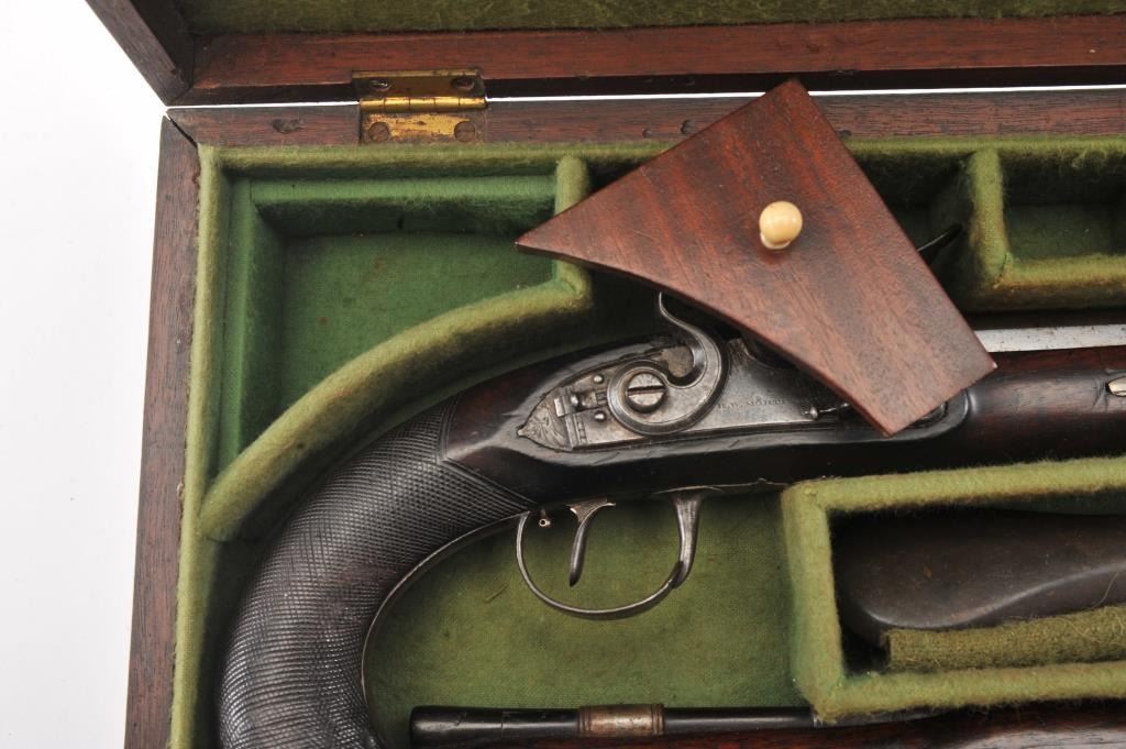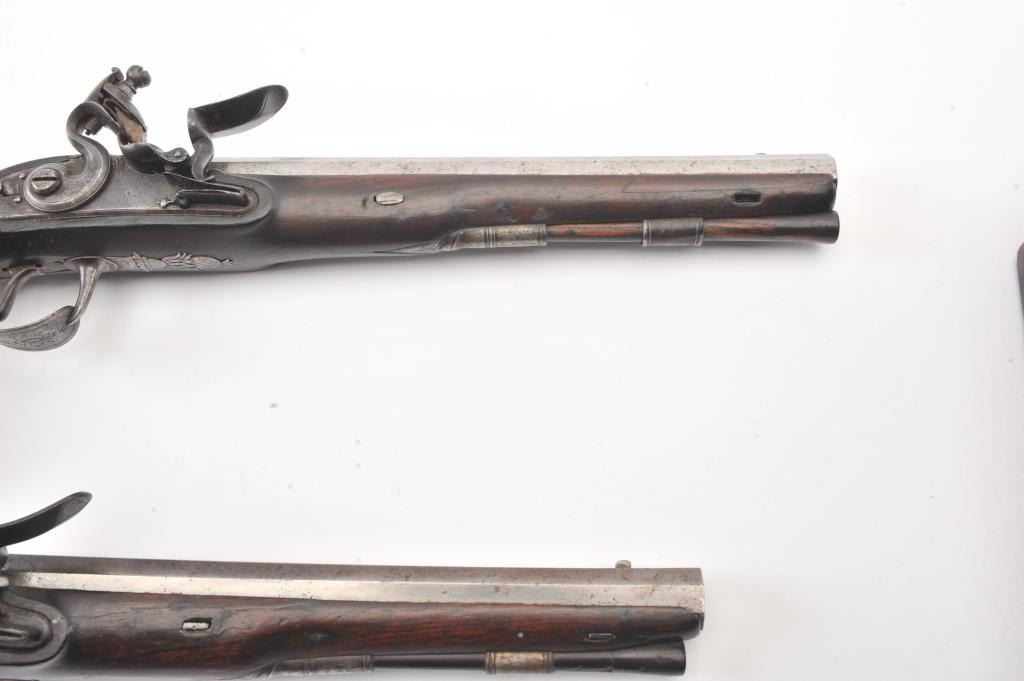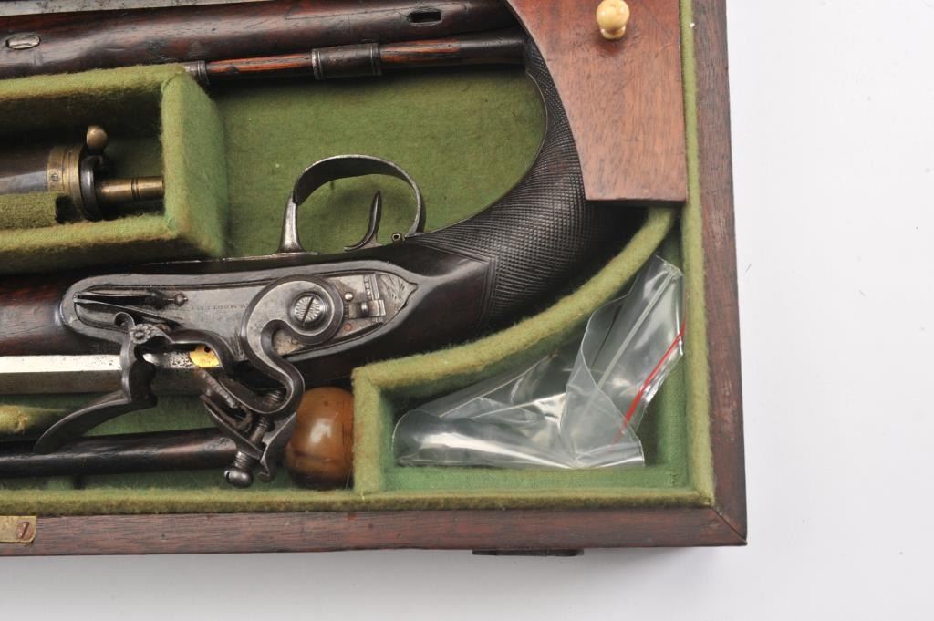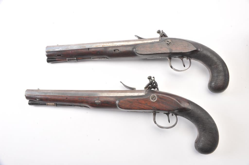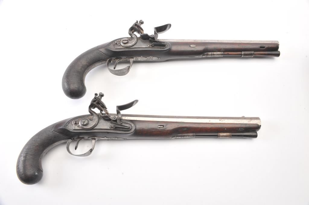 Pair of flintlock dueling pistols by H.W. Mortimer London circa 1790 to early 1800s cased with accessories. Measures 15” overall with a 9 7/8” octagon barrel of .60 caliber smoothbore with full stocks and checkeredgrip. Original flintlock with correct parts. Gold touch holes. Good overall condition with natural patina and hints of case colors in brown on the locks. The trigger guard engraving is fairly sharp but no finishremains. The grip and stocks are good to very good with a little wear to the checkering. Original rods and set triggers. The case is a very old re-line done in Britain probably later in 19th century and very good plus with minor discoloration. The exterior of oak case is good with normal cracks and scratches with carry ring and proper hardware. A nice original set by a premier maker. (Antique) Est.: $6,000-$12,000