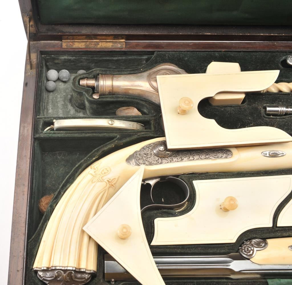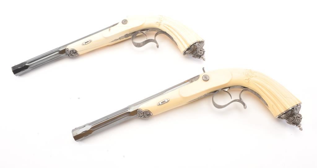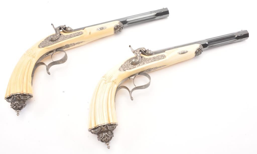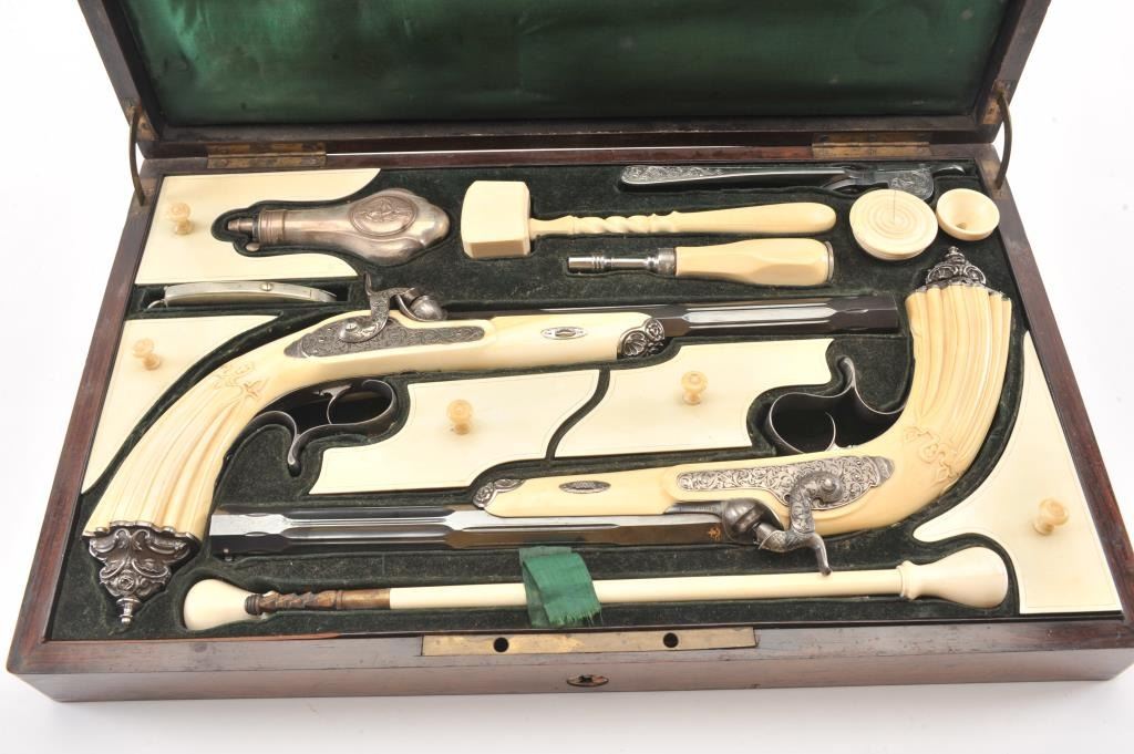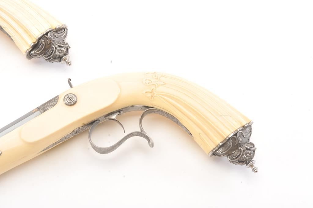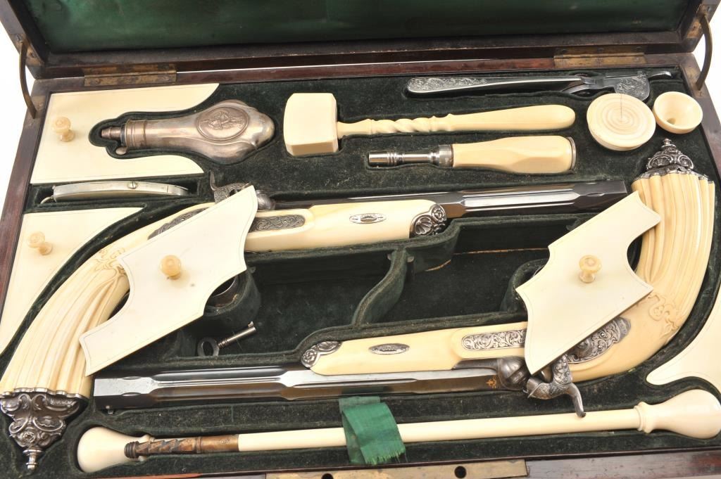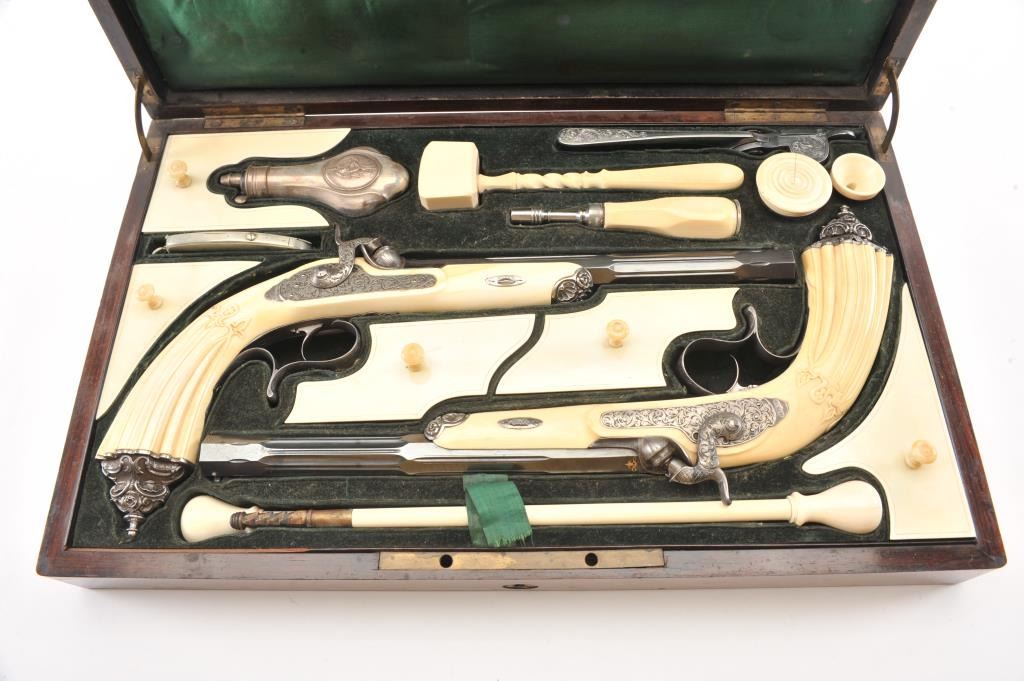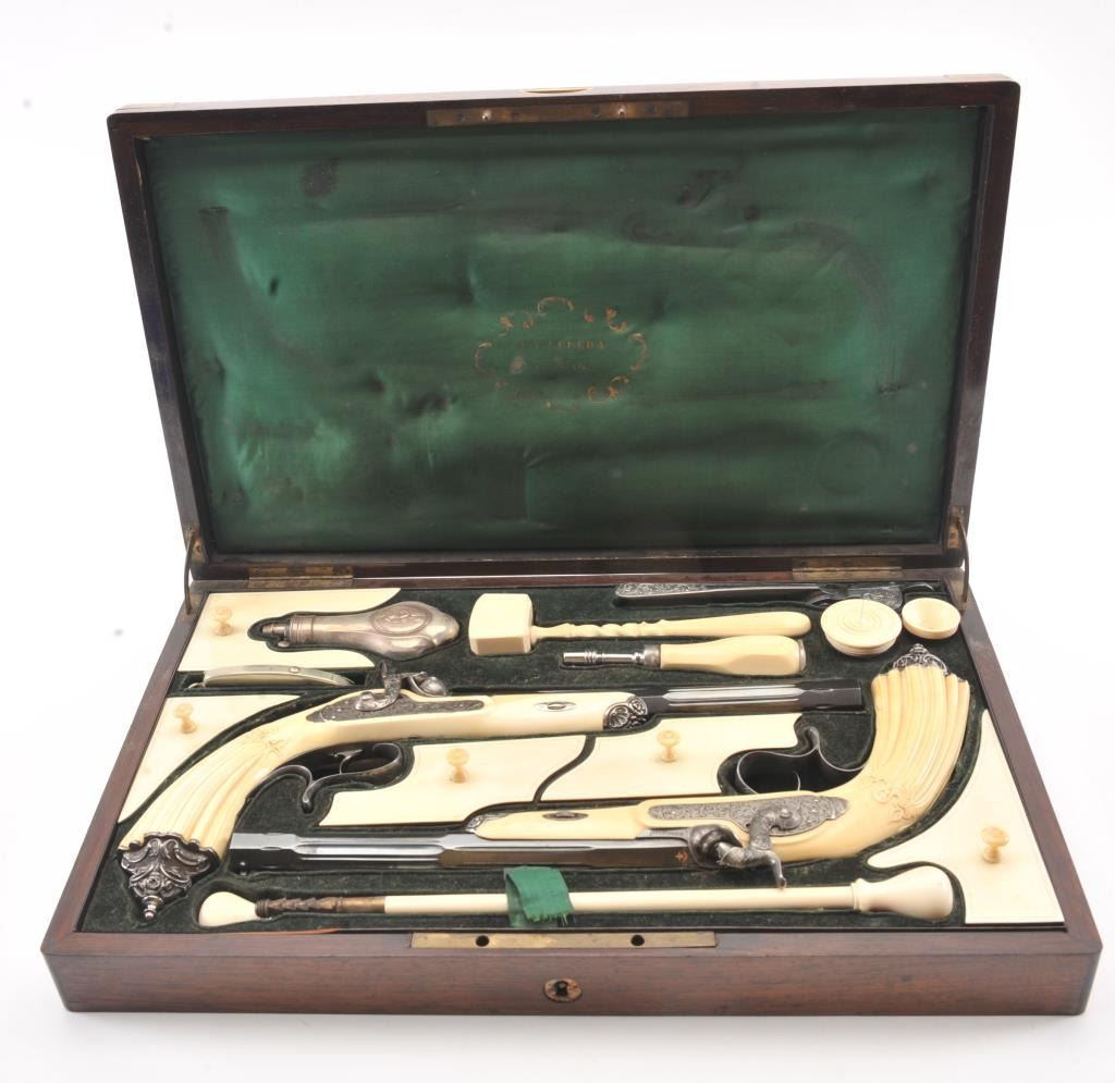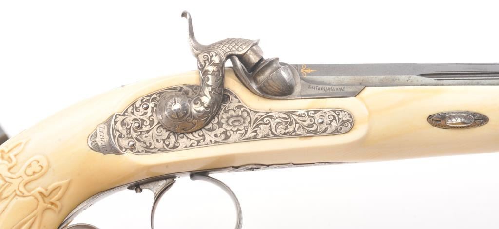 Cased pair of exhibition quality 19th century percussion pistol with “A.F. Lebeda” in gold on the barrels and in the lid of the case. Fancy engraved locks and gold inlaid fluted barrels. Fluted and carved ivory stocks withfancy silver fore ends and butt caps. Ornately cased with engraved old and deluxe full complement of accessories. Satin lining in lid with gold embossed maker’s name. The pistols and case are I fine to excellentcondition. The exterior of case is veneered select grain hardwood with fancy brass inlay and mounts remaining in very good condition with minor imperfections. A great set by a premier maker. (Antique) Est.: $8,000-$16,000