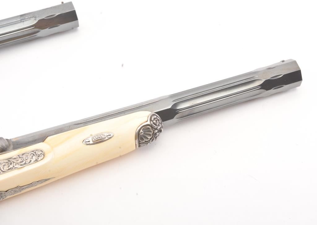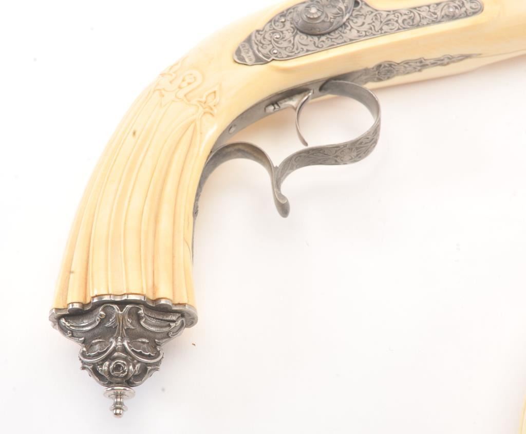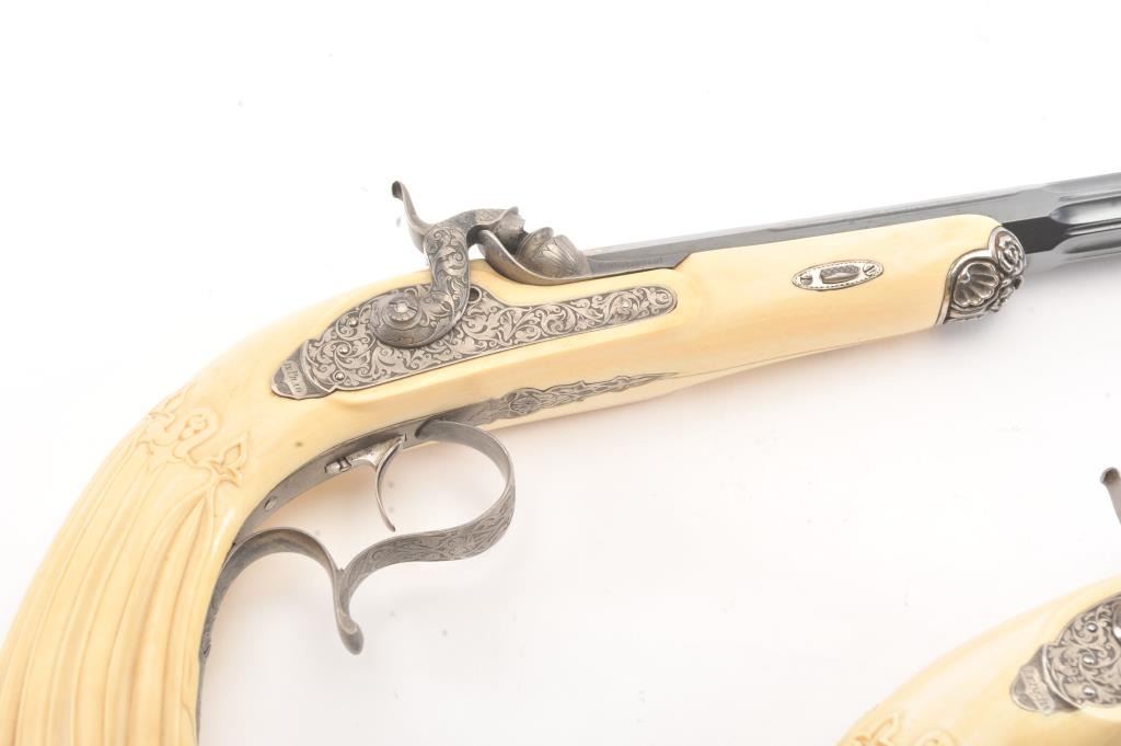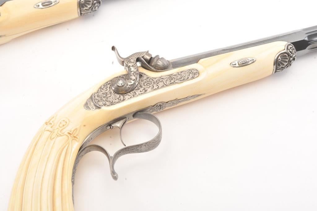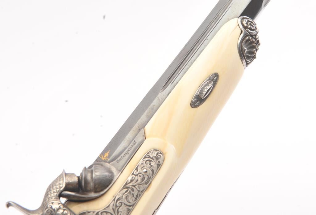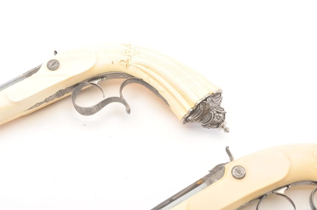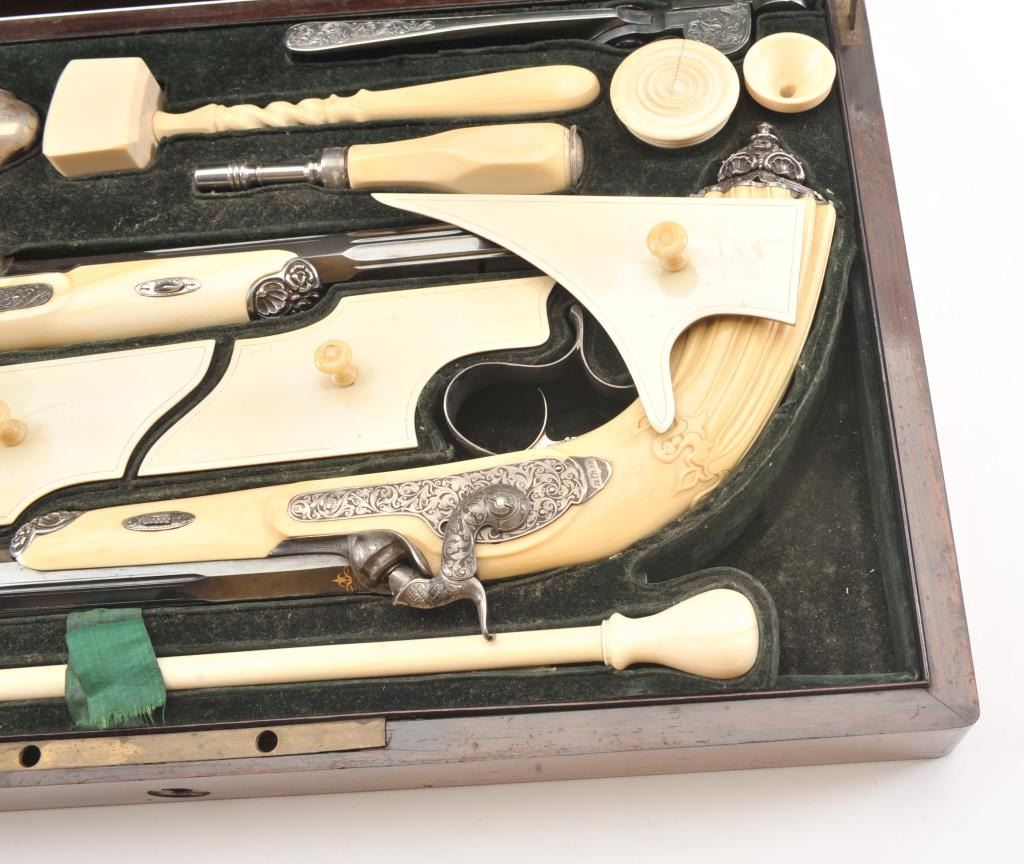 Cased pair of exhibition quality 19th century percussion pistol with “A.F. Lebeda” in gold on the barrels and in the lid of the case. Fancy engraved locks and gold inlaid fluted barrels. Fluted and carved ivory stocks withfancy silver fore ends and butt caps. Ornately cased with engraved old and deluxe full complement of accessories. Satin lining in lid with gold embossed maker’s name. The pistols and case are I fine to excellentcondition. The exterior of case is veneered select grain hardwood with fancy brass inlay and mounts remaining in very good condition with minor imperfections. A great set by a premier maker. (Antique) Est.: $8,000-$16,000