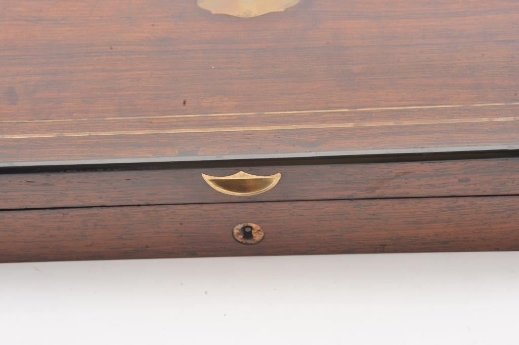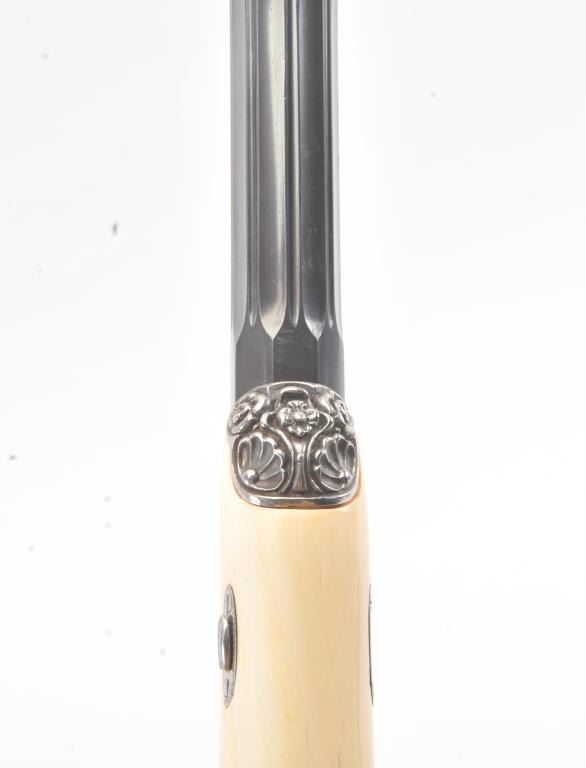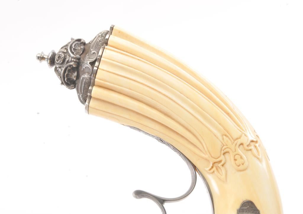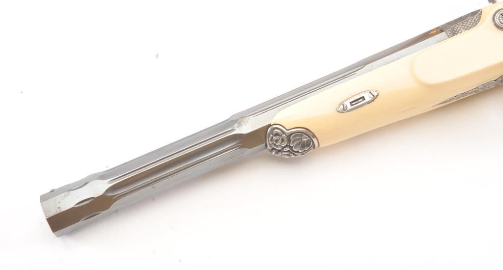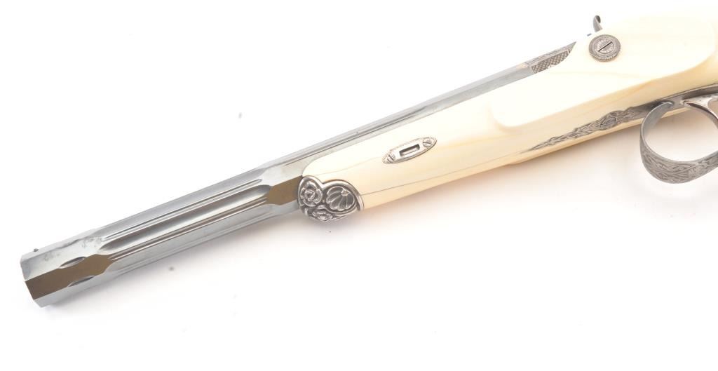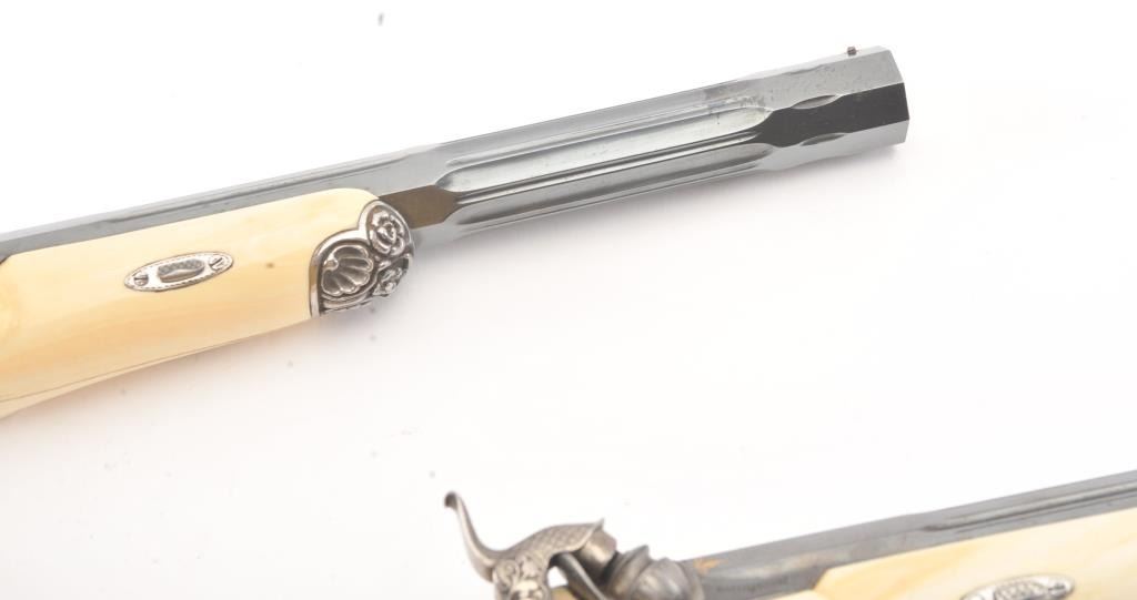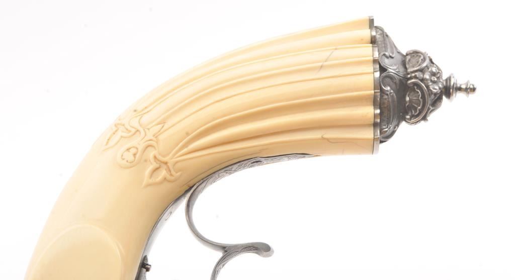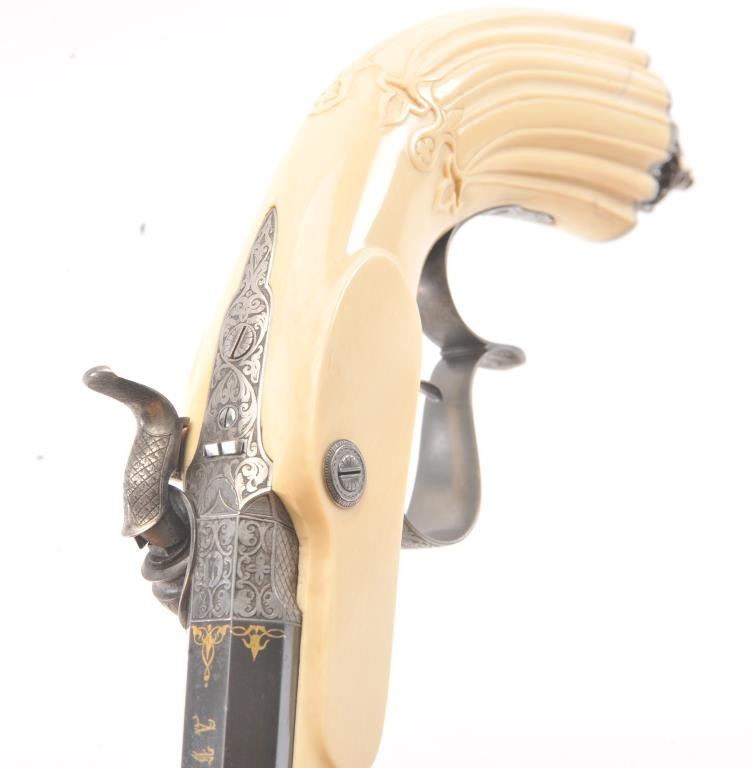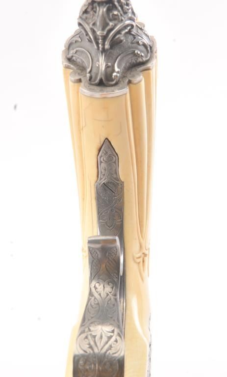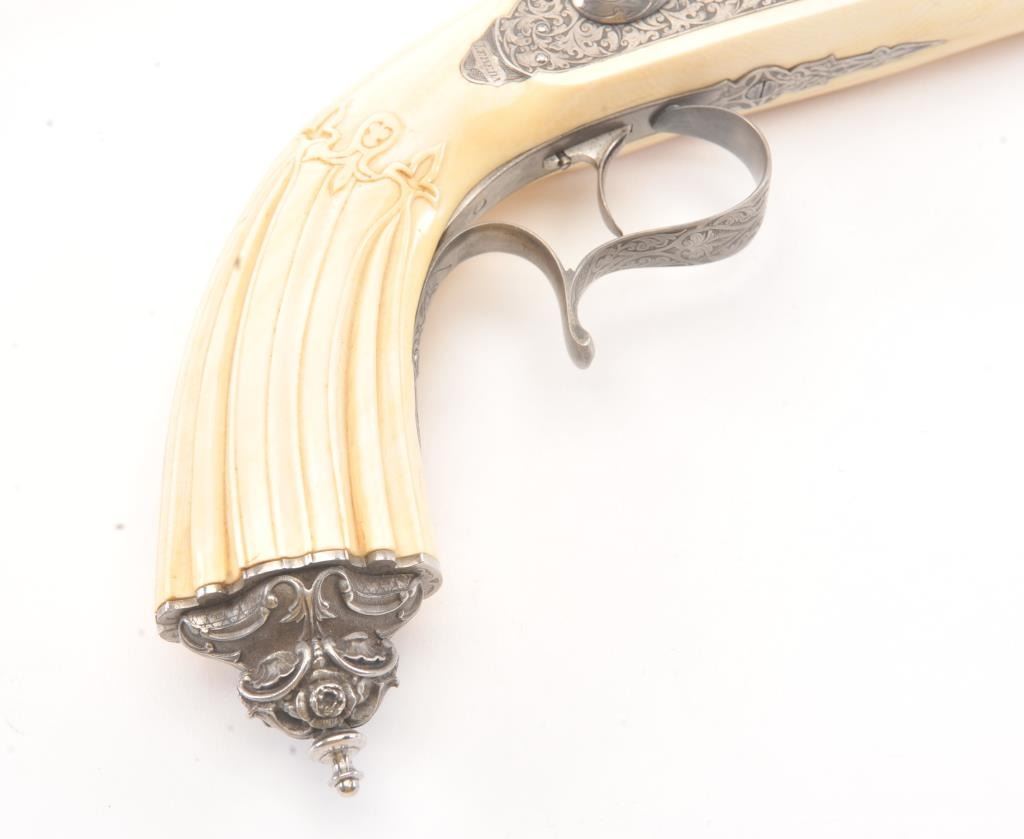 Cased pair of exhibition quality 19th century percussion pistol with “A.F. Lebeda” in gold on the barrels and in the lid of the case. Fancy engraved locks and gold inlaid fluted barrels. Fluted and carved ivory stocks withfancy silver fore ends and butt caps. Ornately cased with engraved old and deluxe full complement of accessories. Satin lining in lid with gold embossed maker’s name. The pistols and case are I fine to excellentcondition. The exterior of case is veneered select grain hardwood with fancy brass inlay and mounts remaining in very good condition with minor imperfections. A great set by a premier maker. (Antique) Est.: $8,000-$16,000