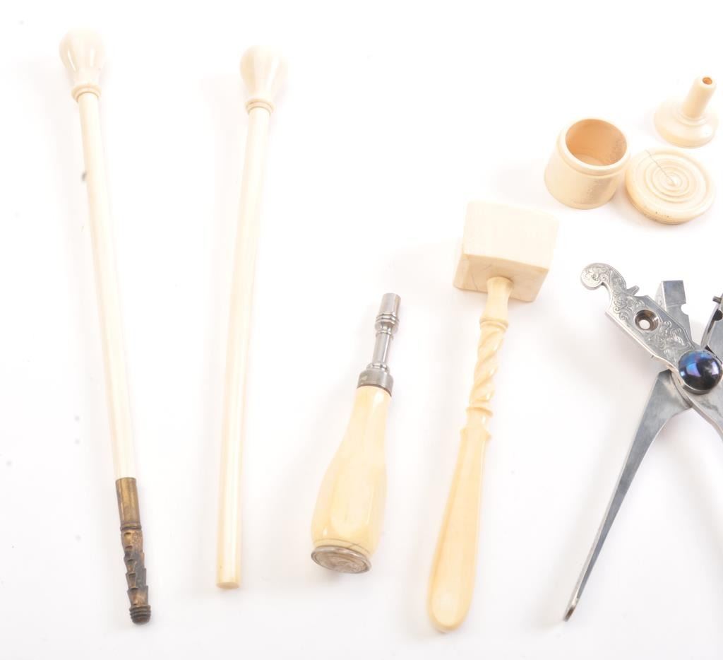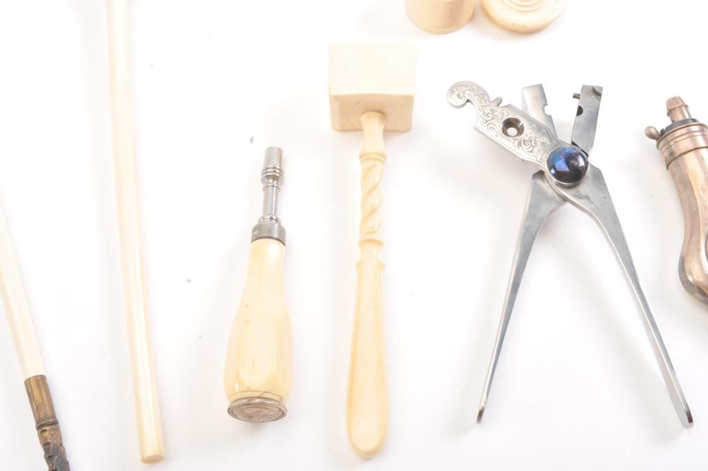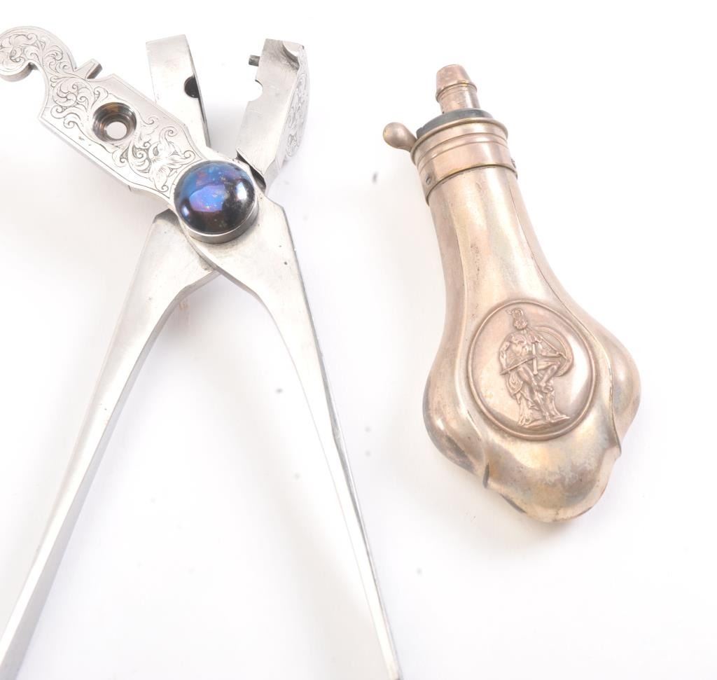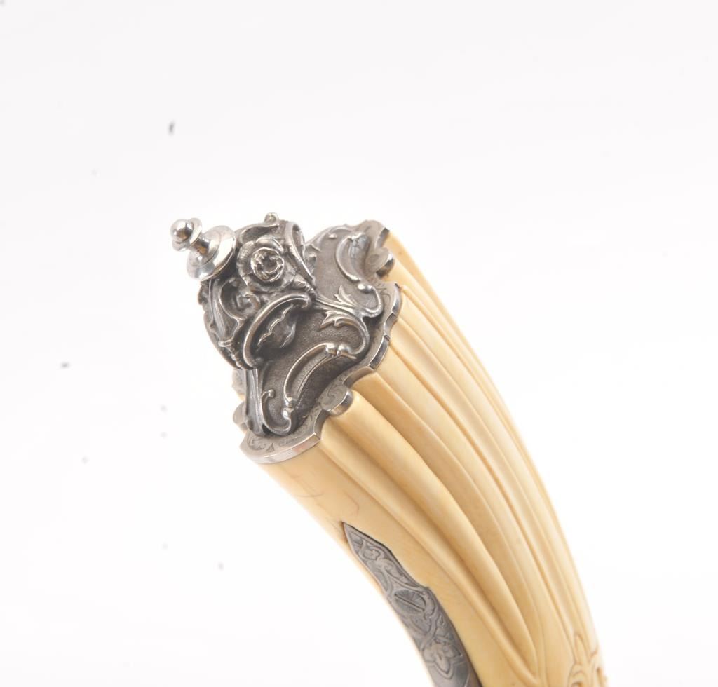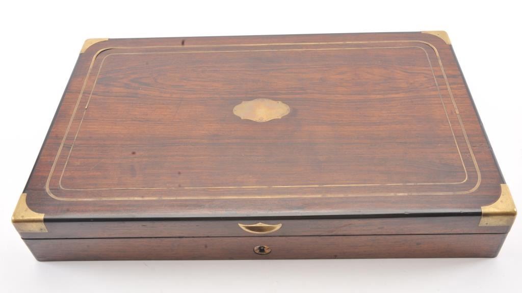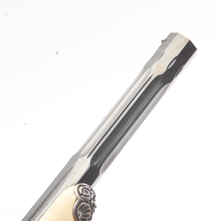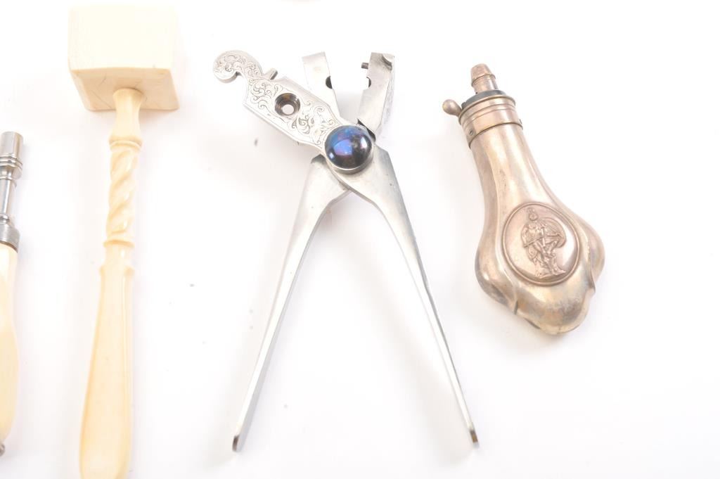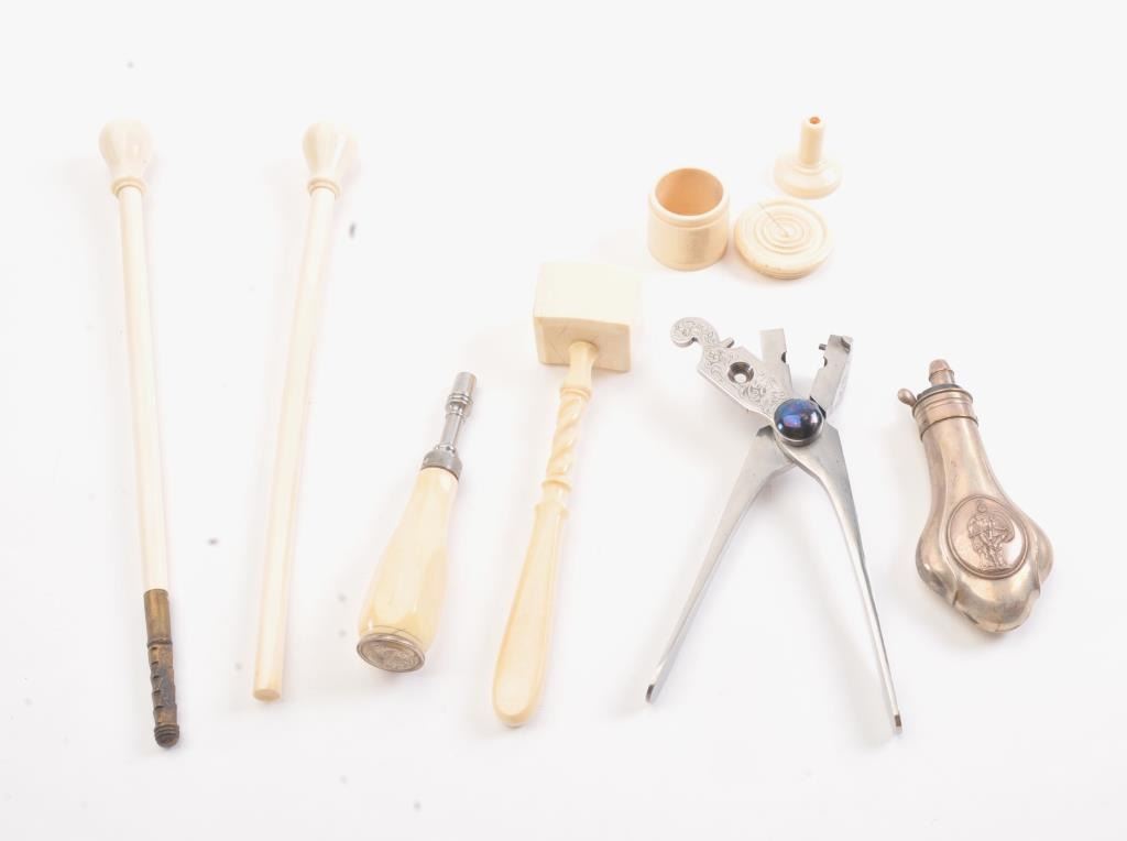 Cased pair of exhibition quality 19th century percussion pistol with “A.F. Lebeda” in gold on the barrels and in the lid of the case. Fancy engraved locks and gold inlaid fluted barrels. Fluted and carved ivory stocks withfancy silver fore ends and butt caps. Ornately cased with engraved old and deluxe full complement of accessories. Satin lining in lid with gold embossed maker’s name. The pistols and case are I fine to excellentcondition. The exterior of case is veneered select grain hardwood with fancy brass inlay and mounts remaining in very good condition with minor imperfections. A great set by a premier maker. (Antique) Est.: $8,000-$16,000