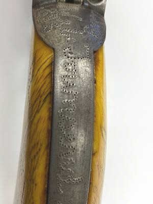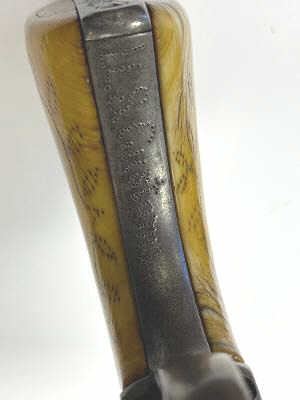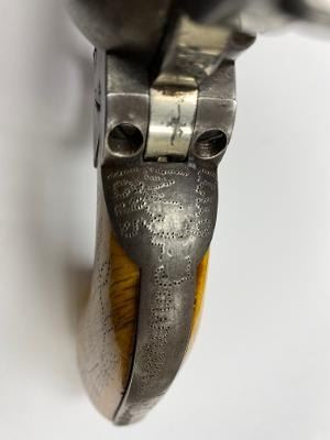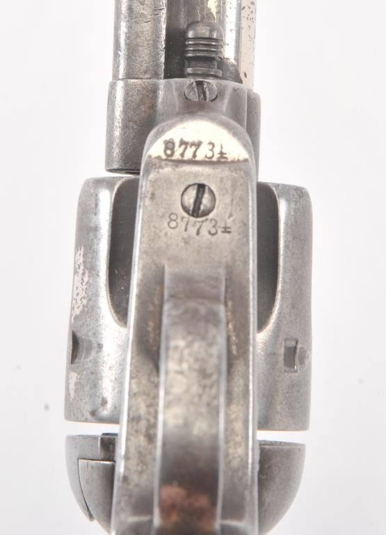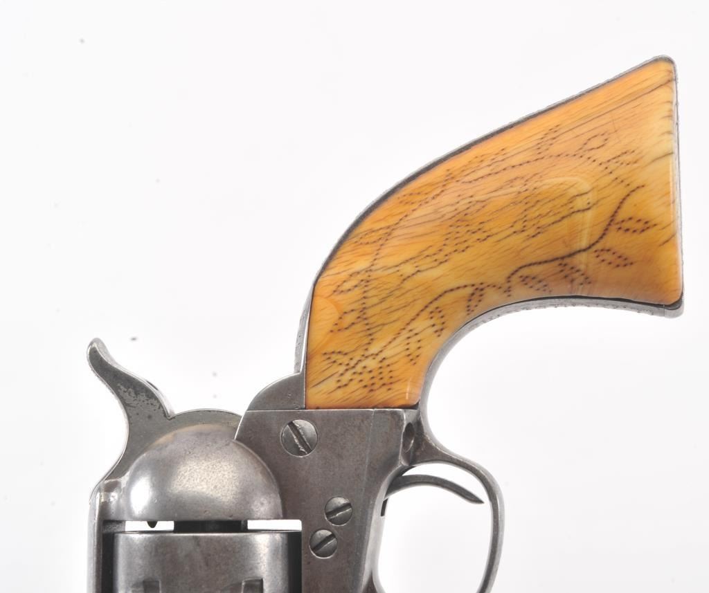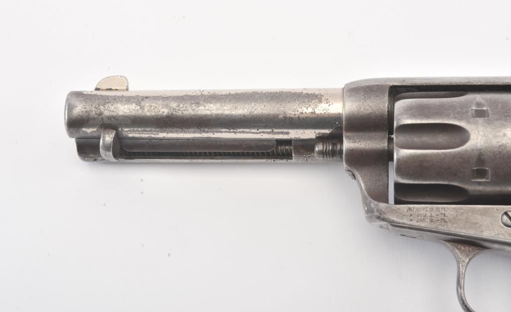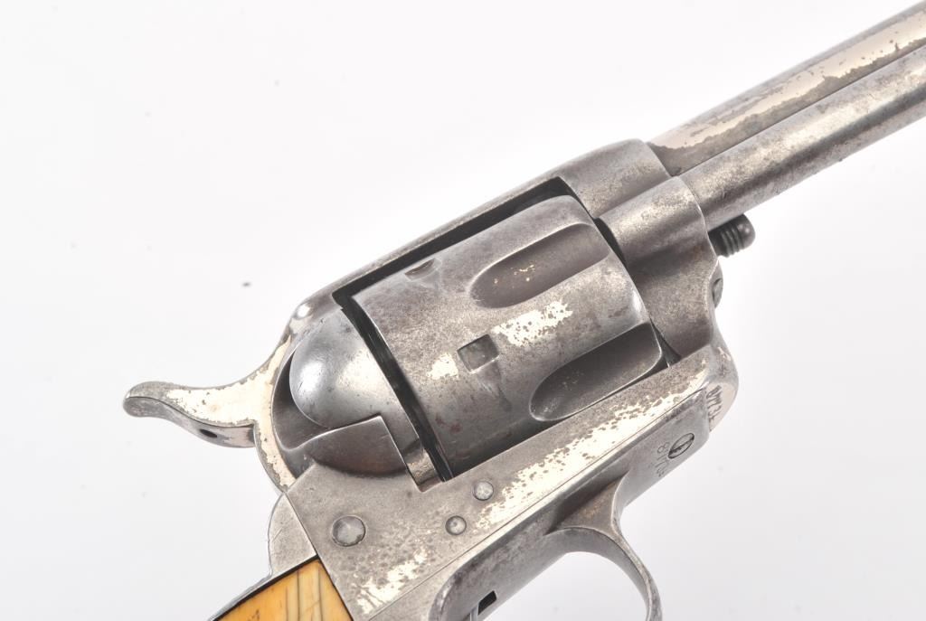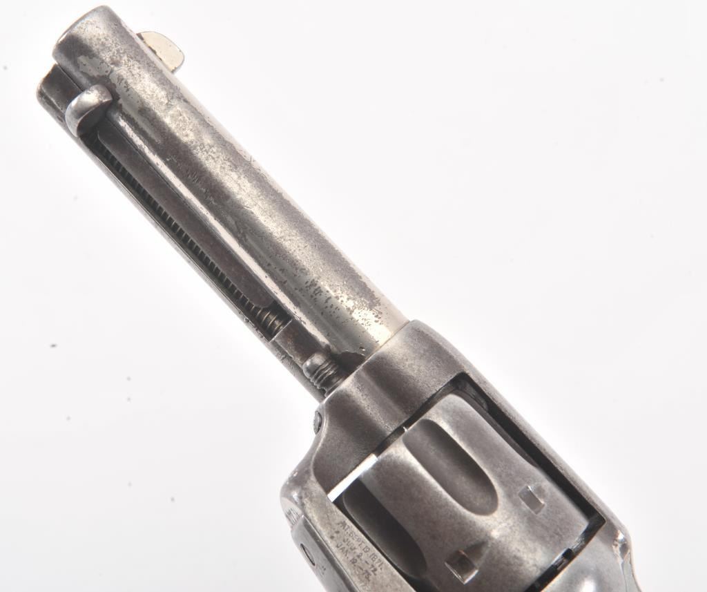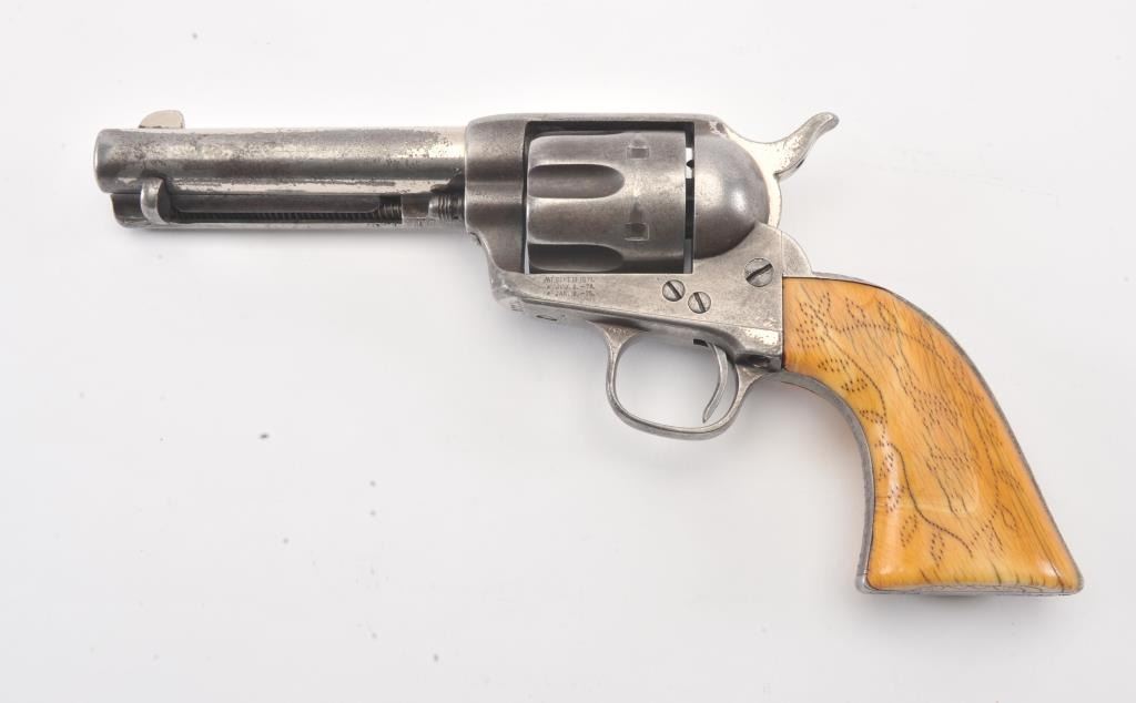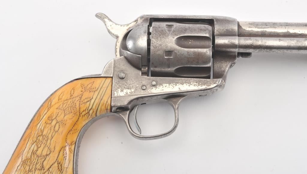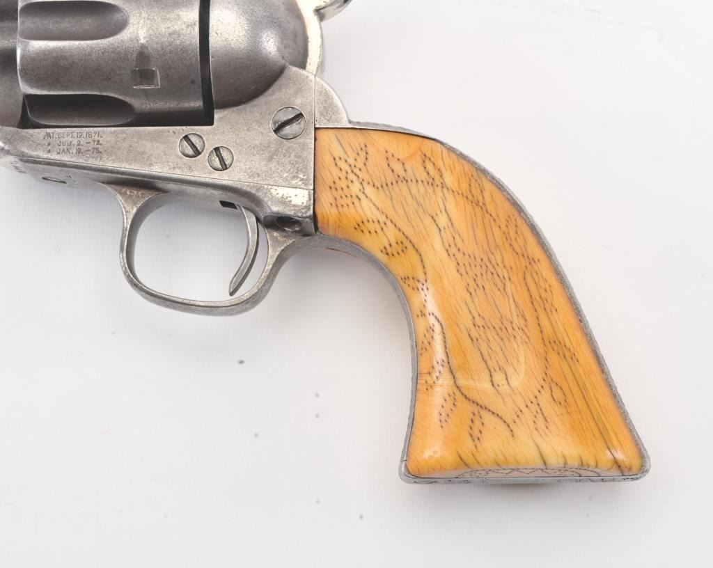 Important Colt SAA revolver, .45 caliber, 4.75” barrel, nickel finish, period decorated ivory grips, S/N 87734 (ca. 1883), with punch dot inscription on straps starting at top of back strap “W. W. Townsend to E. E. Townsend” and on butt “Mttd. Inspctr” with “U.S. Customs” on instrap. The top of the back strap shows “Aug 1895”. Accompanied by an original small “U.S. Inspector of Customs” marked shield badge of the same era. This Colt was recently discovered in an old collection in San Diego, California and upon researching the name E.E. Townsend, another similarly “punch dot” inscribed Colt was found that had been in the Donald Yena Collection, sold at Burley Auction Company as Lot 116 on March 4, 2014. W.W. Townsend was born Jan. 16, 1833, in Madison, Florida. He moved to Texas in 1859 and was instrumental in settling Colorado County. He served as a Captain in Whitefield’s C.S.A. Cavalry where he promoted from Sgt. to Captain after gallant actions and was badly wounded. He was married in 1864 to Maddle Woolsey and moved to Mexico where she died in 1867. After returning to Texas, he re-married Margaret Simmerson and had a son, Everett Ewing Townsend, Born Oct. 20, 1871. E.E. Townsend was a Texas Ranger in the Frontier Battalion, Sheriff, Texas Senator, Park Commissioner, Deputy U.S. Marshal, Customs Inspector and Border Agent. He was known as the “Father of Big Bend Park” for his role in its formation and preservation. This historic Colt displays 15-30% original nickel with the balance gone to a gray patina showing minor pitting and erosion; good markings, good overall; grips aged and undersized with period decorations in florals and geometrics; front sight slightly reduced at top. All matching serial numbers. The included small silver badge reading “U.S. Inspector of Customs” also shows an engraved shield and eagle with some wear and old repairs to the pin and catch on reverse; approximate size 1-1/2” x 1-1/8”. (Antique). Est.: $7,500-$15,000.