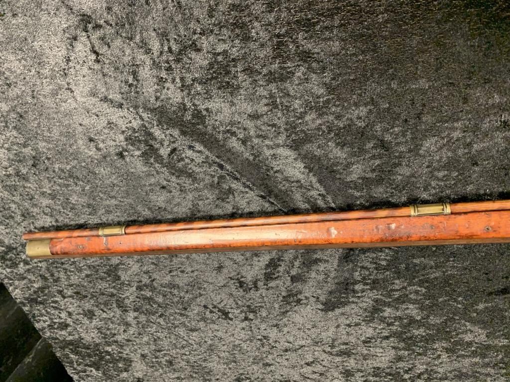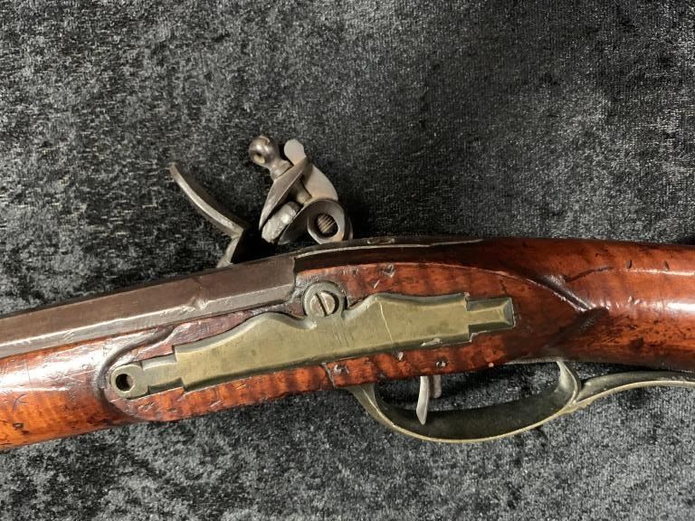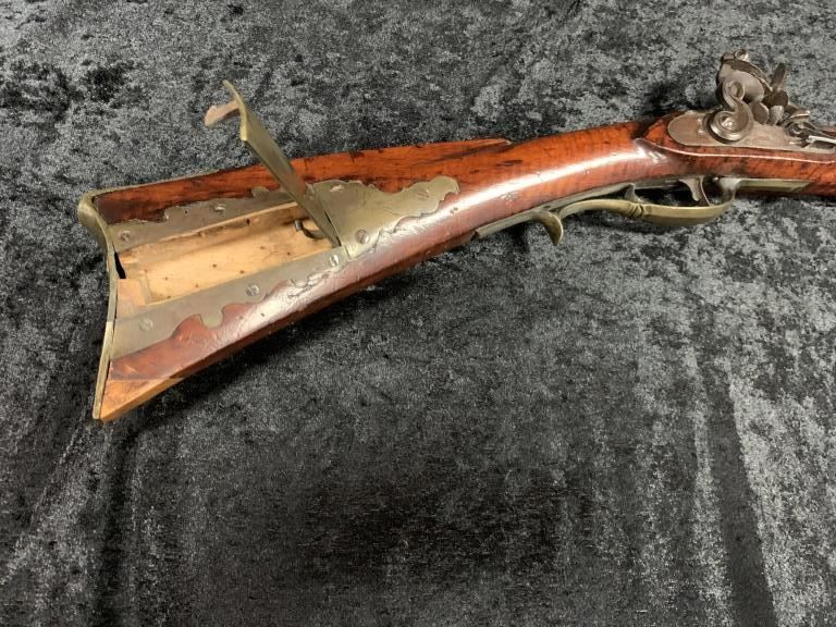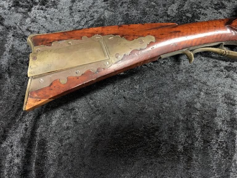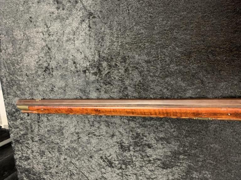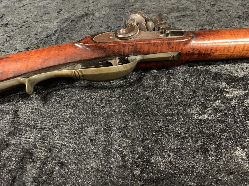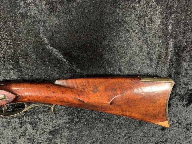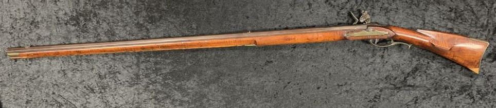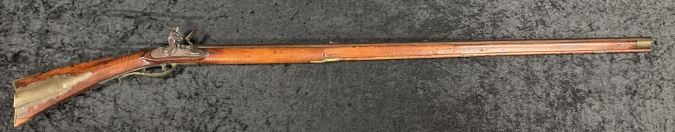 "J.P. Beck" signed flintlock "Kentucky" style rifle with lock marked "J. Goulcher". Plain brass patch box with single trigger and lock secured by 2 screws. Waterproof late flintlock showing good marriage to thisrifle. Repair to toe. Measures 48" overall with a 43" barrel. Approximately .50 caliber smoothbore with patch box door bent. Most likely a barrel and box saved from earlier rifle and retasked. (Antique) Est.:$1000-$2000