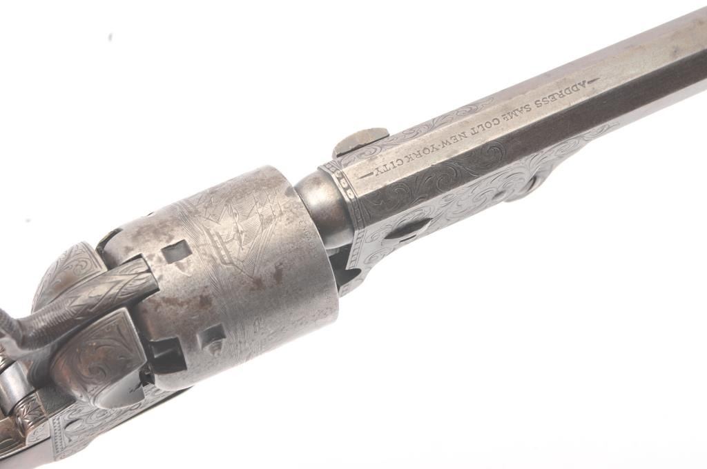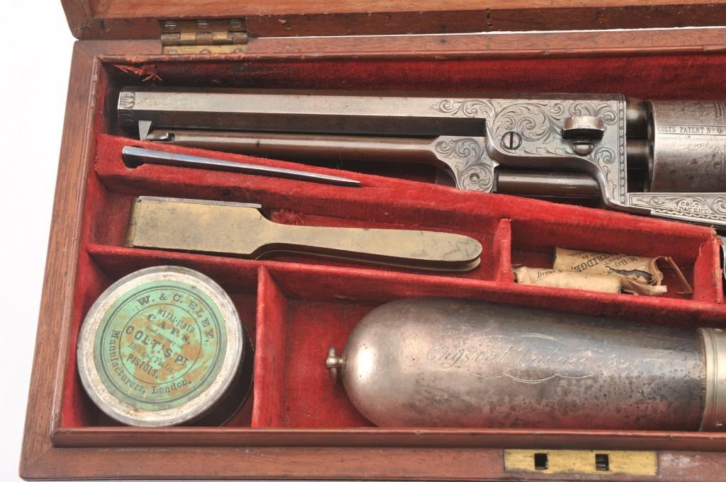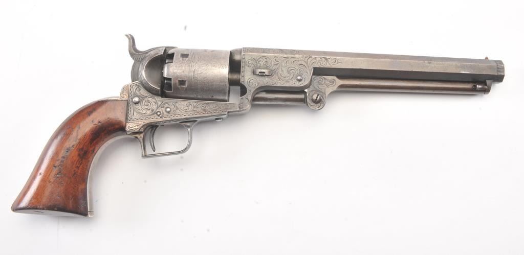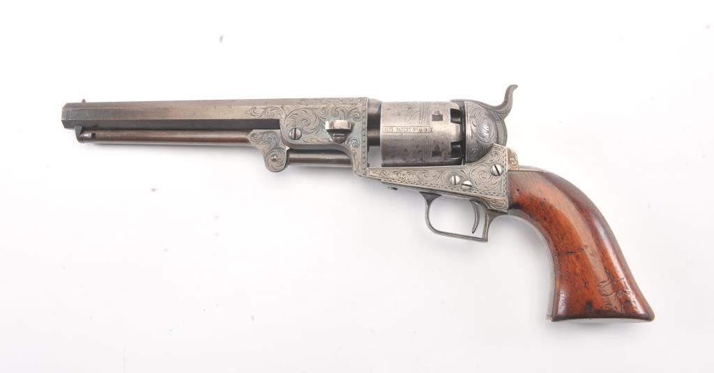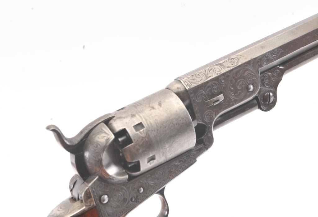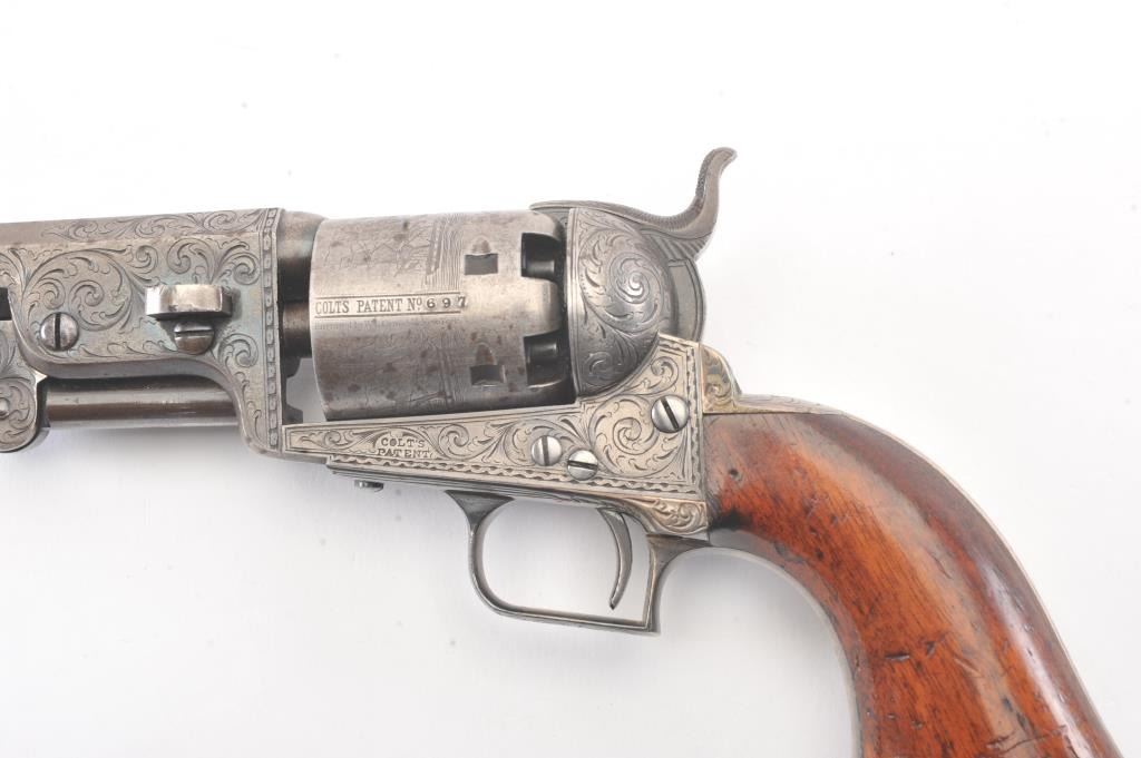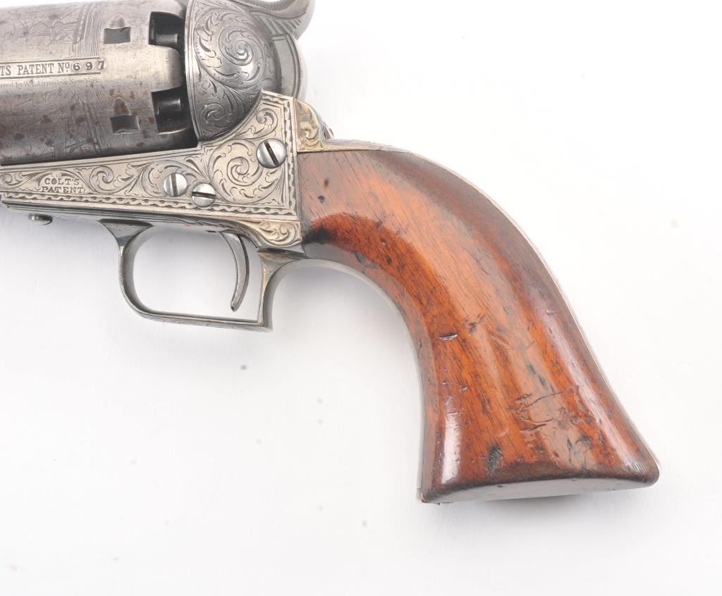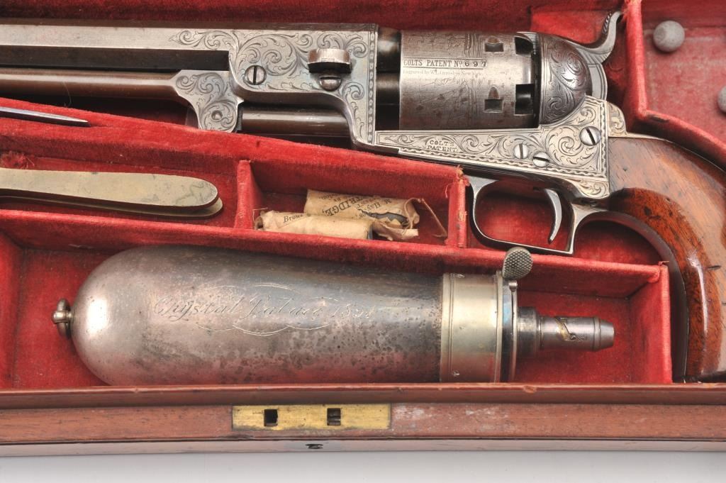 Colt 1851 Navy 1st Model Revolver Factory engraved with rare wedge over screw variation, S/N 697 and made for Crystal Palace exhibition. Among the rarest and most desirable of all engraved percussion colt experts estimate less than a dozen of the wedge over screw variation were produced likely for display at the Crystal Palace exhibition where Colt introduced the new 1851 Model Navy revolver. The subject revolver is engraved in the early open vine scroll motif and remains in very good plus condition with approximately 30%-50% original blue on the barrel that has aged evenly with sharp edges and good markings. The cylinder shows almost all of its scene with clear engagement dates and Ornsby signature. The cylinder is a gray patina with a few small areas of erosion and spotting from age. The frame, hammer and loading lever show 30%-50% early smoky gray case hardening with some light colors in the patina. The straps show most of the original silver plate which is thick and uncleaned. The grips are also very good plus with 75%-85% original varnish showing minor scratches, dings, mars and very small losses at the toes. The grips fit impeccably. Crisp and sharp markings with all matching serial numbers. Contained with an original English style partition case with label in the lid. The red lined velveteen interior is very good plus with minor aging, small tatters and normal impressions. The silver plated flask shows period inscription “Crystal Palace” in script. A good mold, nipple wrench and cap tin are included. Also an enameled pin which purportedly was gifted by Colt at the Crystal Palace exhibition is included with this lot.