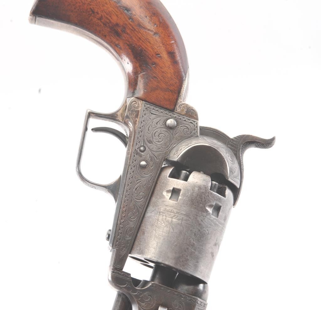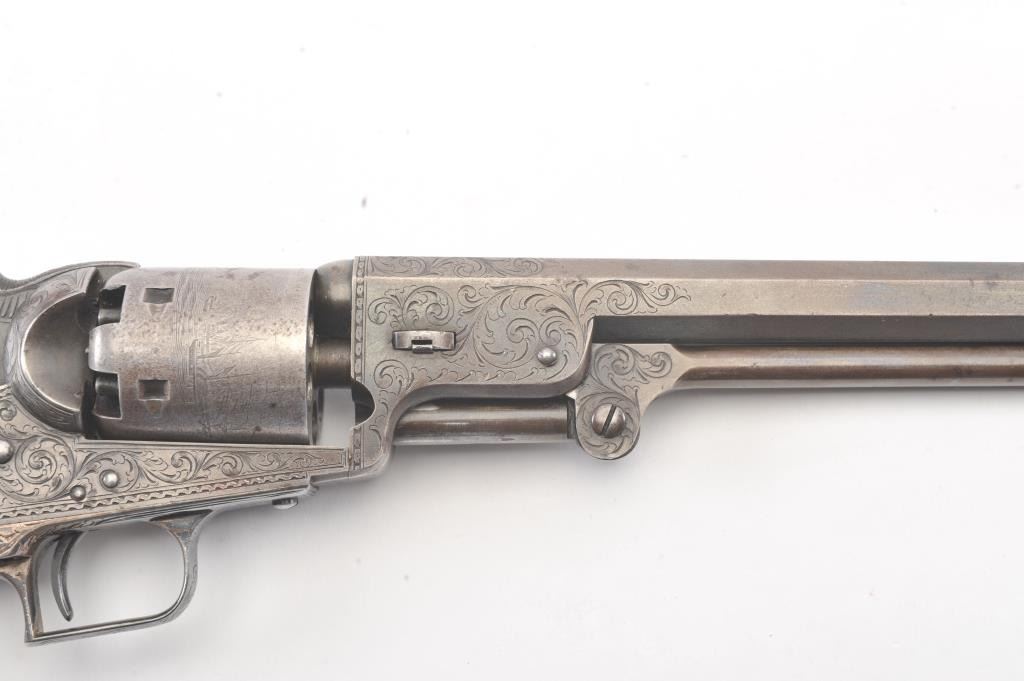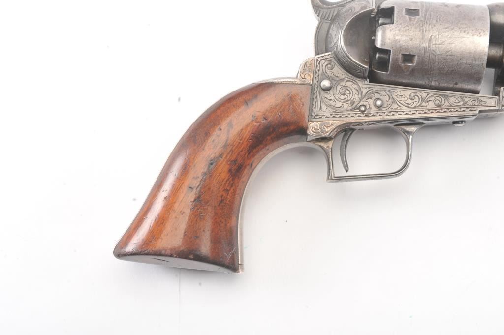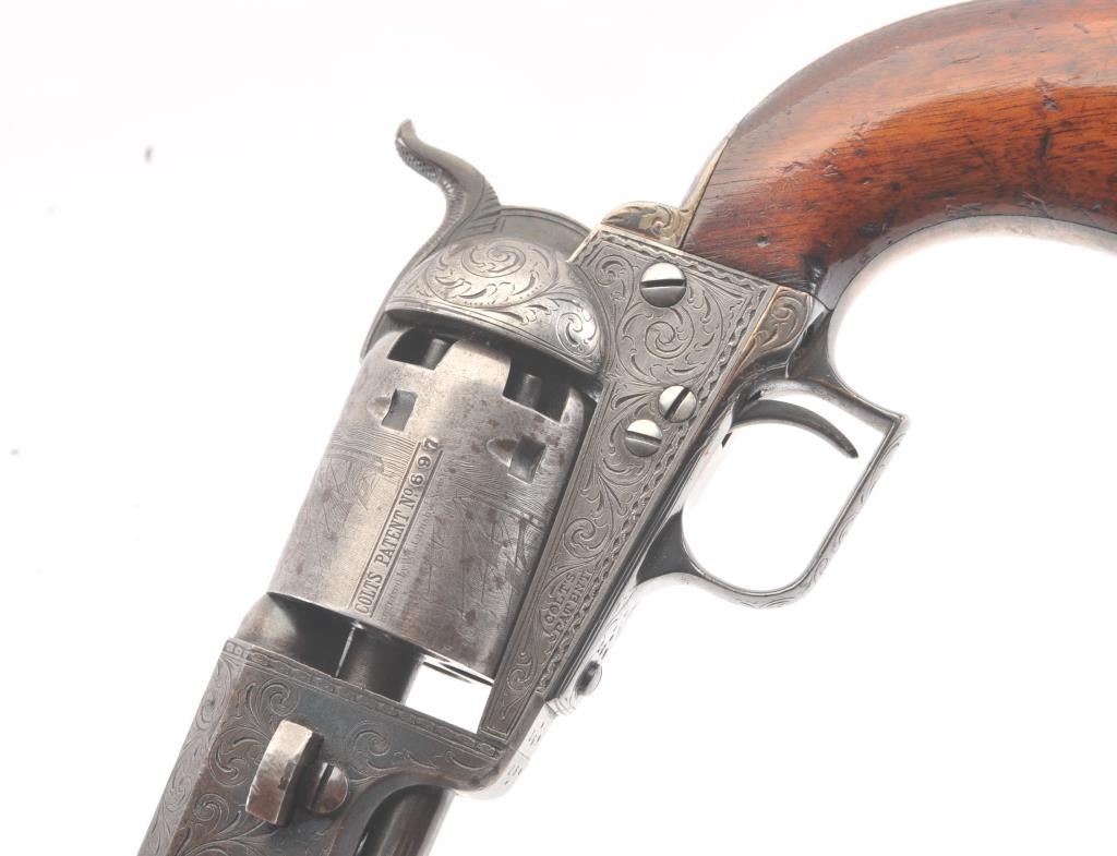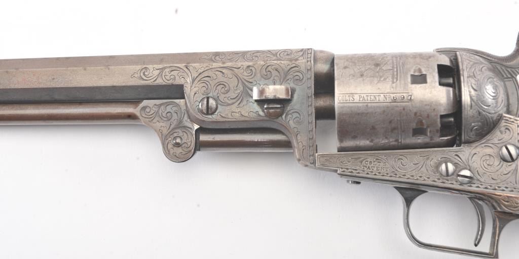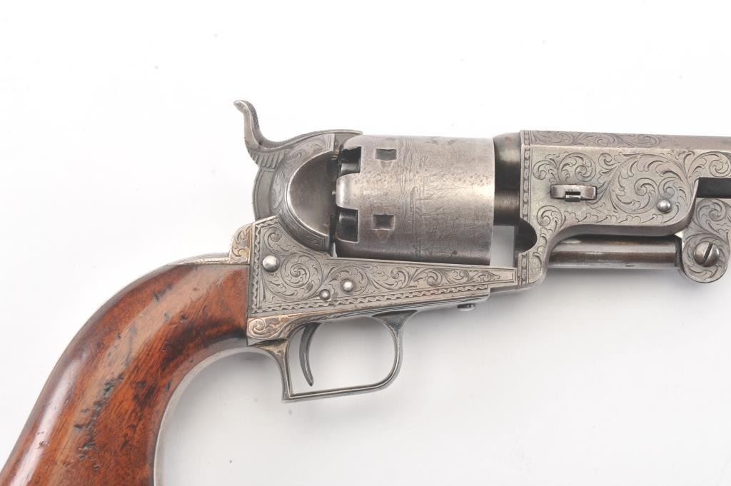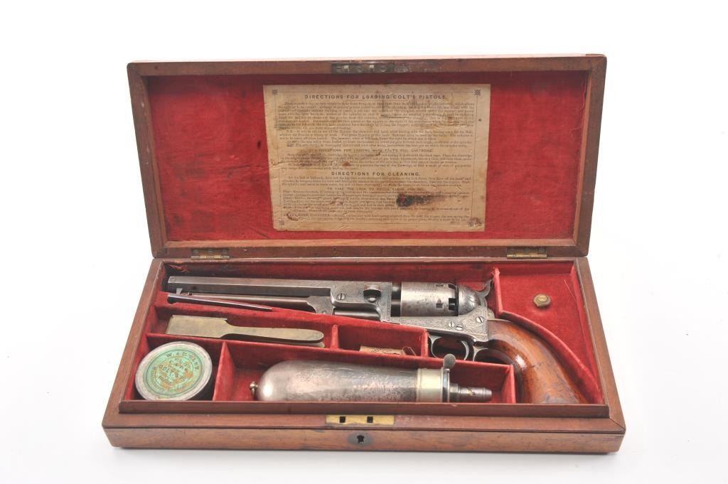 Colt 1851 Navy 1st Model Revolver Factory engraved with rare wedge over screw variation, S/N 697 and made for Crystal Palace exhibition. Among the rarest and most desirable of all engraved percussion colt experts estimate less than a dozen of the wedge over screw variation were produced likely for display at the Crystal Palace exhibition where Colt introduced the new 1851 Model Navy revolver. The subject revolver is engraved in the early open vine scroll motif and remains in very good plus condition with approximately 30%-50% original blue on the barrel that has aged evenly with sharp edges and good markings. The cylinder shows almost all of its scene with clear engagement dates and Ornsby signature. The cylinder is a gray patina with a few small areas of erosion and spotting from age. The frame, hammer and loading lever show 30%-50% early smoky gray case hardening with some light colors in the patina. The straps show most of the original silver plate which is thick and uncleaned. The grips are also very good plus with 75%-85% original varnish showing minor scratches, dings, mars and very small losses at the toes. The grips fit impeccably. Crisp and sharp markings with all matching serial numbers. Contained with an original English style partition case with label in the lid. The red lined velveteen interior is very good plus with minor aging, small tatters and normal impressions. The silver plated flask shows period inscription “Crystal Palace” in script. A good mold, nipple wrench and cap tin are included. Also an enameled pin which purportedly was gifted by Colt at the Crystal Palace exhibition is included with this lot.