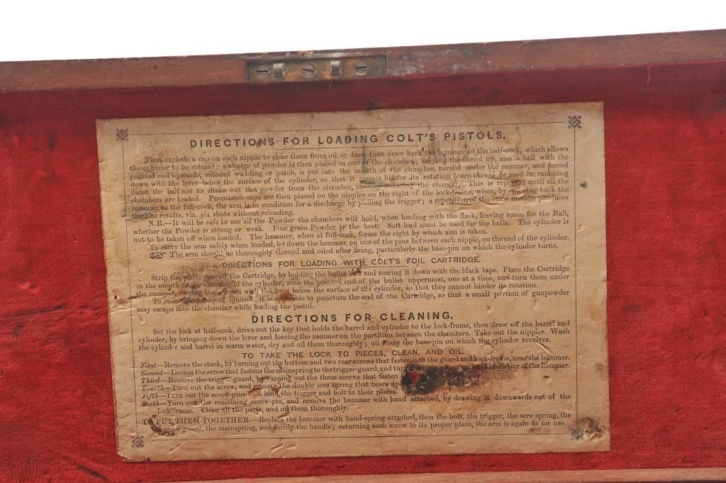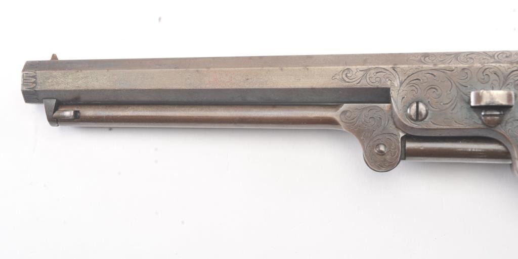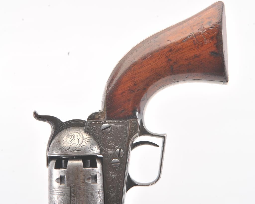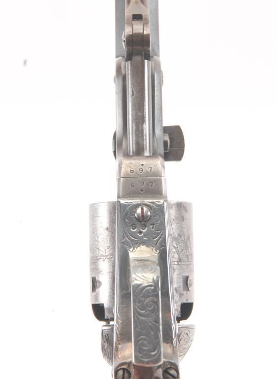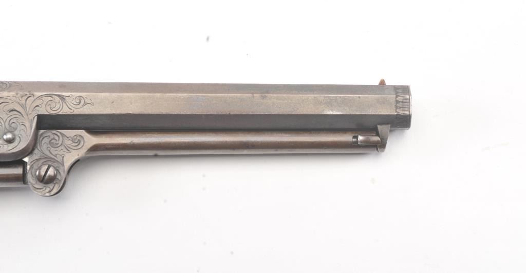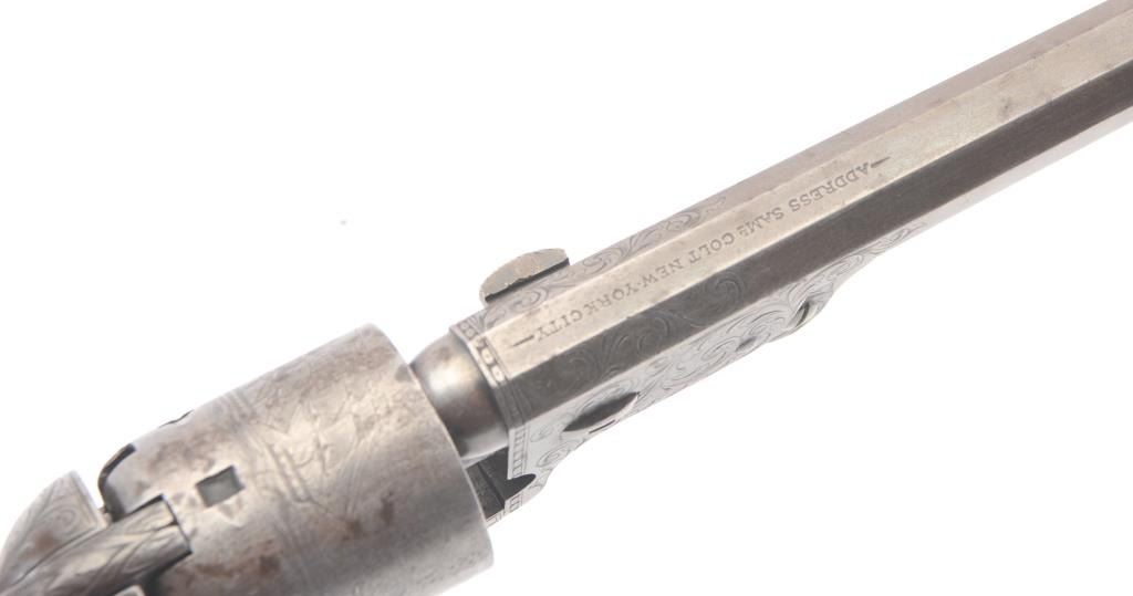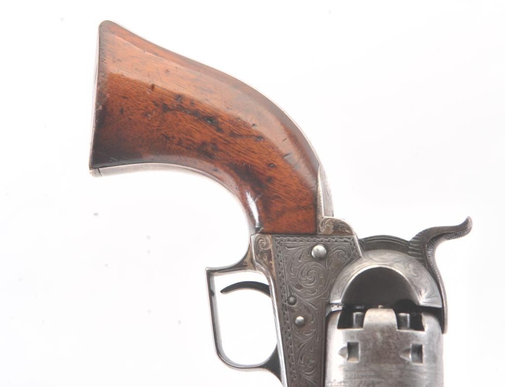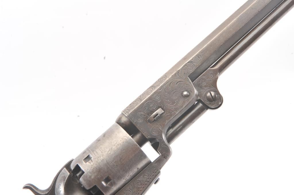 Colt 1851 Navy 1st Model Revolver Factory engraved with rare wedge over screw variation, S/N 697 and made for Crystal Palace exhibition. Among the rarest and most desirable of all engraved percussion colt experts estimate less than a dozen of the wedge over screw variation were produced likely for display at the Crystal Palace exhibition where Colt introduced the new 1851 Model Navy revolver. The subject revolver is engraved in the early open vine scroll motif and remains in very good plus condition with approximately 30%-50% original blue on the barrel that has aged evenly with sharp edges and good markings. The cylinder shows almost all of its scene with clear engagement dates and Ornsby signature. The cylinder is a gray patina with a few small areas of erosion and spotting from age. The frame, hammer and loading lever show 30%-50% early smoky gray case hardening with some light colors in the patina. The straps show most of the original silver plate which is thick and uncleaned. The grips are also very good plus with 75%-85% original varnish showing minor scratches, dings, mars and very small losses at the toes. The grips fit impeccably. Crisp and sharp markings with all matching serial numbers. Contained with an original English style partition case with label in the lid. The red lined velveteen interior is very good plus with minor aging, small tatters and normal impressions. The silver plated flask shows period inscription “Crystal Palace” in script. A good mold, nipple wrench and cap tin are included. Also an enameled pin which purportedly was gifted by Colt at the Crystal Palace exhibition is included with this lot.