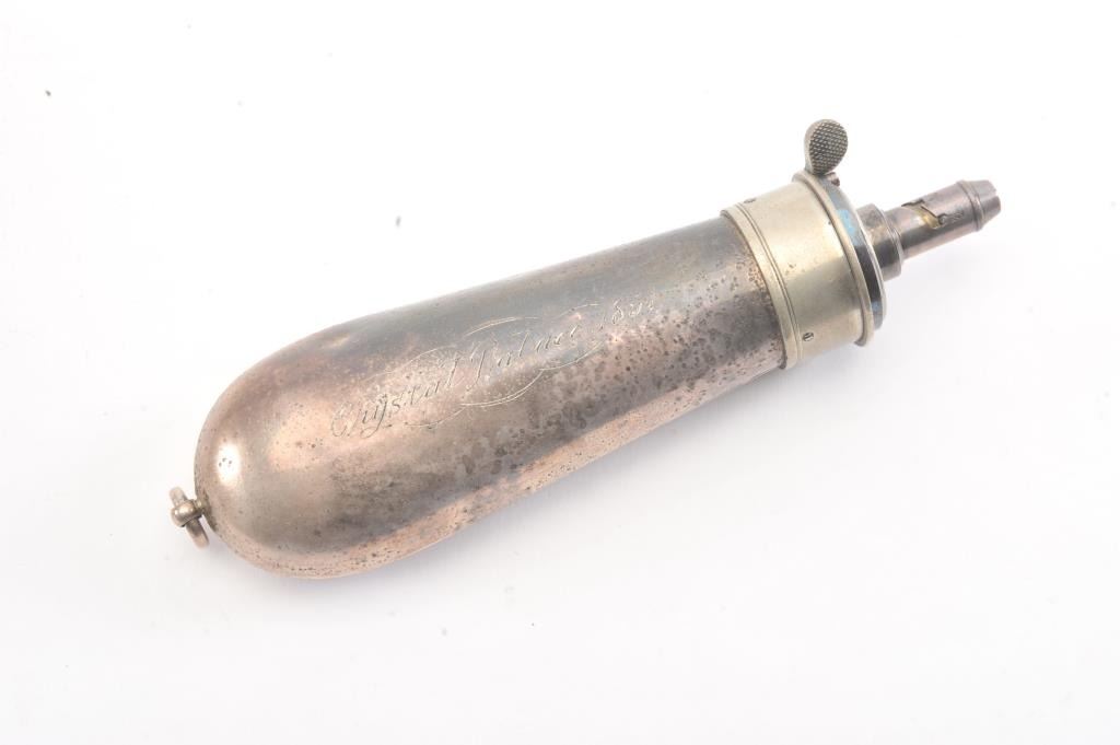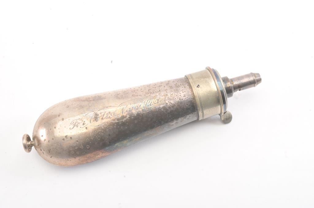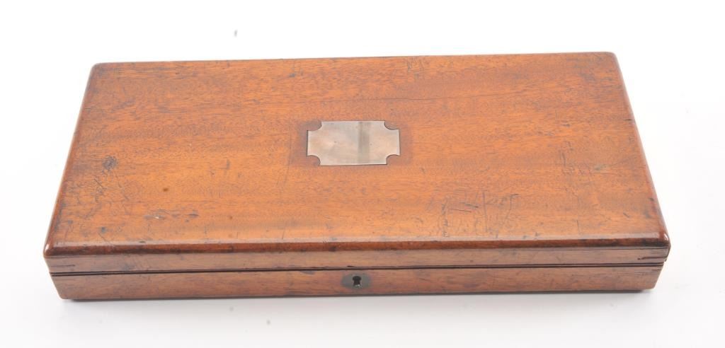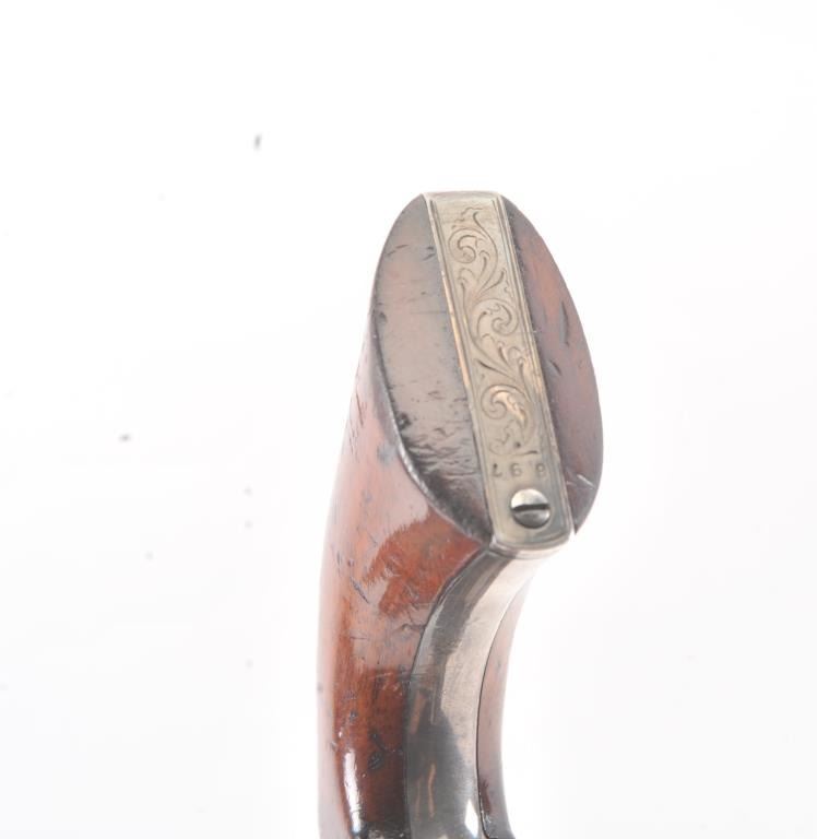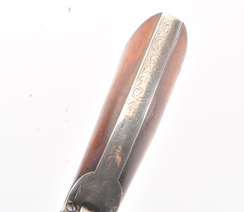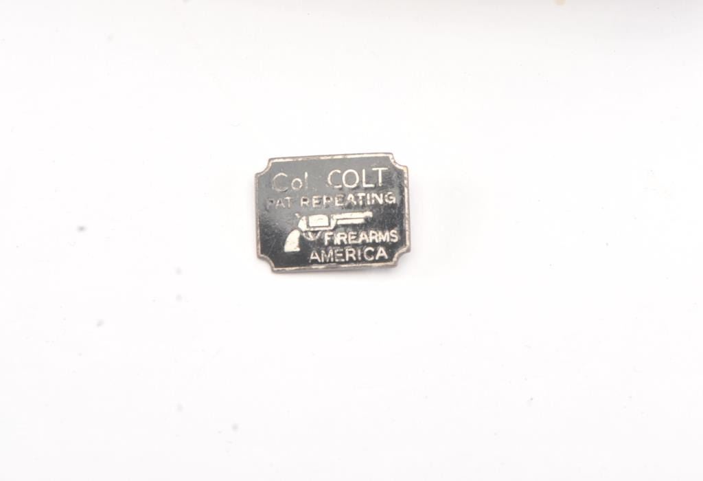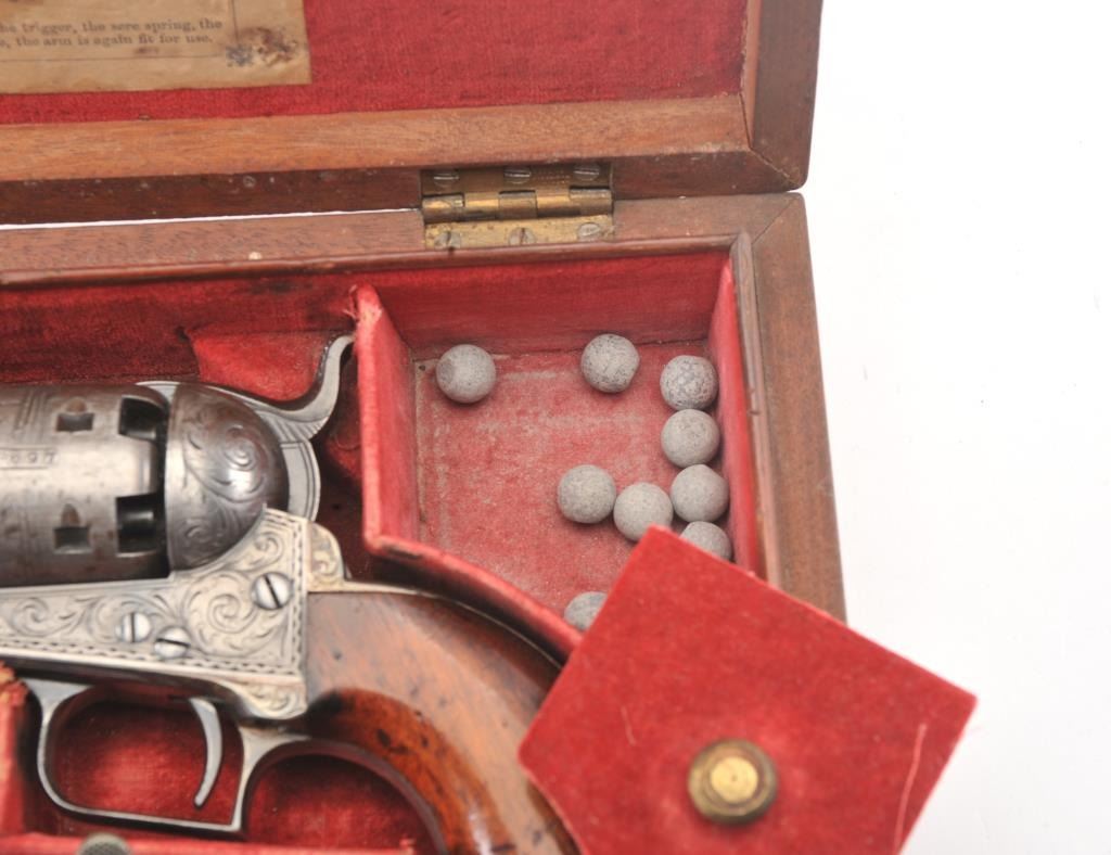 Colt 1851 Navy 1st Model Revolver Factory engraved with rare wedge over screw variation, S/N 697 and made for Crystal Palace exhibition. Among the rarest and most desirable of all engraved percussion colt experts estimate less than a dozen of the wedge over screw variation were produced likely for display at the Crystal Palace exhibition where Colt introduced the new 1851 Model Navy revolver. The subject revolver is engraved in the early open vine scroll motif and remains in very good plus condition with approximately 30%-50% original blue on the barrel that has aged evenly with sharp edges and good markings. The cylinder shows almost all of its scene with clear engagement dates and Ornsby signature. The cylinder is a gray patina with a few small areas of erosion and spotting from age. The frame, hammer and loading lever show 30%-50% early smoky gray case hardening with some light colors in the patina. The straps show most of the original silver plate which is thick and uncleaned. The grips are also very good plus with 75%-85% original varnish showing minor scratches, dings, mars and very small losses at the toes. The grips fit impeccably. Crisp and sharp markings with all matching serial numbers. Contained with an original English style partition case with label in the lid. The red lined velveteen interior is very good plus with minor aging, small tatters and normal impressions. The silver plated flask shows period inscription “Crystal Palace” in script. A good mold, nipple wrench and cap tin are included. Also an enameled pin which purportedly was gifted by Colt at the Crystal Palace exhibition is included with this lot.