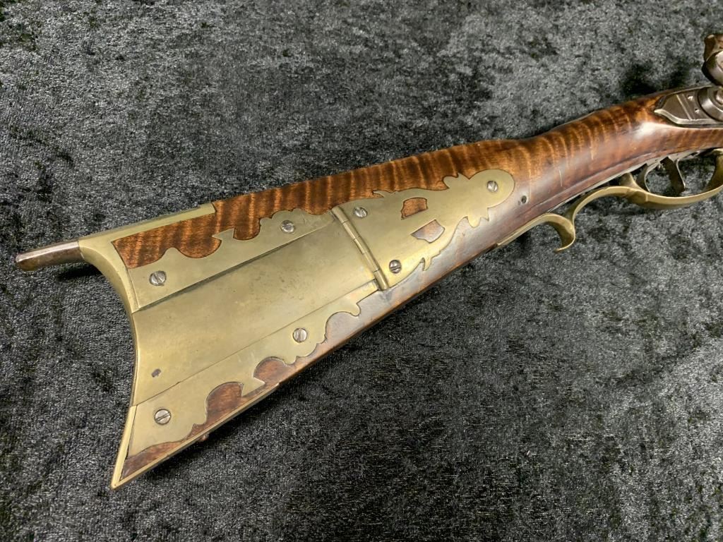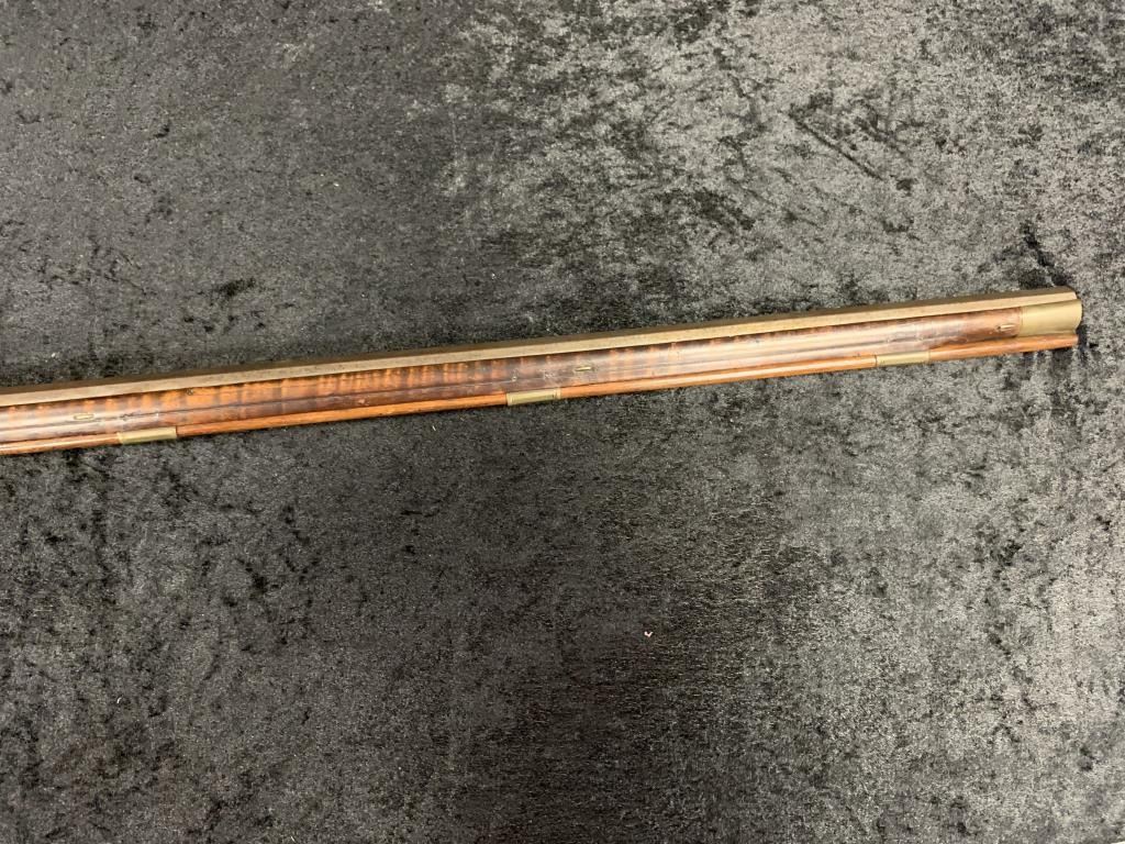Flintlock "Kentucky" style rifle signed "J.M." on the barrel in fancy script (Possibly Moll). Measures 57" overall with a 42" octagon barrel and approximately .42-.46 caliber rifled. A good quality reconversionwith stock refreshed and restored. Large pierced patch box. Double triggers with 2 screws in lock plate. Small silver inlays. The barrels are secured by pins. About 1820s. (Antique) Est.: $1500-$3000