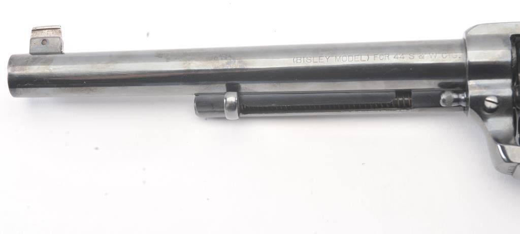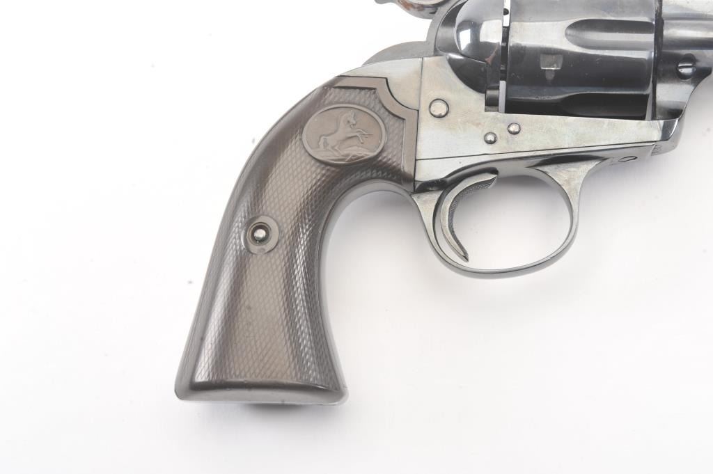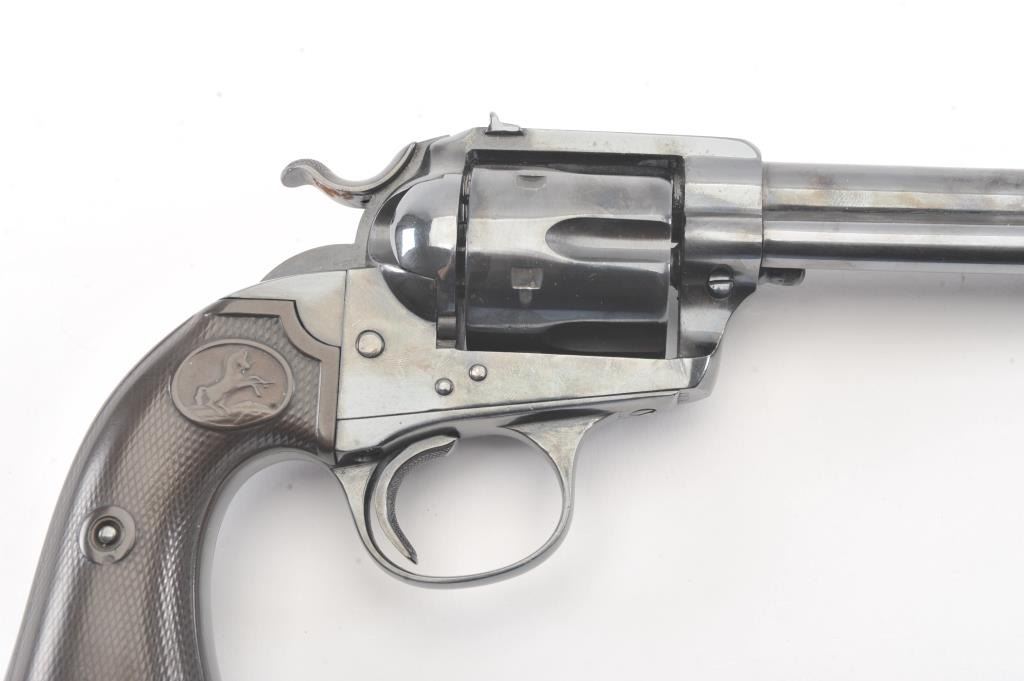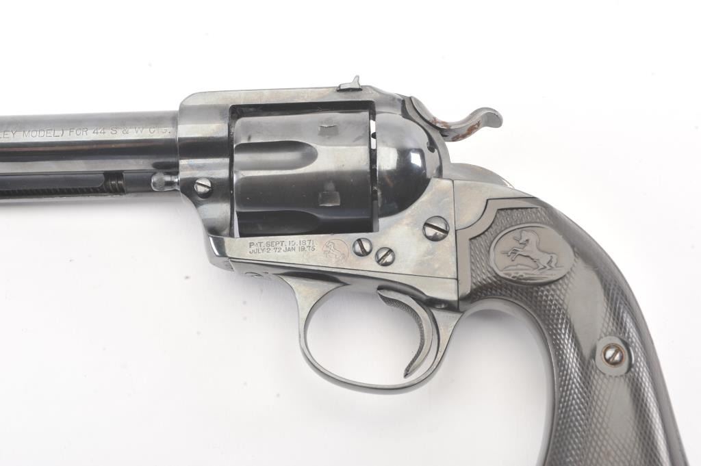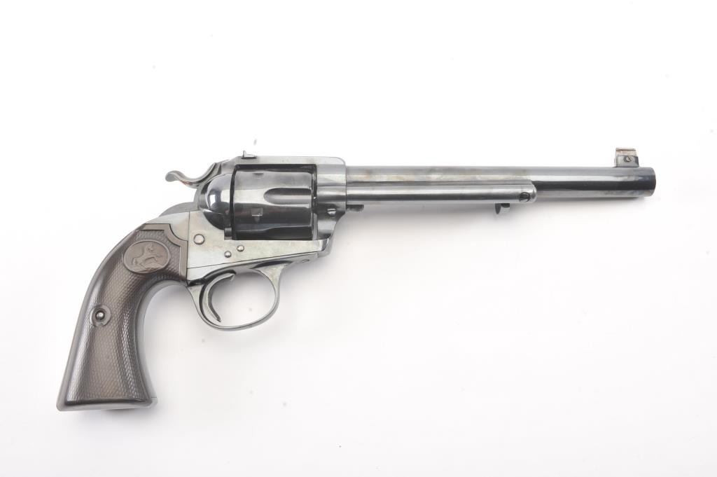 Colt Bisley Flat-Top Target Model SA revolver, .44 S&W caliber, Serial #166584. The pistol shows an old re-blued finish of which approximately 90%-95% remains. The grips show edge wear, the markings are lighton the edges but visible with some polishing evident. The front sight blade has been added, good action, worn but serviceable bore and all matching visible numbers. Only about 1,000 Flat-Tops were manufactured withonly 64 in the .44 S&W caliber. Est.: $2,000-$4,000. (Antique).