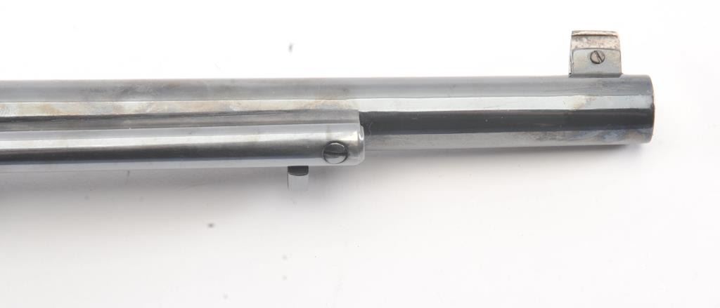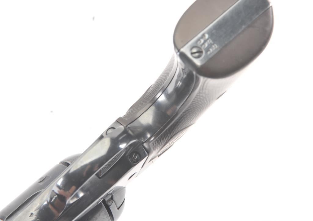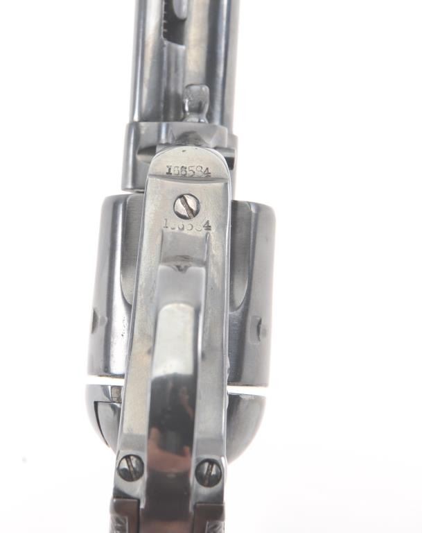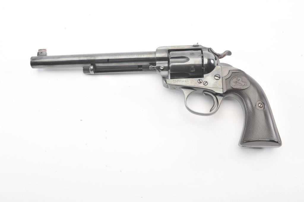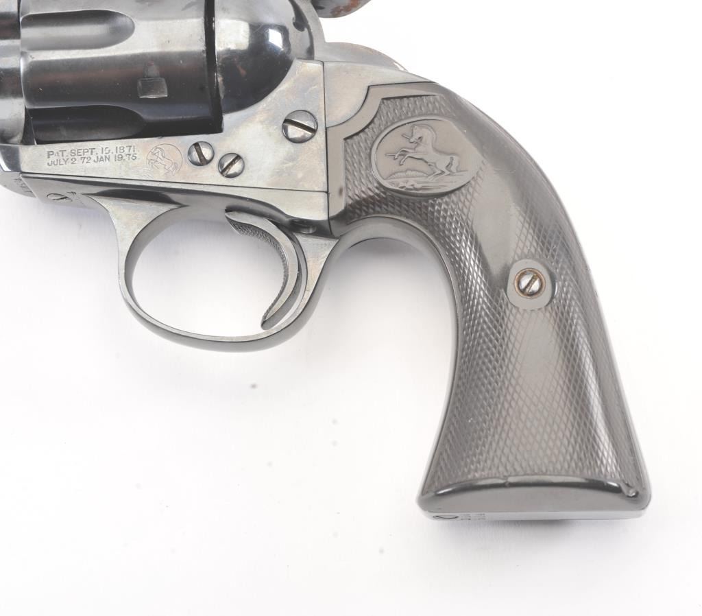 Colt Bisley Flat-Top Target Model SA revolver, .44 S&W caliber, Serial #166584. The pistol shows an old re-blued finish of which approximately 90%-95% remains. The grips show edge wear, the markings are lighton the edges but visible with some polishing evident. The front sight blade has been added, good action, worn but serviceable bore and all matching visible numbers. Only about 1,000 Flat-Tops were manufactured withonly 64 in the .44 S&W caliber. Est.: $2,000-$4,000. (Antique).