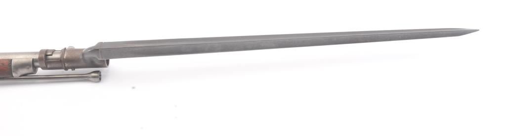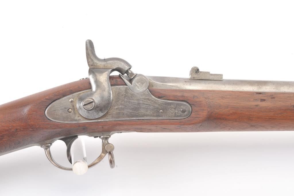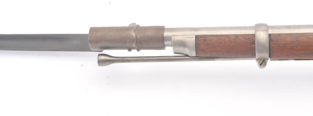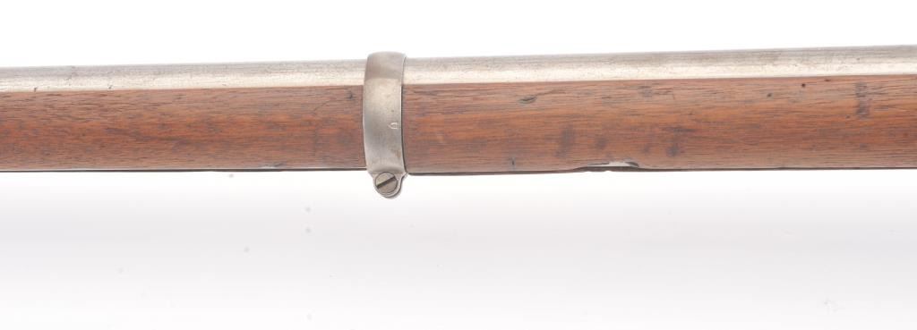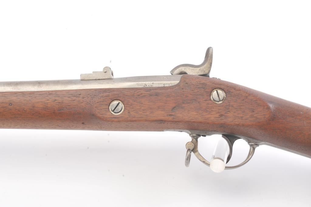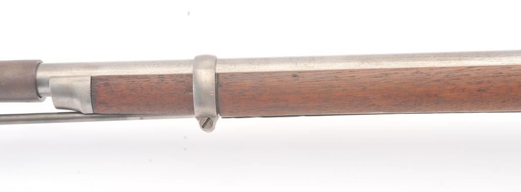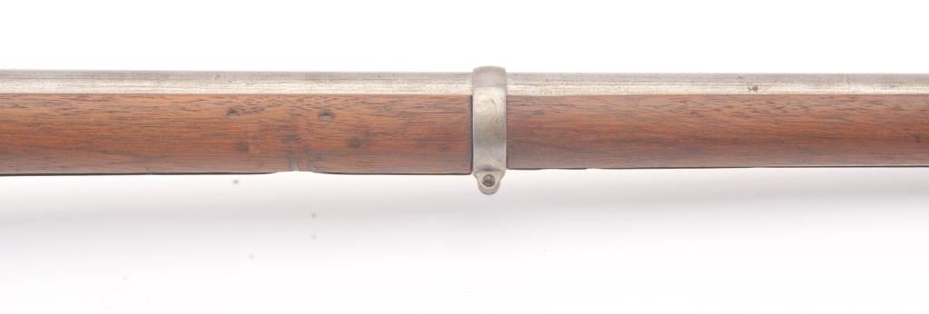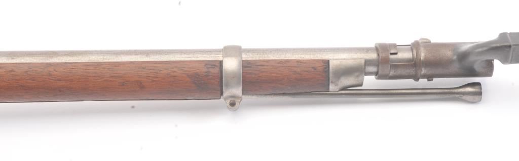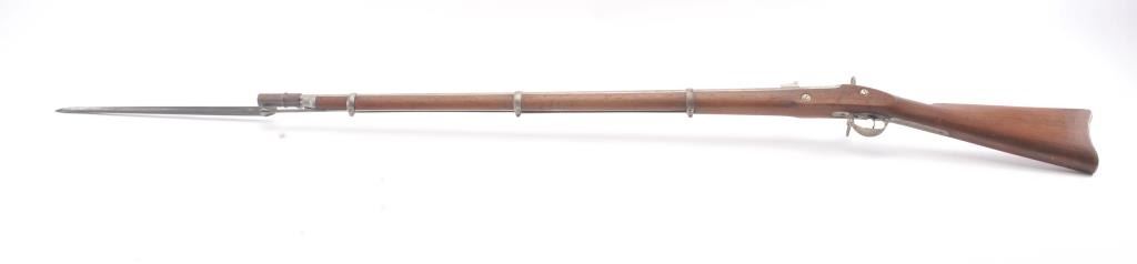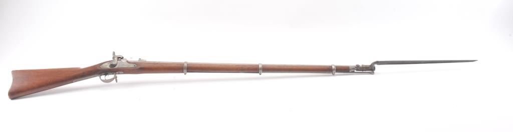 Colt Model 1861 Special musket in .58 caliber. This rifled musket is dated 1863 and shows a crisp “NJ” marking on the left side of the barrel indicating issue to the New Jersey State Militia. The musket is invery good overall condition with light surface erosion and minor cleaning to the National Armory bright finish. The wood is very good with minor light cleaning and a small compression or dent along the ram rodchannel. The lot includes the original socket bayonet and tulip head cleaning rod. The musket has sharp markings, a good action, bore and is in very good plus condition with strong rifling. This Civil War era Coltmusket is a solid 7 ½ on a 1-10 scale. Est.: $1,250-$2,500. (Antique).