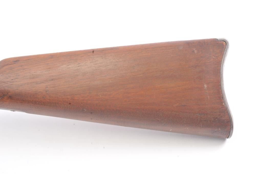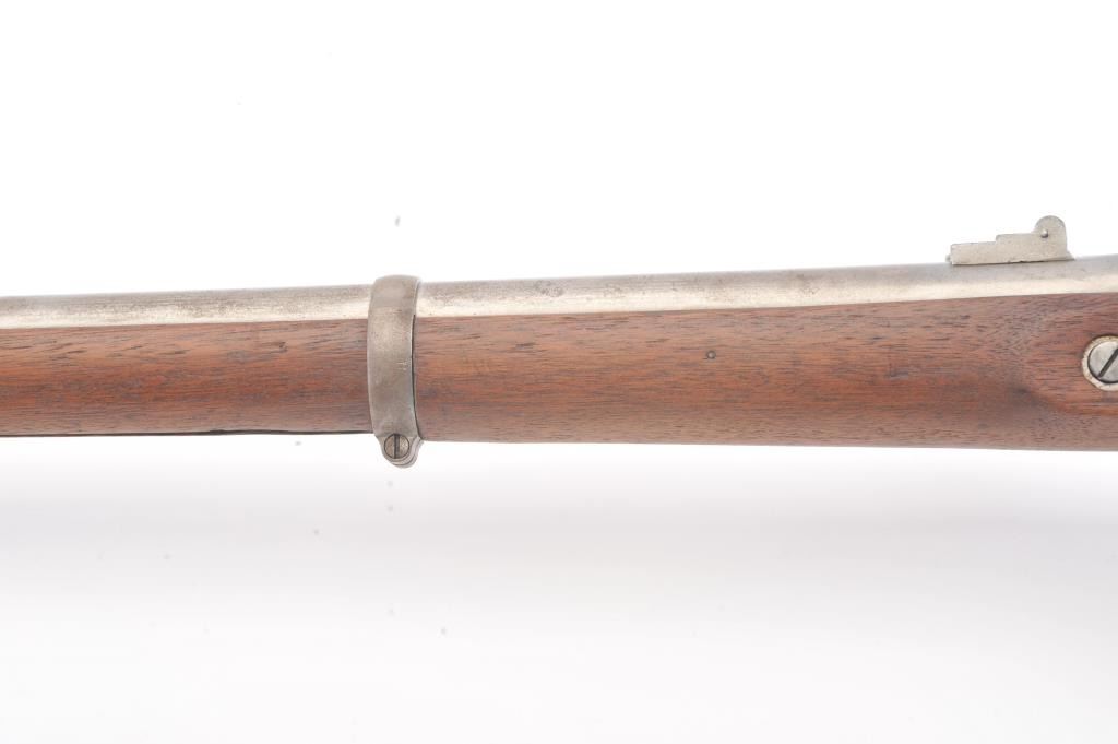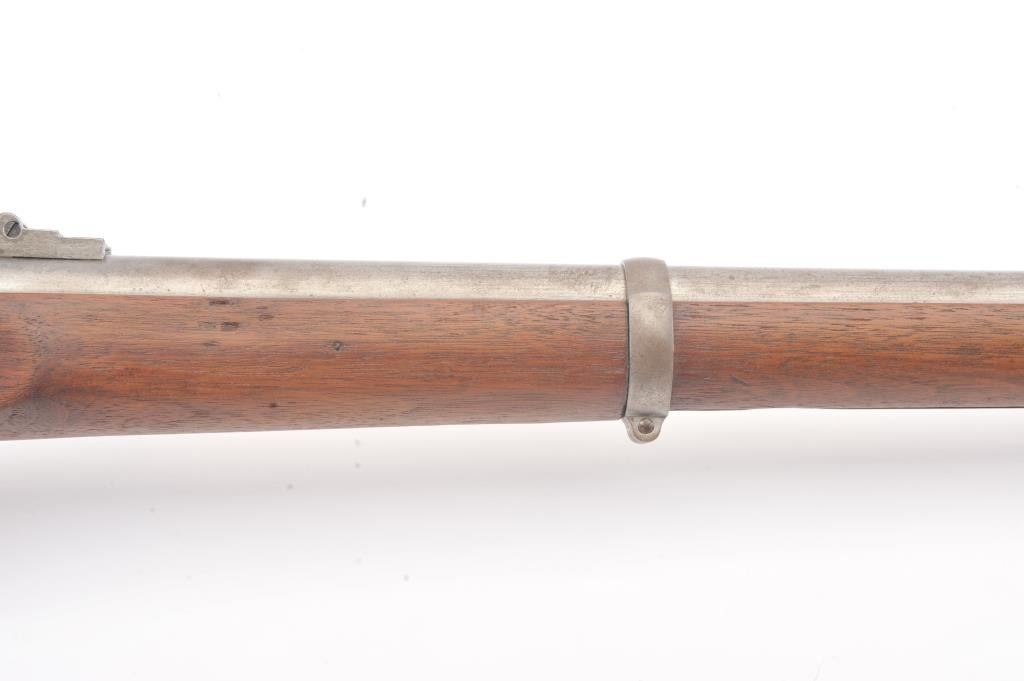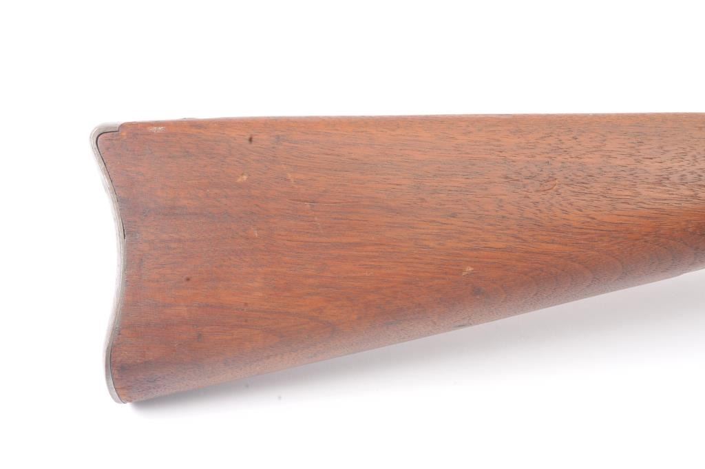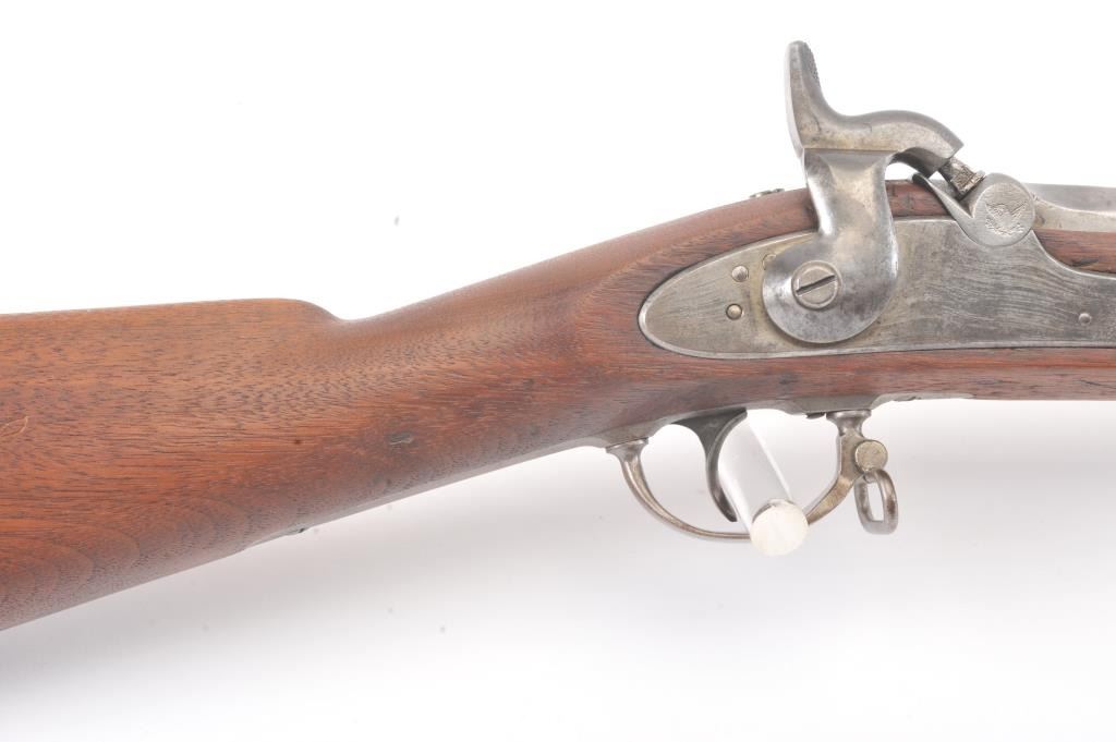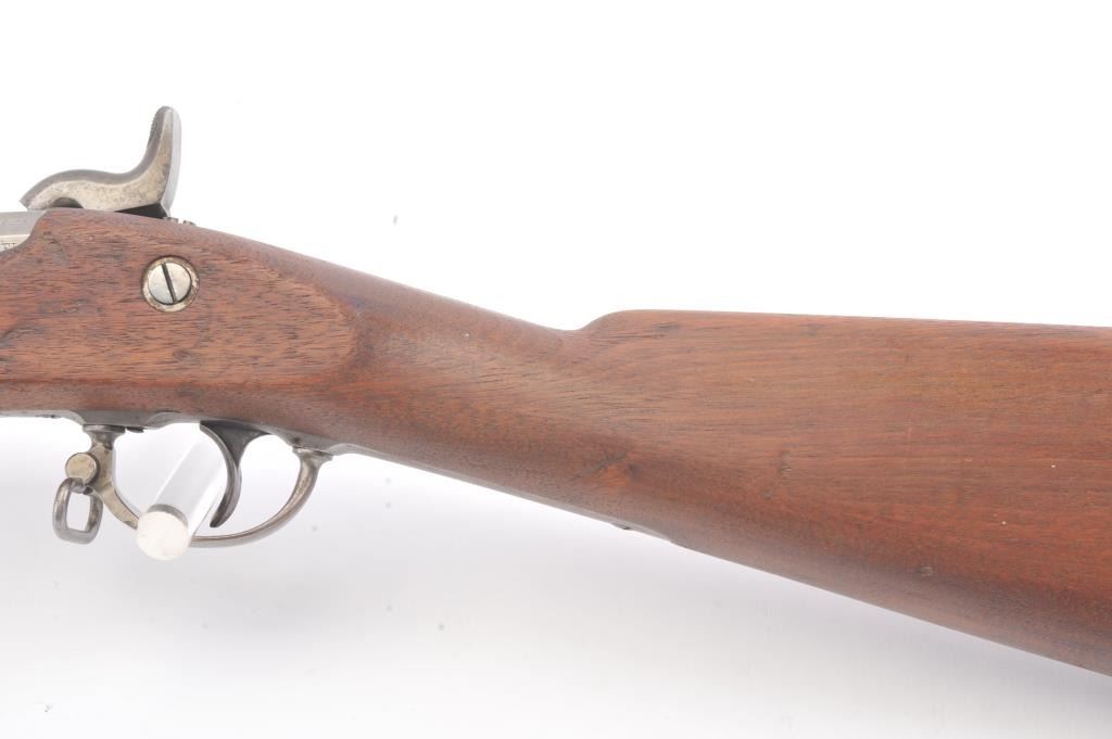 Colt Model 1861 Special musket in .58 caliber. This rifled musket is dated 1863 and shows a crisp “NJ” marking on the left side of the barrel indicating issue to the New Jersey State Militia. The musket is invery good overall condition with light surface erosion and minor cleaning to the National Armory bright finish. The wood is very good with minor light cleaning and a small compression or dent along the ram rodchannel. The lot includes the original socket bayonet and tulip head cleaning rod. The musket has sharp markings, a good action, bore and is in very good plus condition with strong rifling. This Civil War era Coltmusket is a solid 7 ½ on a 1-10 scale. Est.: $1,250-$2,500. (Antique).