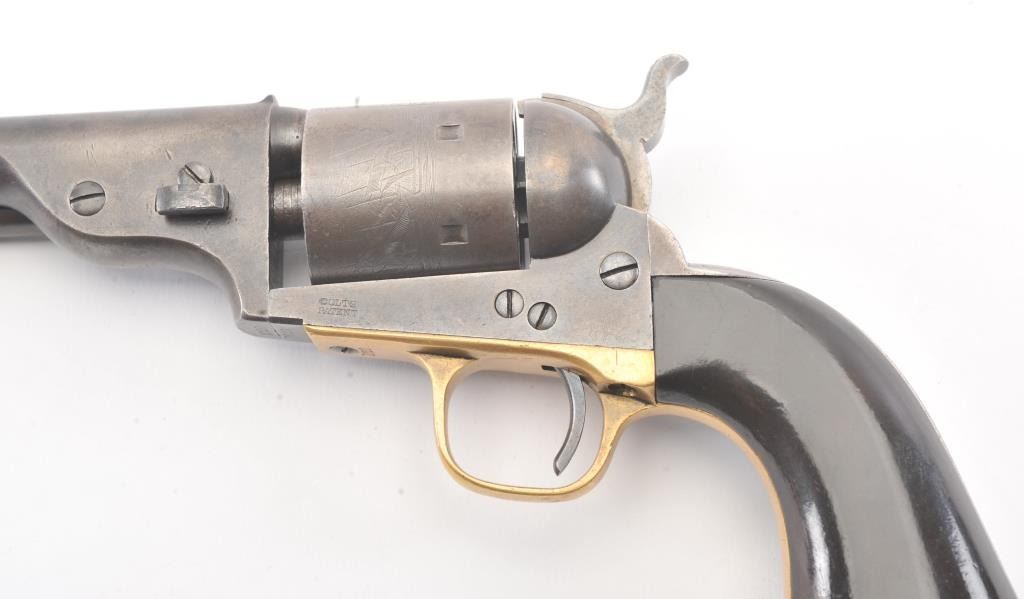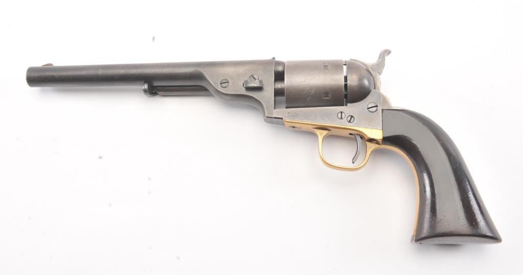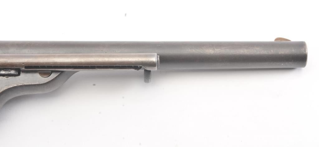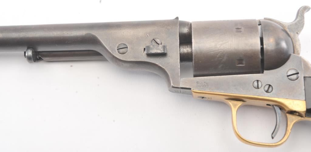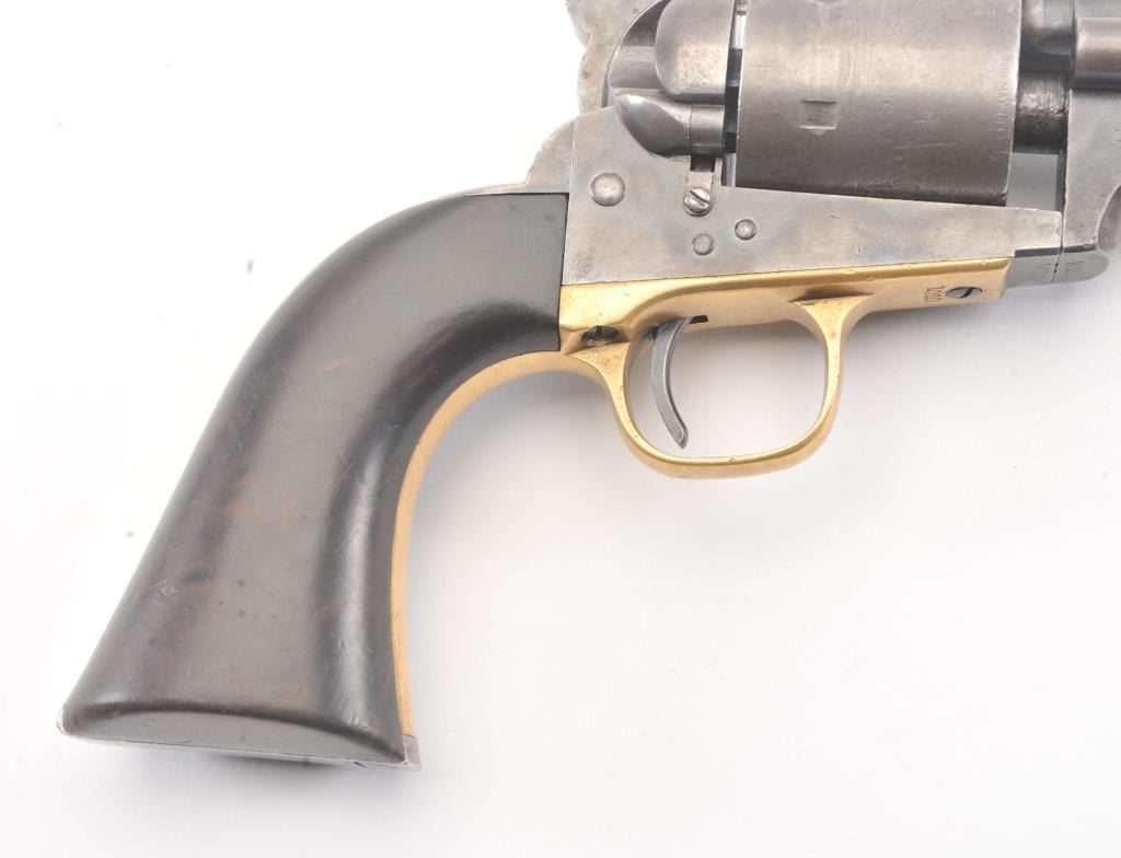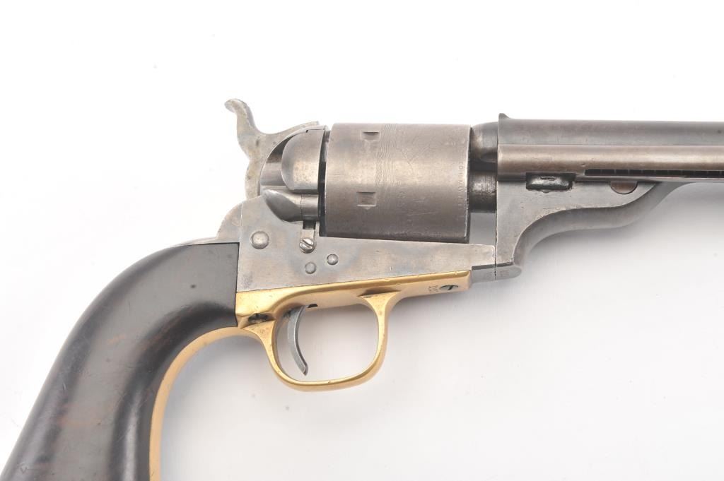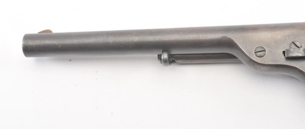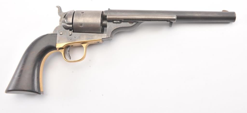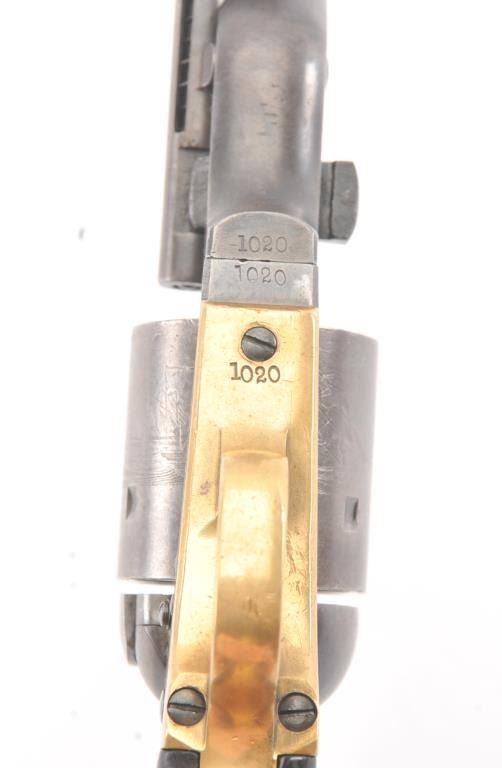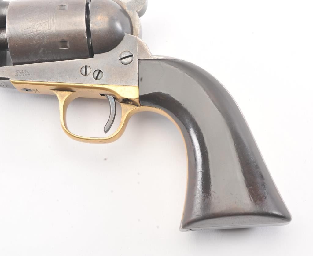 Colt 1872 “Open Top” Frontier era cartridge revolver, .44 Henry Rimfire caliber, Serial #1020. The pistol retains approximately 20%-30% of the blue and case colors mixing with patina with an 8” barrel and Army sizegrip. The cylinder shows most of the original scene with some light cleaning. The grips are good with 30%-50% of the varnish and slightly dark from oiling. All matching numbers, bright bore and a beautiful bluefiring pin along with brilliant case colors on the hammer. This is a very nice Open Top. Est.: $2500-5000 (Antique).