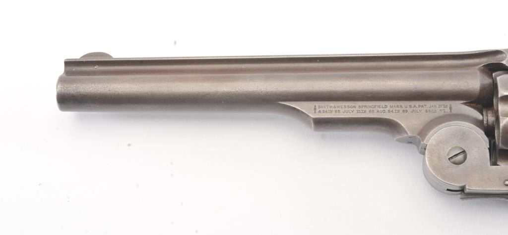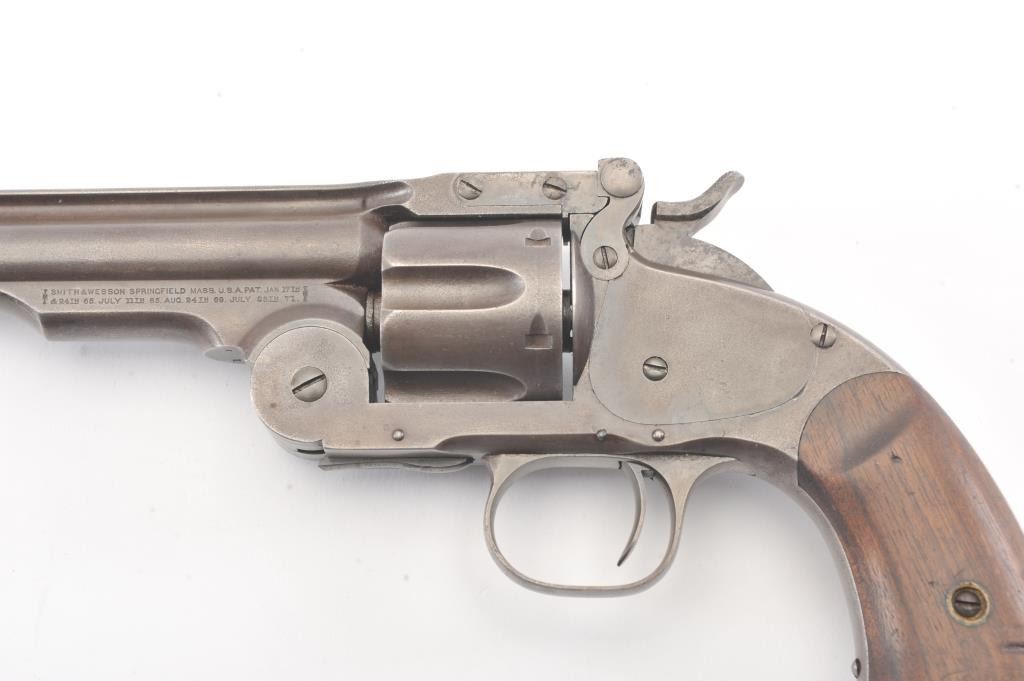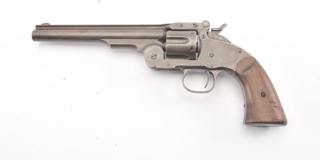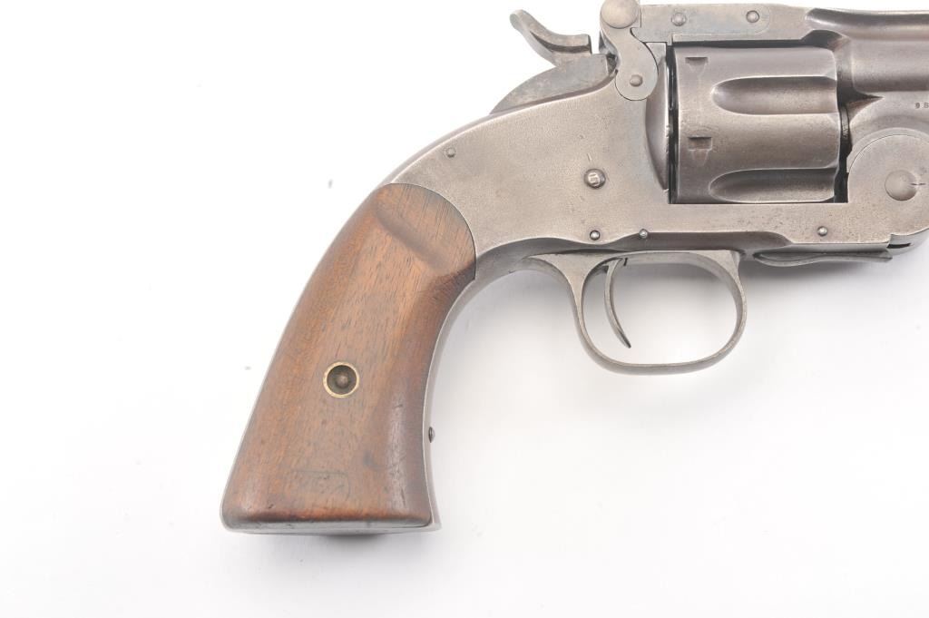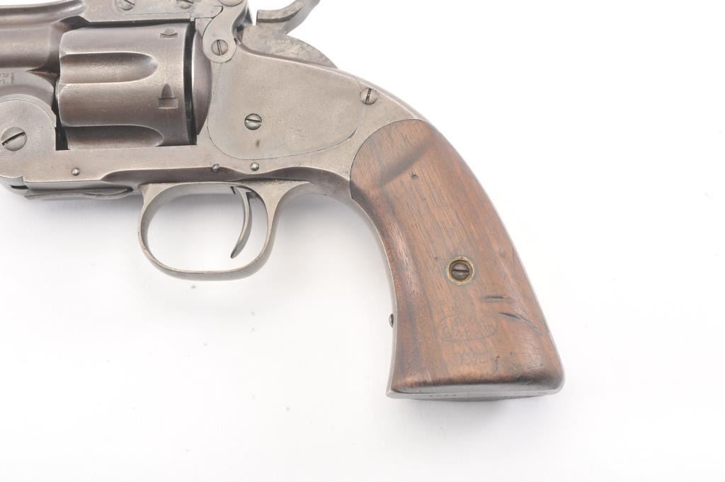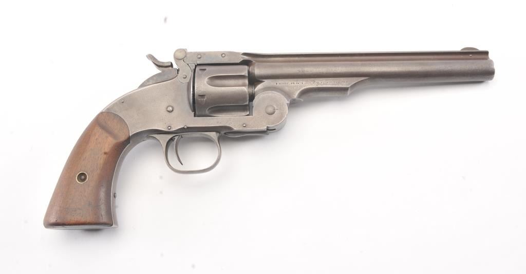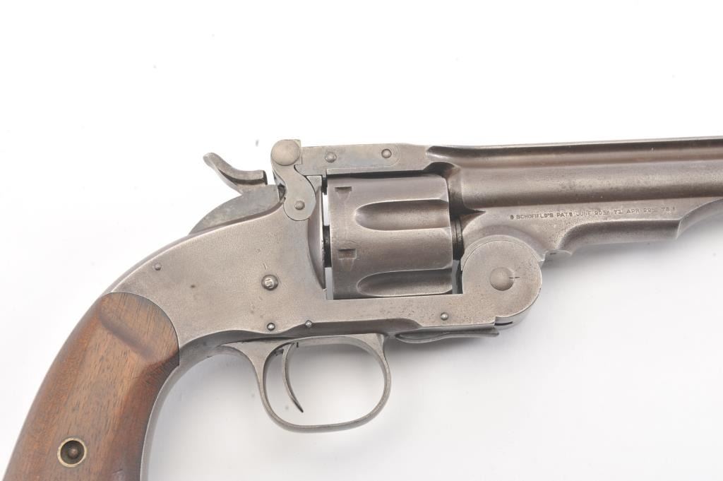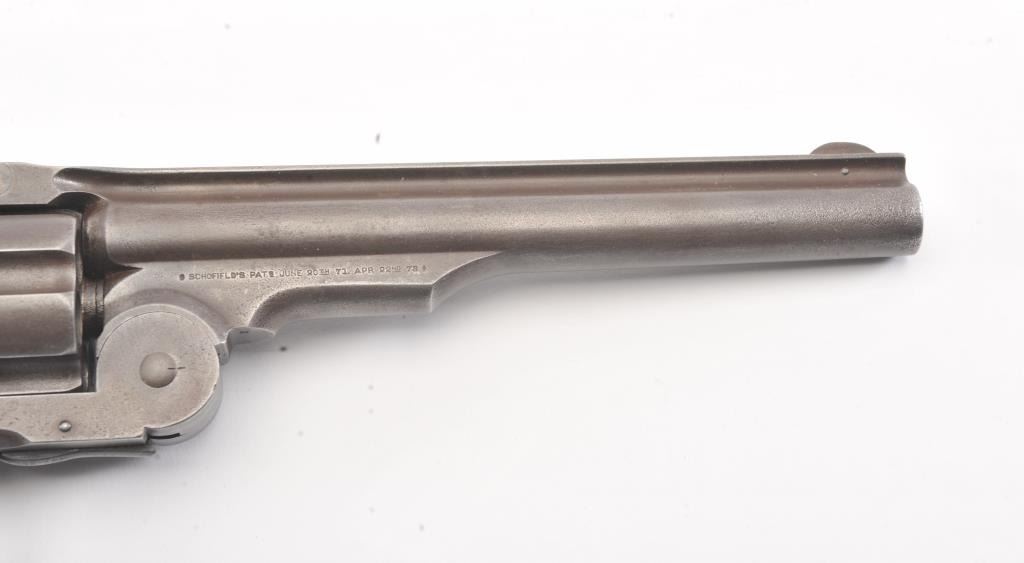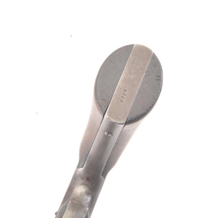 2nd Model Schofield, .45 caliber, Military Issue revolver, Serial #5902. The pistol shows good, smooth metal surfaces with faint traces of finish. The grips are good with faint cartouches on each side and date on the left. The pistol shows sharp markings, as issued with no reduction to the back of the cylinder, “E” and “P” inspections marks. A nice example. Est.: $2,500-$5,000. (Antique).