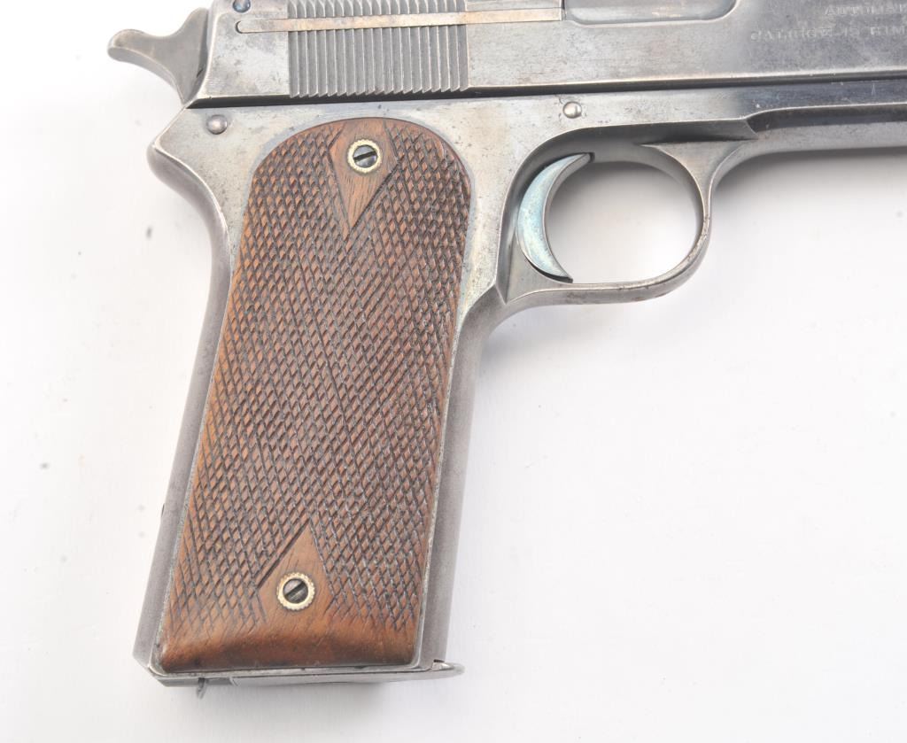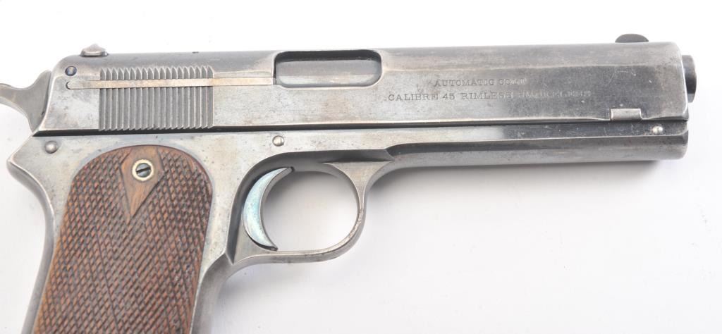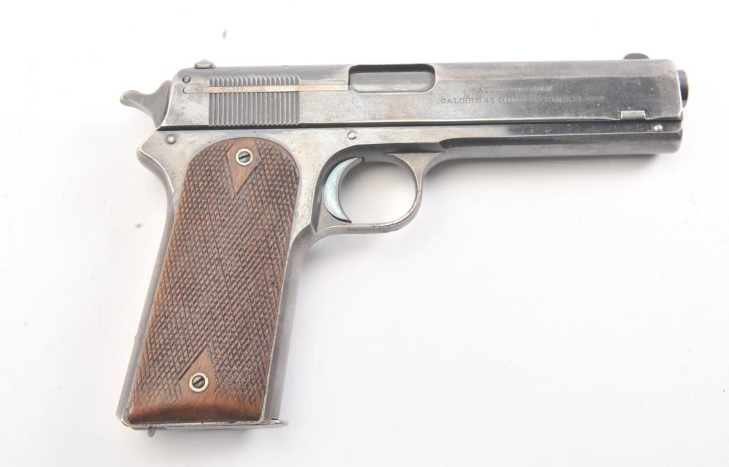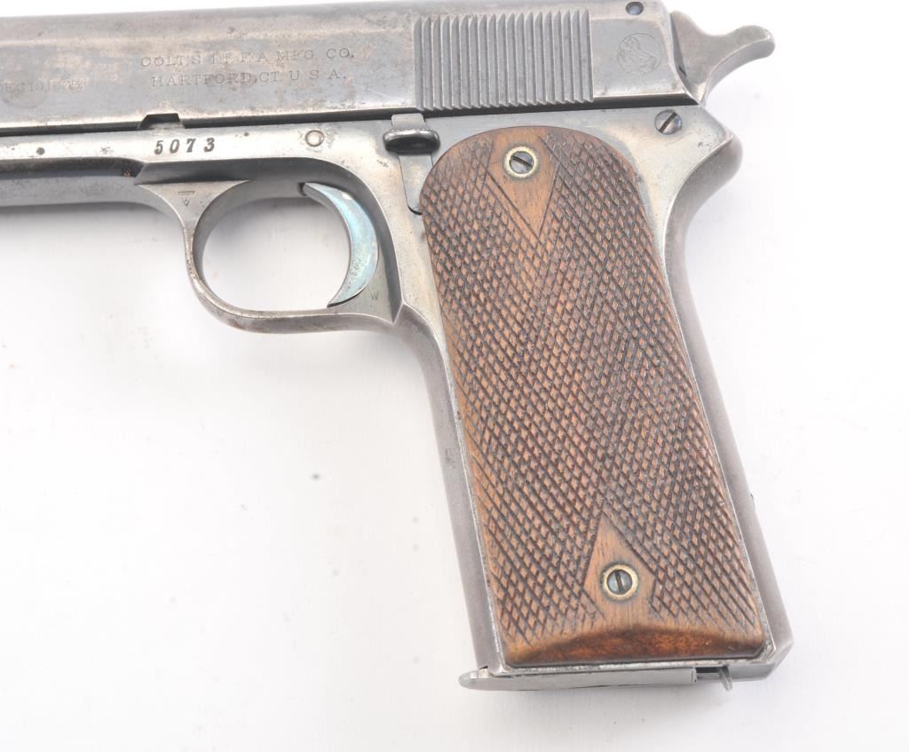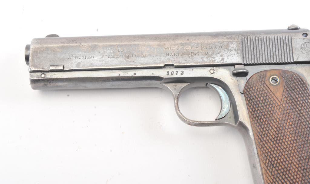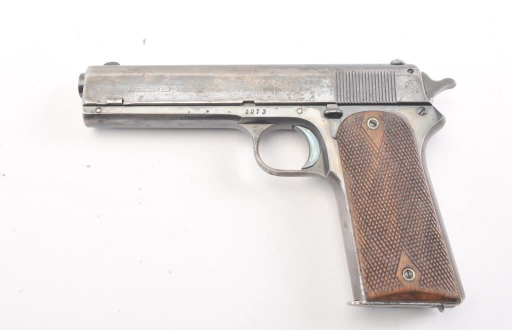 Colt Model 1905 semi-automatic pistol, .45 ACP caliber, Serial #5073. The pistol is in good original condition with 20%-30% original blue finish drifted and showing minor erosion with pitting. The grips are goodwith even wear, a correct magazine and most of the case color on the hammer. The pistol has a good bore and is mechanically sound. An honest type example of Colt’s 1st model .45, the Grand dad to the 1911. Est.:$2500-5000 (C+R/PPT).