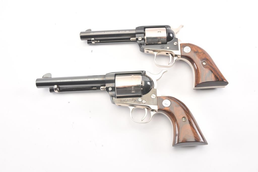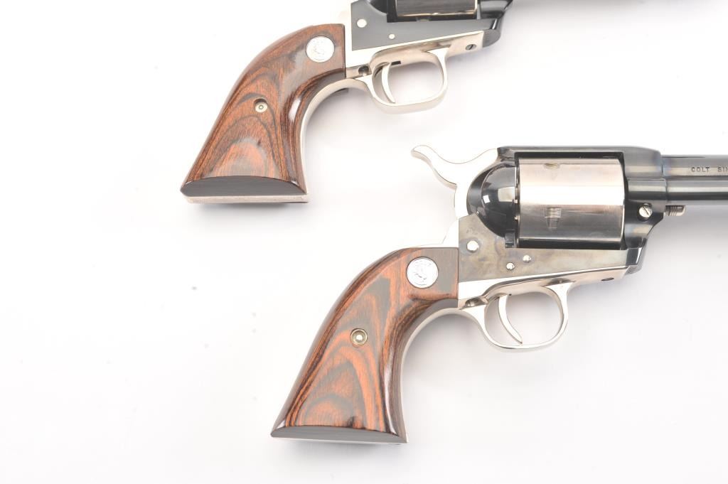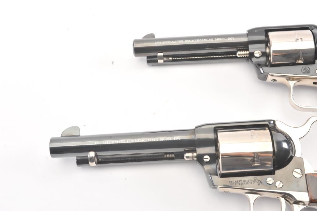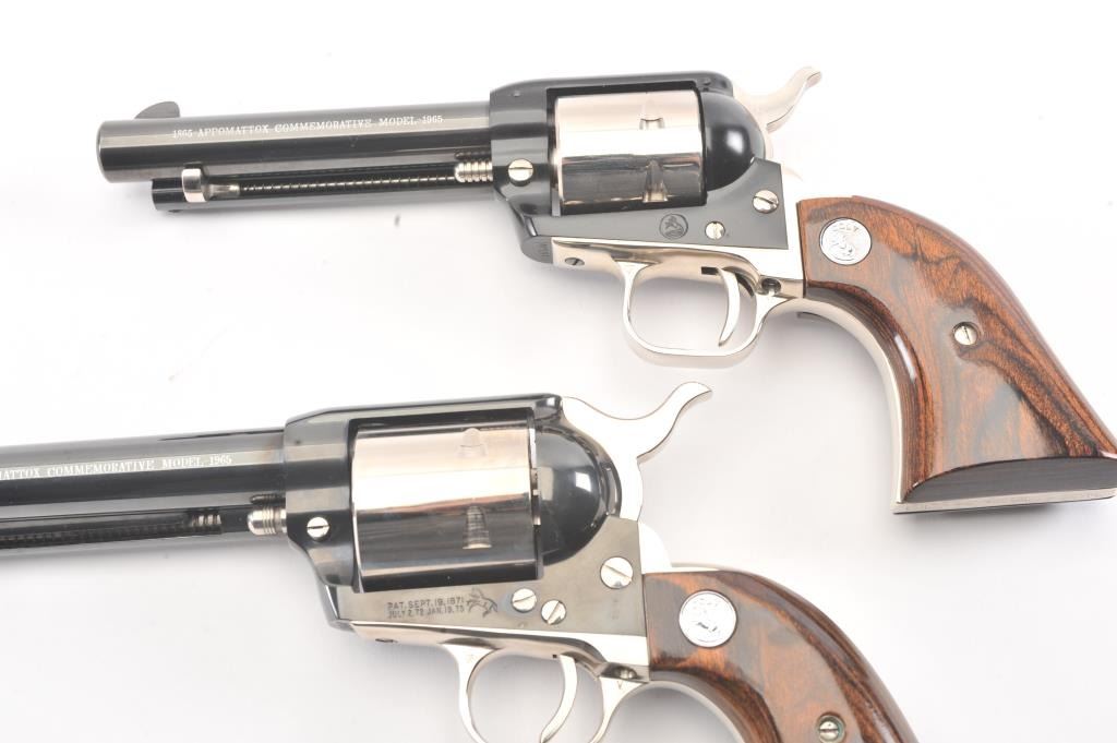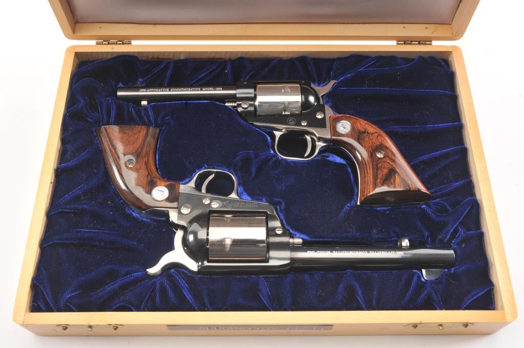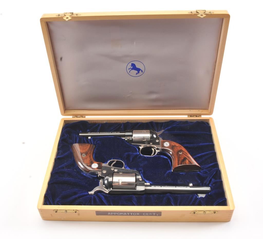 Colt Appomattox Centennial Commemorative set with Frontier Scout and SAA revolvers. The cased set includes a Frontier Scout, 4 ¾” barrel in .22 L.R. caliber, Serial #0168AK and a Single Action Army with a 5 ½” barrelin .45 Long Colt caliber, Serial #0168AP. The Scout is nickel plated, with Midnight blue barrel, frame, back strap, ejector rod tube and tube screw. Both pistols feature cylinders which are non-fluted and haveinscriptions reading, APPOMATTOX COMMEMORATIVE MODEL-1965 on the left side of the barrel, wiped in silver. The Single action is also finished with nickel plating with the other parts done in Royal blue.The grips on both models are laminated rosewood with nickel plated Colt medallions. The case is blonde finished wood with a Grant and Lee motif branded onto the lid, with a blue Rampant Colt motif. The interior is lined with blue velvet in the bottom and grey satin in the lid, with a blue Rampant Colt motif. Production of the sets began in 1965 with a limited production of 250 sets. The pistols are in excellent overall
