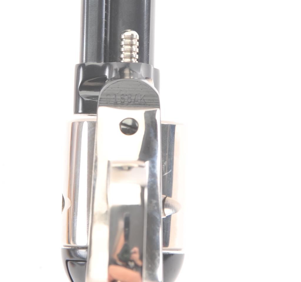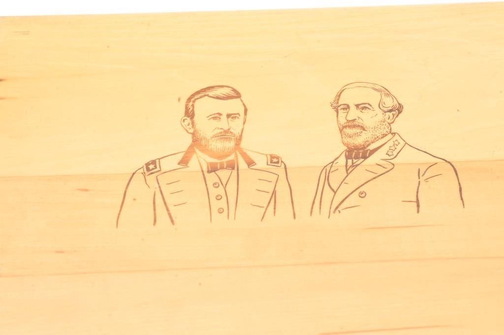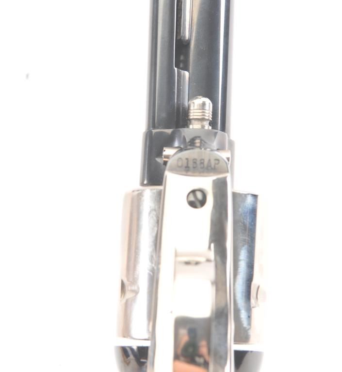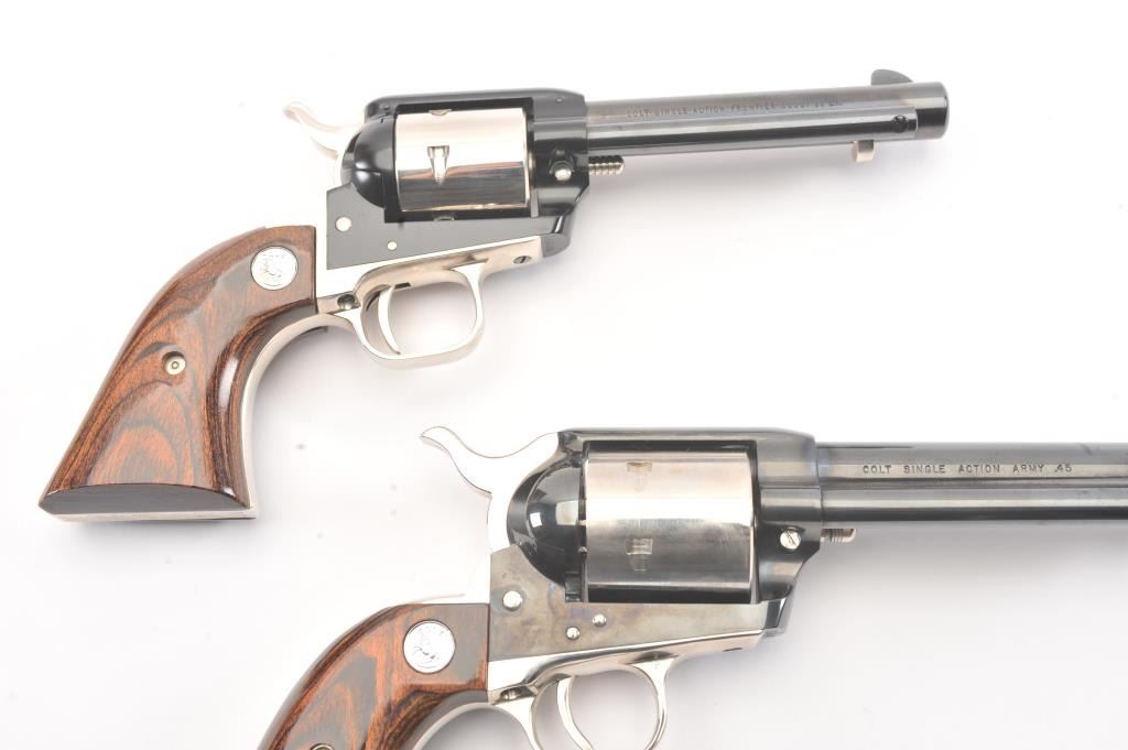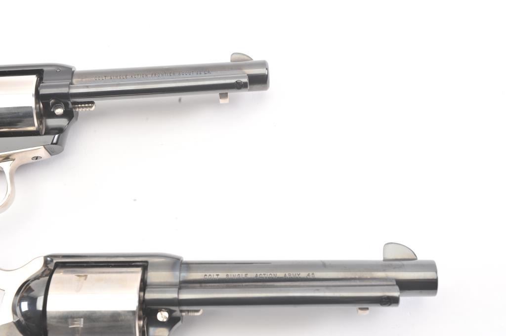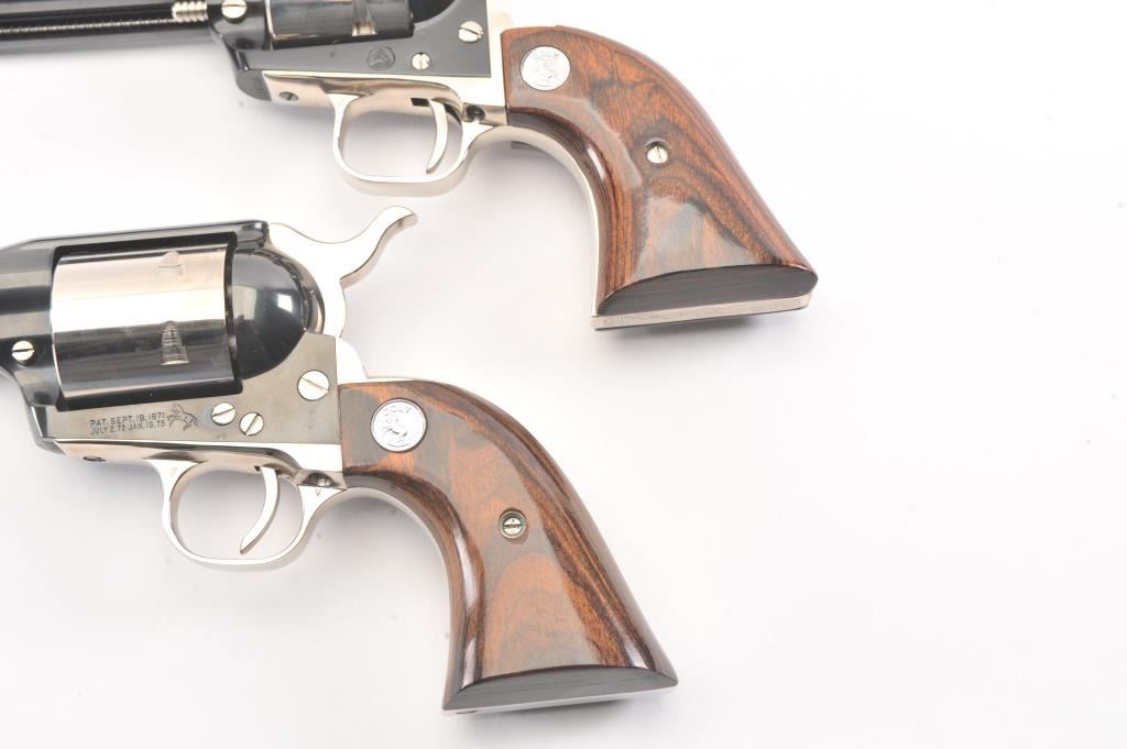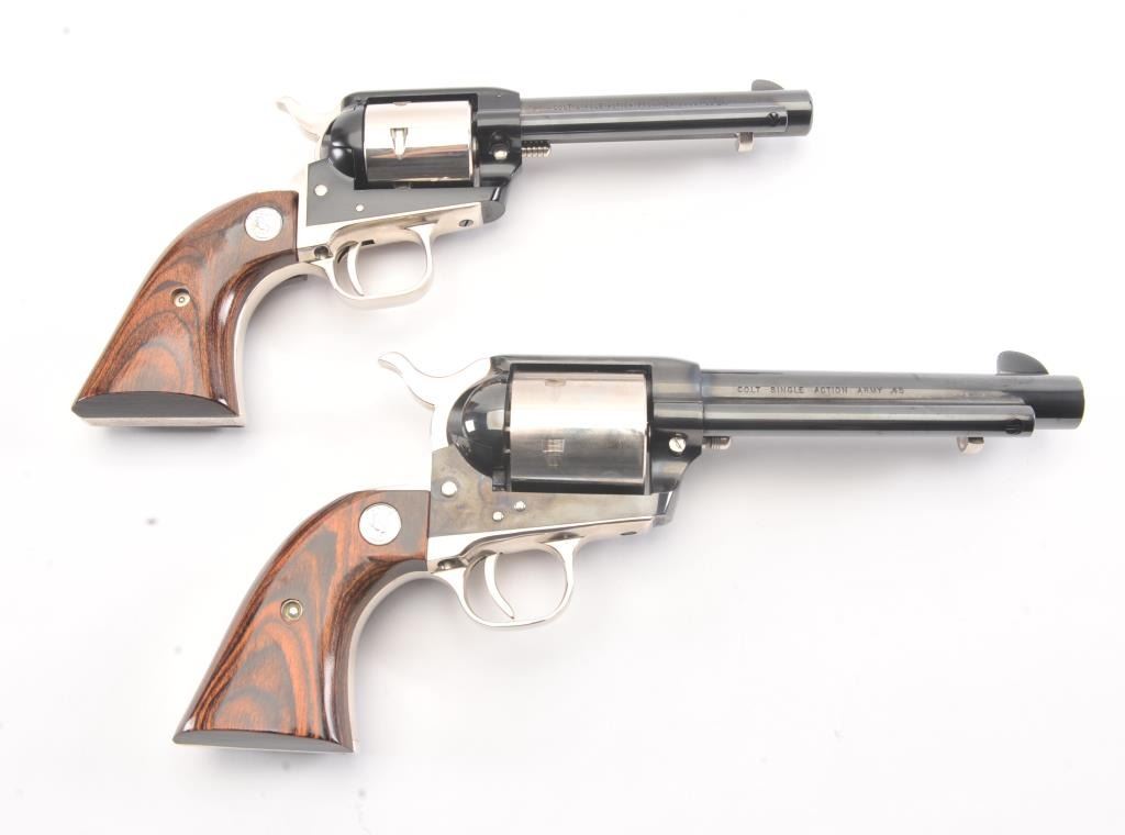 Colt Appomattox Centennial Commemorative set with Frontier Scout and SAA revolvers. The cased set includes a Frontier Scout, 4 ¾” barrel in .22 L.R. caliber, Serial #0168AK and a Single Action Army with a 5 ½” barrelin .45 Long Colt caliber, Serial #0168AP. The Scout is nickel plated, with Midnight blue barrel, frame, back strap, ejector rod tube and tube screw. Both pistols feature cylinders which are non-fluted and haveinscriptions reading, APPOMATTOX COMMEMORATIVE MODEL-1965 on the left side of the barrel, wiped in silver. The Single action is also finished with nickel plating with the other parts done in Royal blue.The grips on both models are laminated rosewood with nickel plated Colt medallions. The case is blonde finished wood with a Grant and Lee motif branded onto the lid, with a blue Rampant Colt motif. The interior is lined with blue velvet in the bottom and grey satin in the lid, with a blue Rampant Colt motif. Production of the sets began in 1965 with a limited production of 250 sets. The pistols are in excellent overall