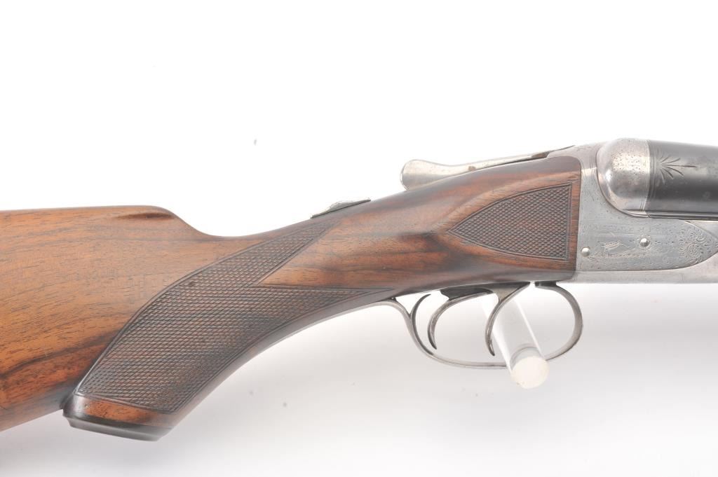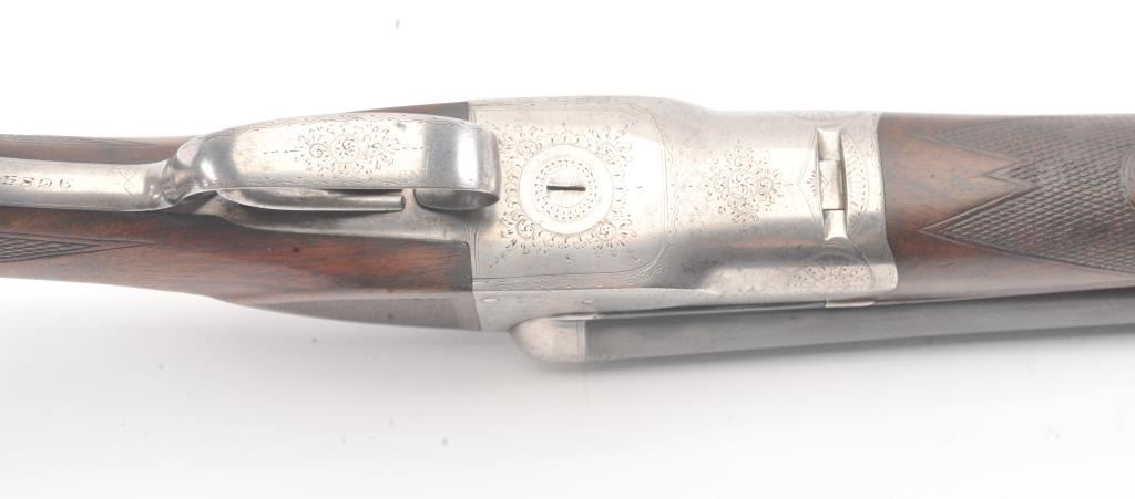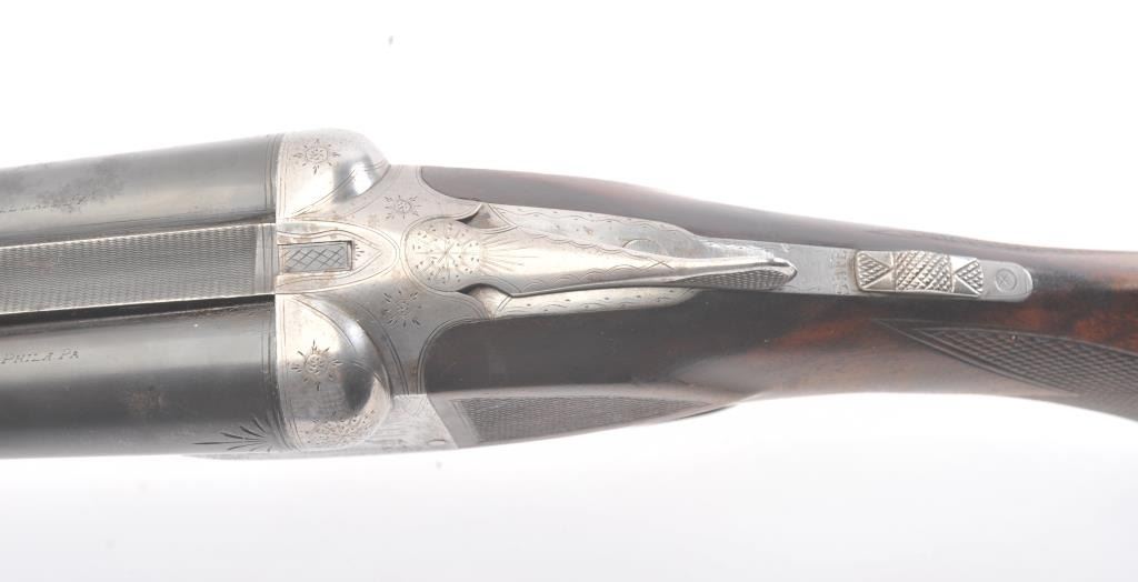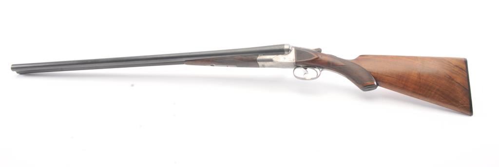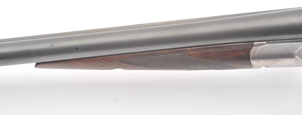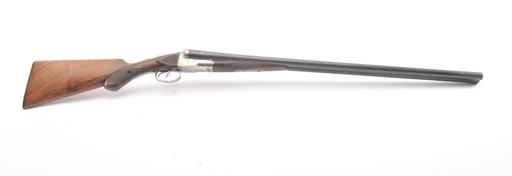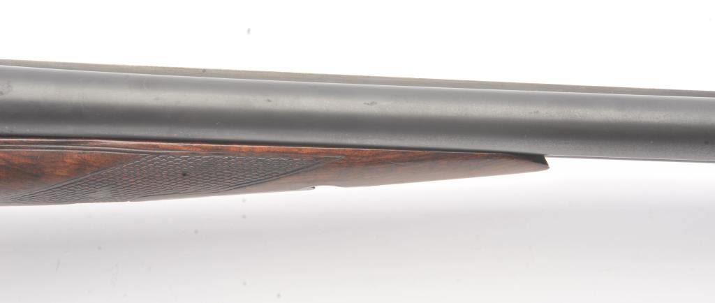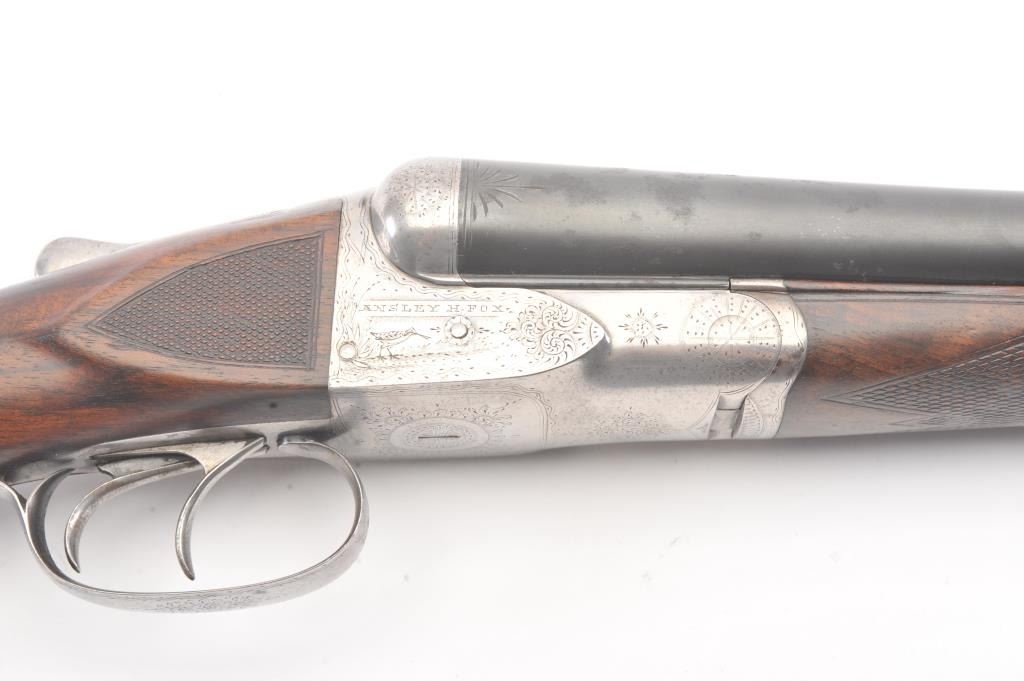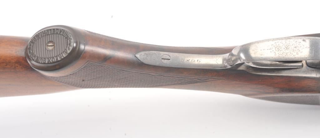 Ansley H. Fox Side by Side shotgun, 12 gauge, Serial #9684. The shotgun is in very good to nearly fine overall condition with 30” barrels with a full-length filed rib with a brass bead front sight. The barrels retainthe majority of the blue finish, marked Krupp Fluid steel at the breech. The receiver is in the white with light engraving of scroll and game birds. The safety is at the tang with double triggers. The finely checkeredWalnut stock is in very good condition with a Deeley fore end release, pistol grip and a plastic butt plate providing a 14 ½” LOP to the front trigger. The bores are good, the action is crisp and the markings are sharp on this desirable Fox. Est.: $900-$1,800. (C+R).