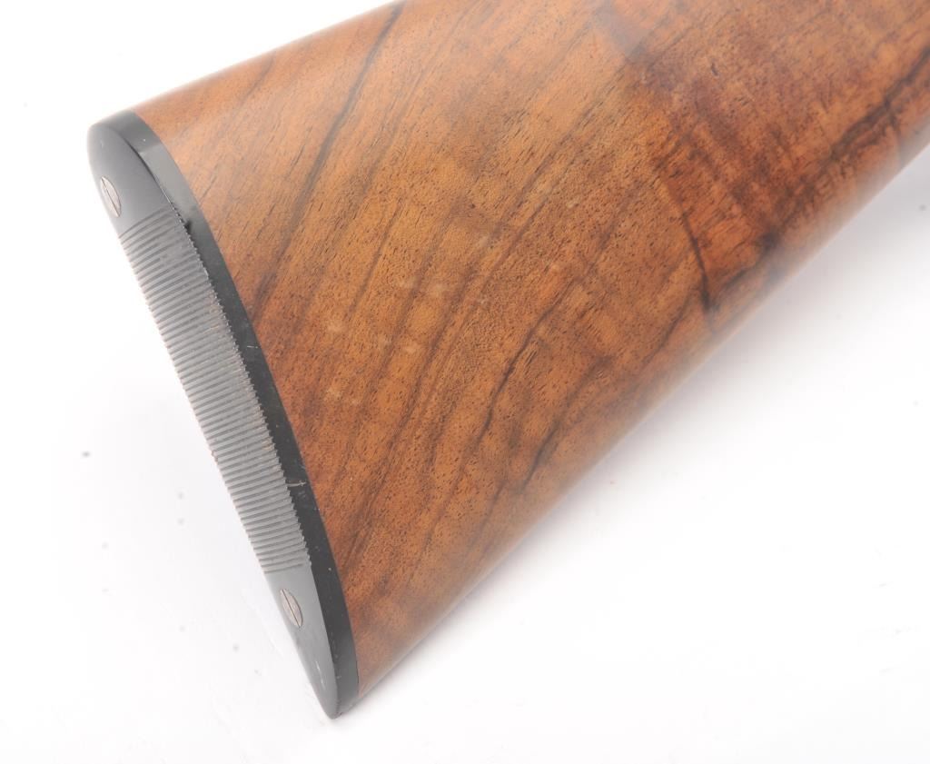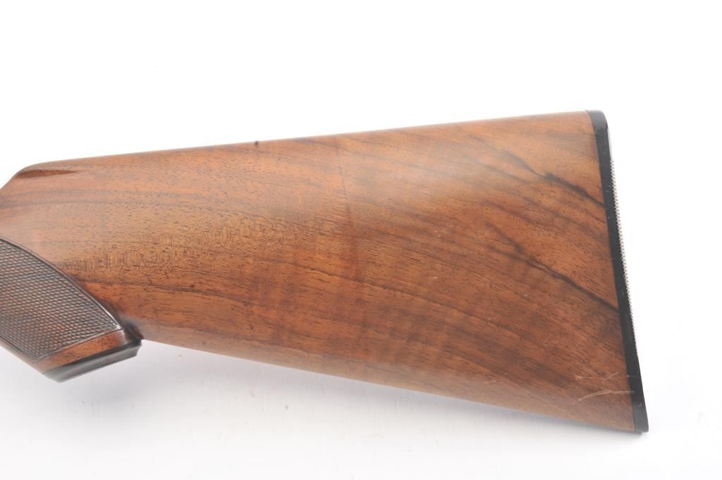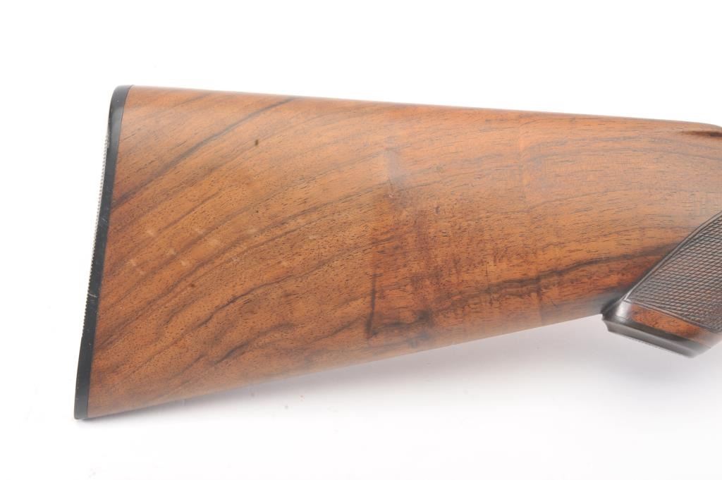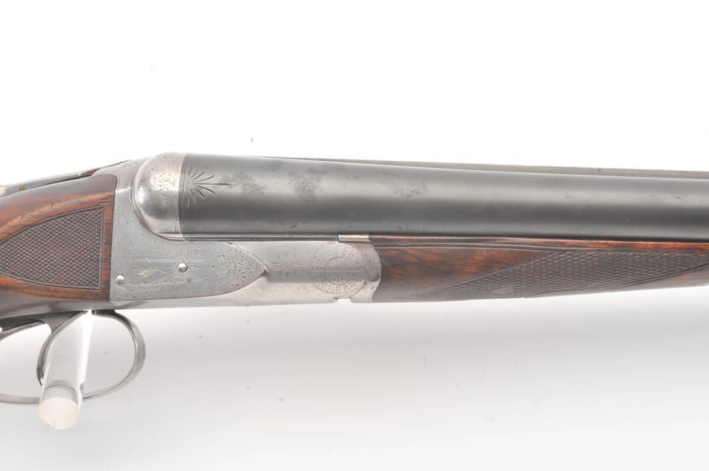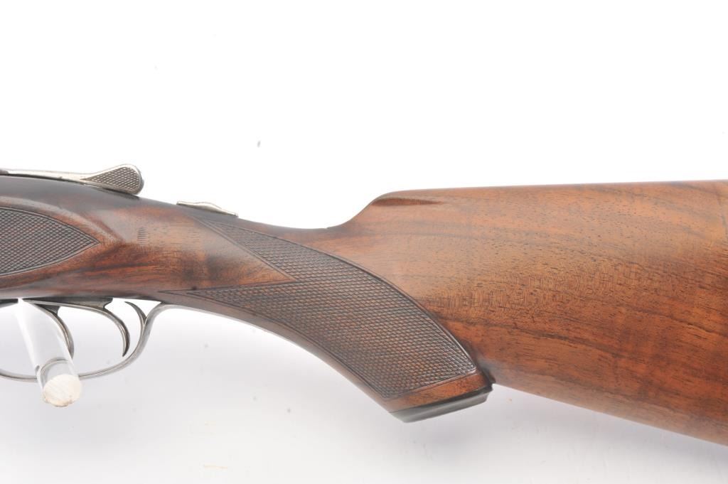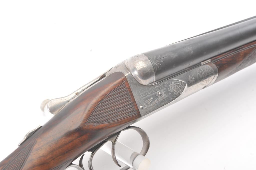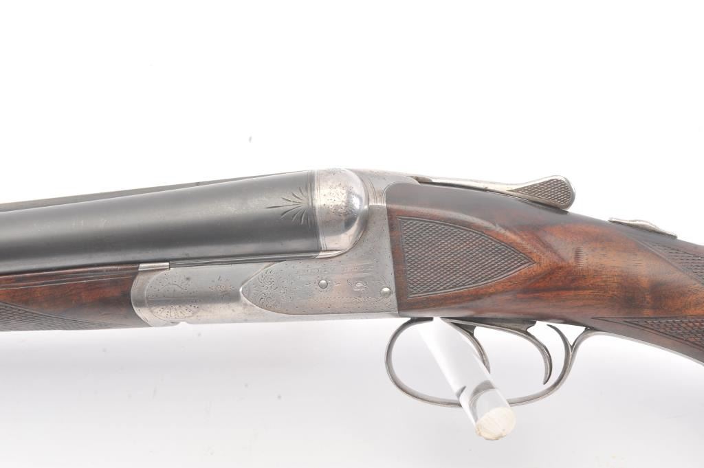 Ansley H. Fox Side by Side shotgun, 12 gauge, Serial #9684. The shotgun is in very good to nearly fine overall condition with 30” barrels with a full-length filed rib with a brass bead front sight. The barrels retainthe majority of the blue finish, marked Krupp Fluid steel at the breech. The receiver is in the white with light engraving of scroll and game birds. The safety is at the tang with double triggers. The finely checkeredWalnut stock is in very good condition with a Deeley fore end release, pistol grip and a plastic butt plate providing a 14 ½” LOP to the front trigger. The bores are good, the action is crisp and the markings are sharp on this desirable Fox. Est.: $900-$1,800. (C+R).