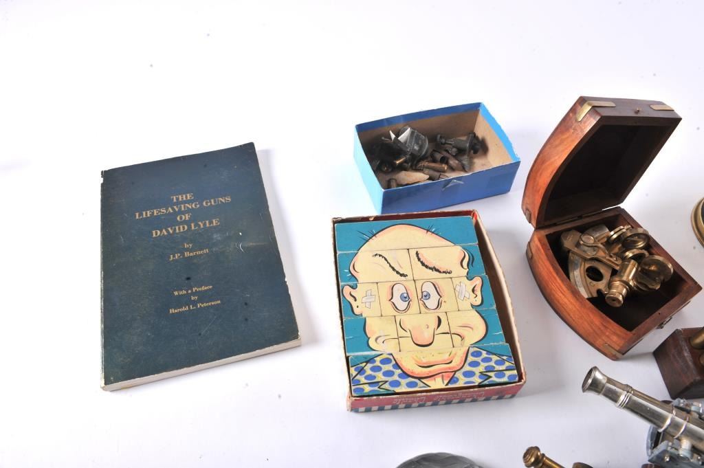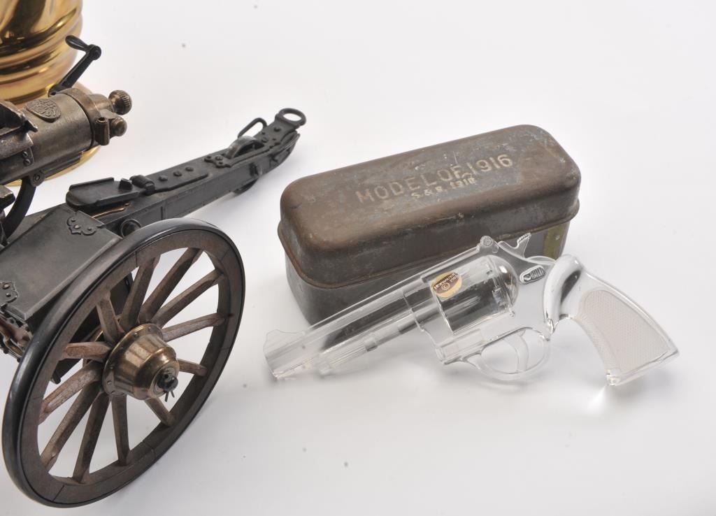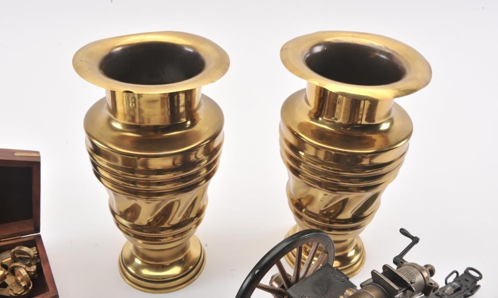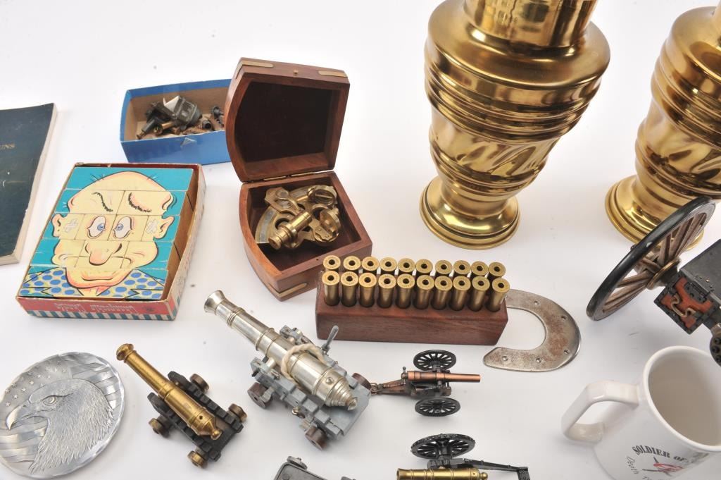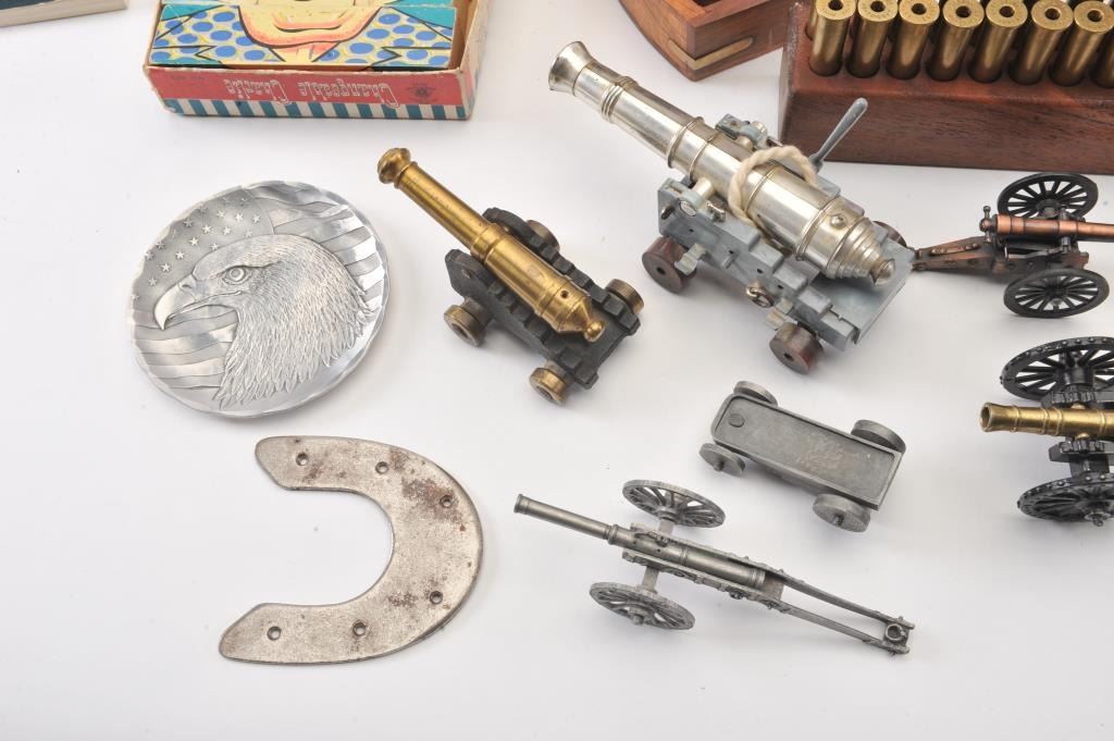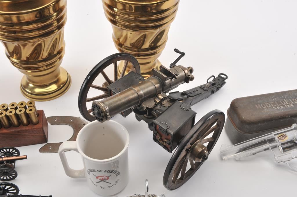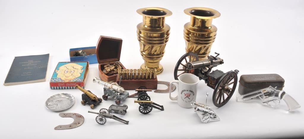 Misc. lot of small desktop size field pieces, cannons, a wood block containing 20 un-primed .45-70 caliber empty brass, a Model of 1916 tin can and a “Ross/London” marked small brass sexton (approximately 4” x 4”overall) contained in a hardwood carry case; also two brass urns, each approximately 12” in height. Est.: $300-$600.