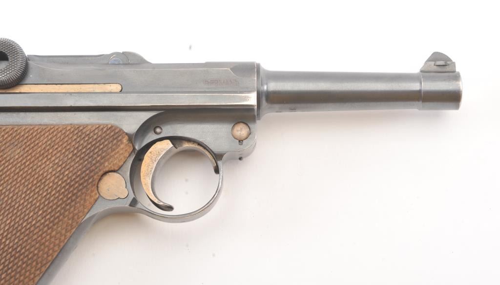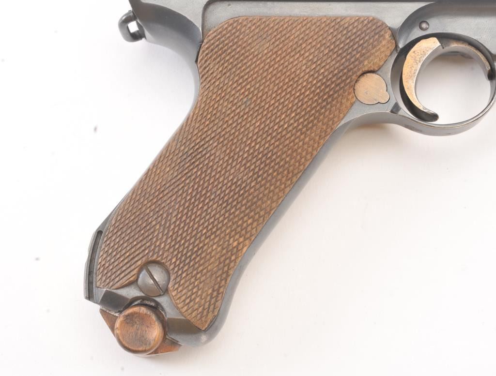 1920 Commercial Luger .30 caliber in near fine original condition, S/N 7092. Export marked Germany. 95%-98% original blue with most straw finish on small parts. The grips are almost fine with minor bumps and dents.Bright bore and pristine interior. Matching wood bottom mag. A strong 9+ on a 1-10 scale. (C&R/PPT) Est.: $750-$1500